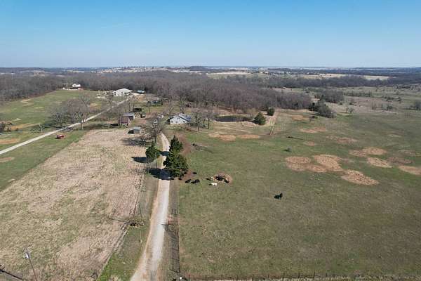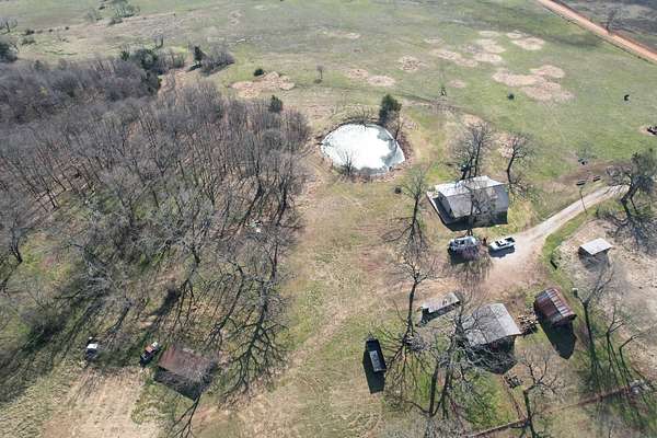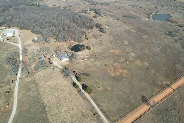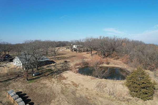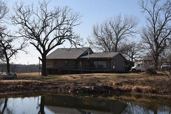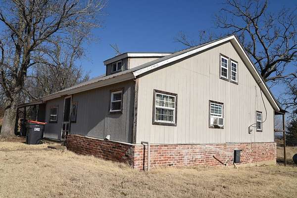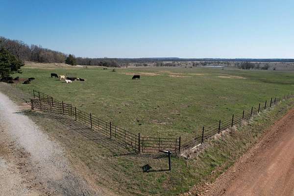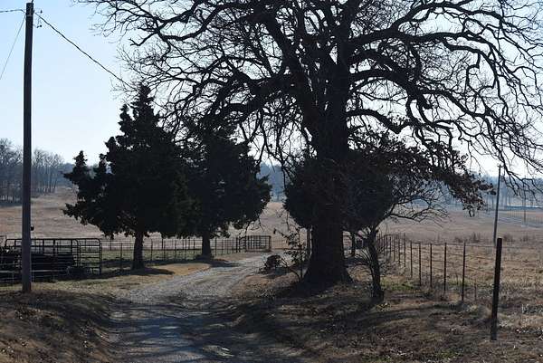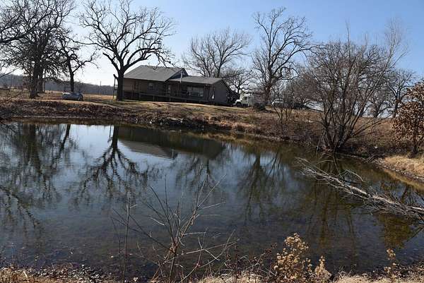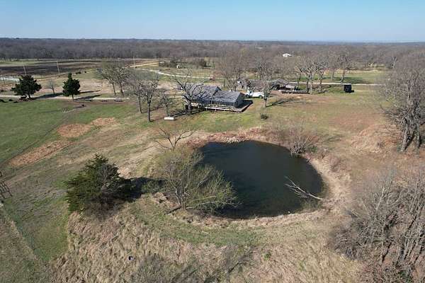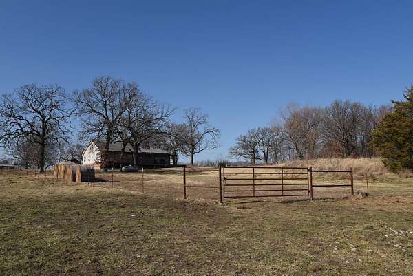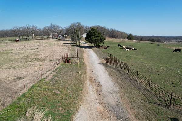 Set on 40± scenic acres, this rustic farmhouse offers a rare blend of pasture, water, and wooded privacy just minutes from town. The land is fenced and cross-fenced with newer 6-strand barbed wire, making it ideal for livestock or horses, and features two ponds, rolling pasture, and a heavily wooded past the homesite. A pipe-fenced entry, multiple outbuildings, and open grazing space invite you to bring your cattle and horses and enjoy true country living. Originally built in 1900 (per courthouse records), the home is rich with knotty wood throughout and classic farmhouse character. Offering 2 bedrooms, 1 bath, and a flex room, the layout is both functional and flexible-the flex room off the primary bedroom could serve as a third bedroom or home office, while the second bedroom is a loft-style space upstairs. The cozy living room is anchored by a pellet stove, with a propane heater in the primary bedroom, and the kitchen features a propane range, vinyl windows, and a durable metal roof. A basement cellar adds storage and storm protection. Outdoor living is just as inviting, with a covered back patio overlooking one of the ponds, perfect for quiet mornings or sunset views. Additional improvements include two loafing sheds, an older wood barn, and a 2-car carport/equipment shed with dog run. Conveniently located approximately 3 miles from Vinita, 15± minutes to Horse Creek on Grand Lake, 25± minutes to Shangri-La, 30± miles from Grove, and about one hour from Tulsa International Airport, this property offers peaceful rural living without sacrificing accessibility.
