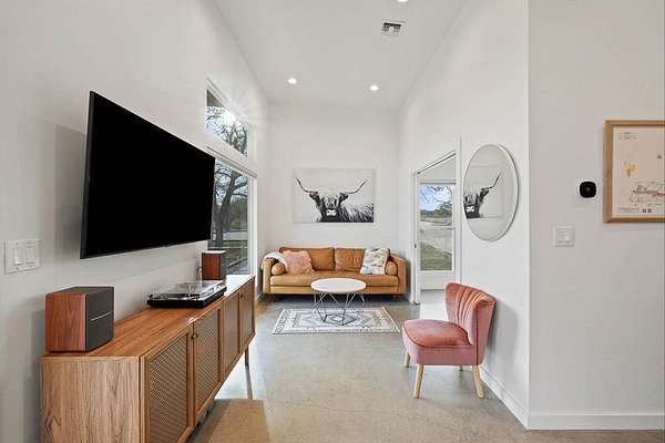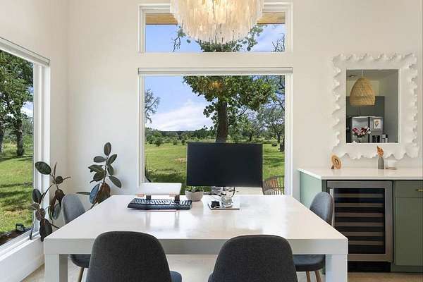 Welcome to an extraordinary private retreat in the heart of Texas Wine Country, where modern architecture meets the timeless beauty of the Hill Country--just one hour from Austin. Set on 2 individual tracts of land totaling 26 acres, with coveted Pedernales River access, this exceptional estate offers a rare balance of refined seclusion, boundless outdoor adventure, and income potential. Completed in 2023, the 3,100+/- sq.ft. contemporary residence is thoughtfully designed in a timeless double-wing floor plan, featuring 4 bedrooms, 3.5 baths, and remarkable indoor-outdoor living. Walls of windows throughout the great room infuse the home in natural light while framing sweeping vistas of the surrounding landscape. At the heart of the home, this gourmet kitchen is a true showpiece, appointed with GE Monogram commercial-grade appliances, a striking waterfall island with seating for 6, expansive workstation sink, an oversized walk-in pantry, elegant wine refrigeration towers, and a custom pet hydration station--perfect for both everyday living and elevated entertaining. The residence offers dual primary suites for ultimate privacy and flexibility, along with a third guest suite and a fourth bedroom ideal for an executive office, studio, or playroom. The Owner's Retreat is a serene sanctuary, highlighted by a private veranda, custom walk-in closet with direct laundry room access and stunning spa-inspired bath featuring a volcanic limestone soaking tub and glass-enclosed wet area. Outdoors, the estate unfolds like a private resort. An oversized lounge pool, jetted spa, and outdoor shower invite relaxation beneath wide Texas skies, while the D'Hanis brick fireplace and outdoor television create an unforgettable setting for al fresco dining and evening gatherings. Discreetly positioned on the contiguous acreage to the main residence are 2 bespoke cabins encircled by post oaks: Casa Serena is 1000+/- sq.ft. of pure enchantment, this vibrant 2-bedroom casita comfortably sleeps 4 and offers a full-sized kitchen with eat in island, wine fridge, and lavish bath. Casa de la Paz - light filled and airy, this modern cabin defies its square footage by emoting a feeling of living in the outdoors with a 400+/- sq.ft. footprint it exudes fun and efficiency. An inviting front porch opens to this charming A-Frame featuring shiplap ceiling, spacious kitchen and full bath. This offering is enhanced with access and ownership in a 5 acre tract of land stretching 850+/- feet along the Pedernales River, carved over ancient limestone shelves and canopied with mature cypress trees. Coupled with free ranging axis, whitetail, turkey, and rare exotics that commonly meander through heritage oaks, this acreage is truly an ideal setup for outdoor enthusiasts who wish to hunt, fish or simply enjoy nature at its finest. Impressive and thoughtful infrastructure include an all-weather road, underground power, 2 rainwater harvesting systems along with 2 private wells. Additionally, both parcels benefit from a current wildlife exemption and no oversight of an HOA. Ideally located just 20 minutes from the shops and dining of Fredericksburg's iconic Main Street, within walking distance to renowned wineries, the historic LBJ Ranch, this one-of-a-kind property offers a rare opportunity to own a modern Hill Country sanctuary where luxury, land, and lifestyle converge.