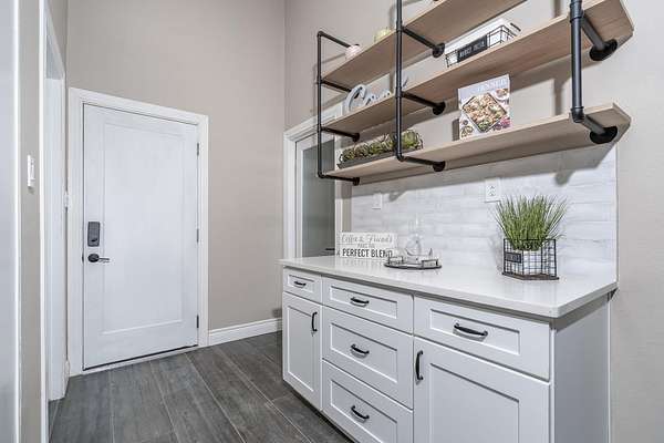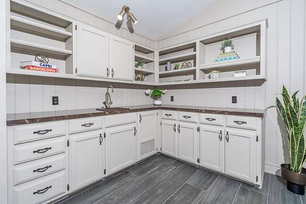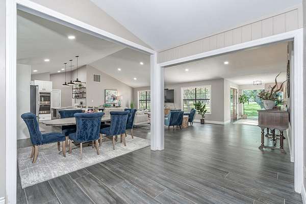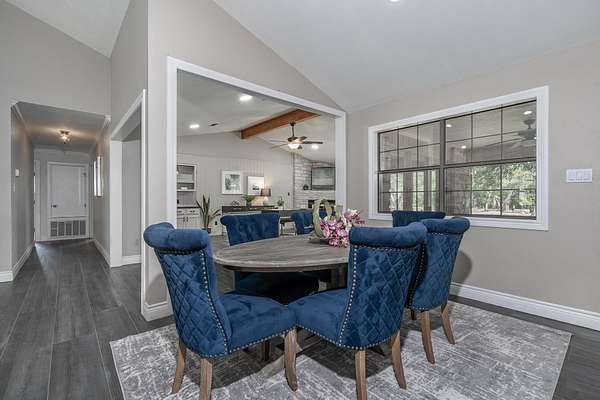 - Breakfast Bar, Ceiling Fan(s), Kitchen Island, Multiple Living Areas, No Interior Steps, Primary Bedroom On Main, Vaulted Ceiling(s), Wet Bar