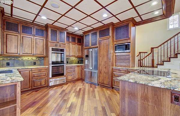 - Cook Island, Cooktop, Dishwasher, Double Oven, Free Standing Refrigerator, Granite, Island, Microwave, Stainless Steel Appliance