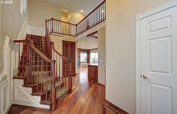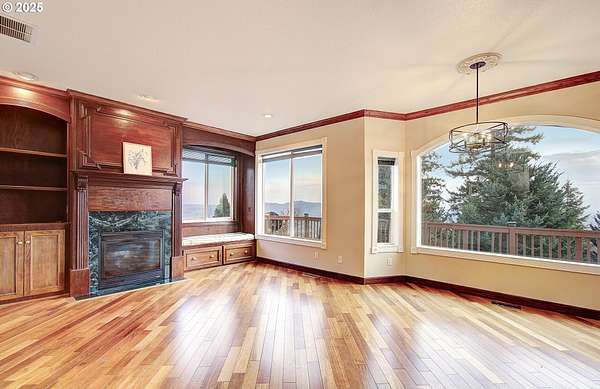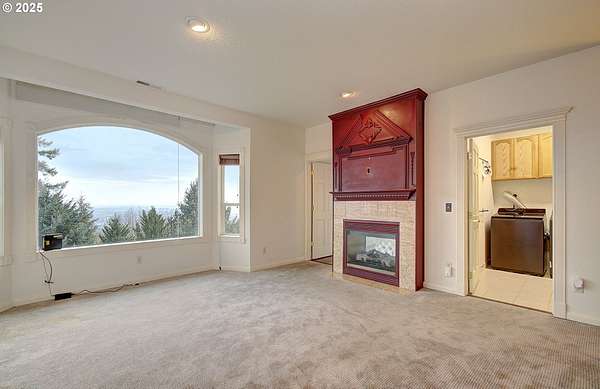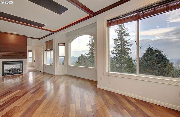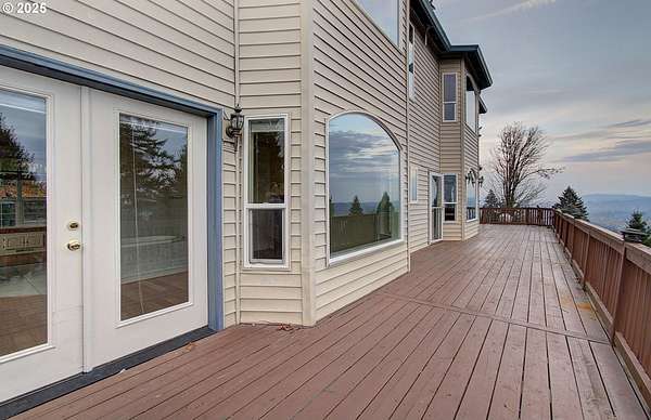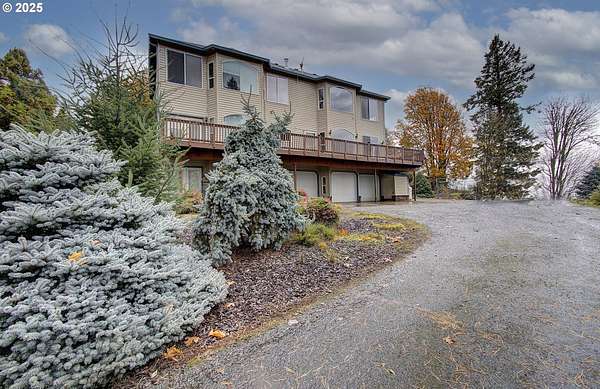 This 5-bedroom, 5-bath home in Woodland offers 2.02 acres with panoramic views of the mountain and river. Designed for comfort and function, the home features solid rosewood hardwood floors, high ceilings, and a bright living room with a propane fireplace. The entertainer's kitchen includes granite counters, double oven, and ample workspace. The main level primary suite offers a spa-like bath with a jetted tub. Upstairs, a second primary suite features a private balcony, fireplace, bath, shower, and double sinks, along with a spacious family room and another fireplace. Additional highlights include three propane fireplaces in total, skylights, lower-level caregiver quarters with a private entry, RV parking, and cement walkways, stairs, and patio areas. This property combines quality finishes, versatile living spaces, and stunning views in a peaceful Woodland setting.