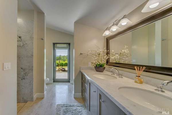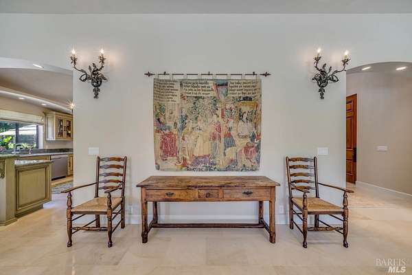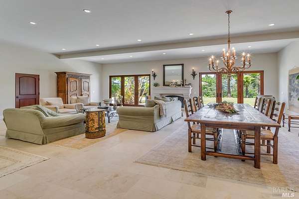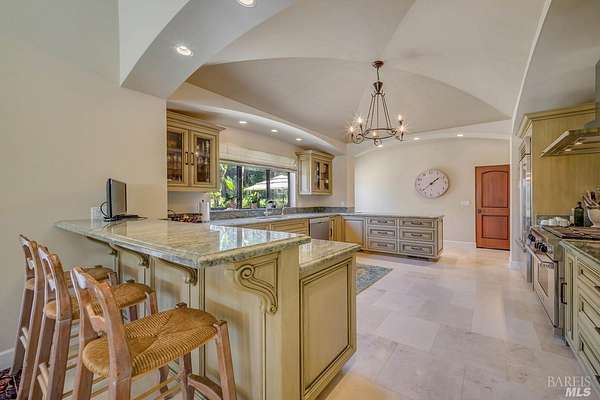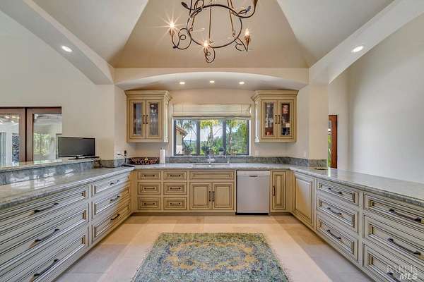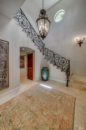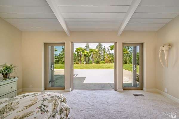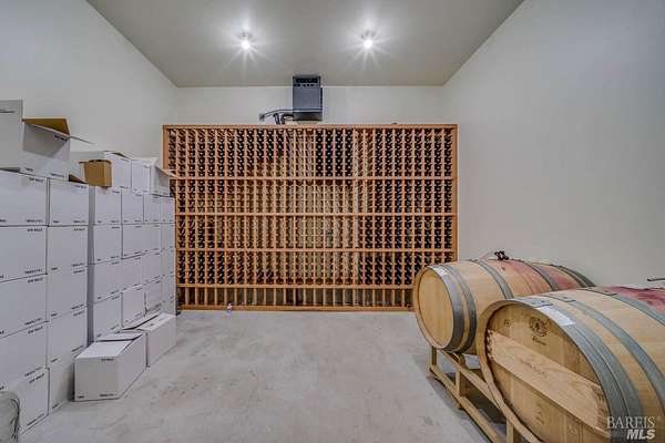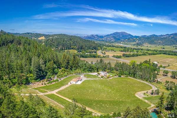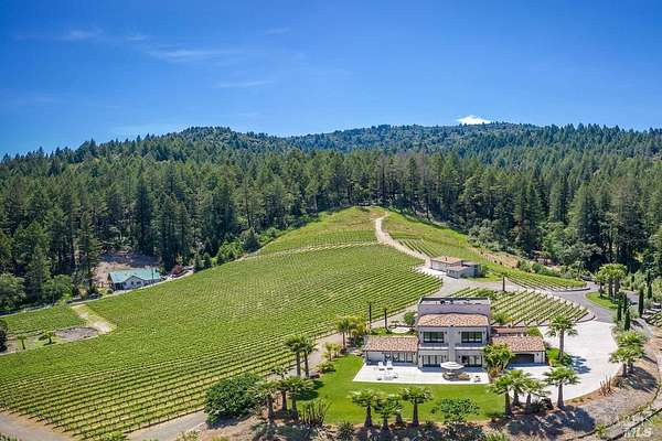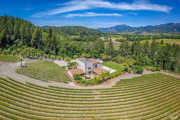 Sited on a sun-struck knoll on 18+ acres surrounded by prime Cabernet vineyards, this light-filled residence offers a wonderful sense of seclusion with 360' views in every direction. Architecture by the renowned Andrew Batey, whose designs were inspired by centuries of European classical rural architecture, emphasizes symmetry and simplicity. Possibly one of Andrew Batey's last creations, this home signals a bold new direction for modern wine-country living. French limestone floors span the main level; an artisan-carved limestone fireplace, masterfully crafted cabinetry, & custom-crafted metal railings, exotic lighting fixtures, & spacious primary suite with luxurious his & her baths & dressing rooms. The heart of the home is the magnificent kitchen with dramatic Cistercian ceiling arches influenced by the old abbeys of France, imported European Granite counters, Wolf range, Sub-zero, Bosch dishwasher, custom-crafted cabinets, & elegant touches throughout. Exquisitely landscaped grounds with a beautiful pond, verdant Palm trees, fruit orchards & excellent cash flow from 4 acres of prime Cabernet Sauvignon vineyard. Additionally, there is a 1,200 sq. ft. studio, custom wine cellar, and a productive 160 GPM commercial well for bountiful organic harvests.