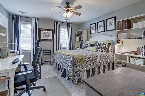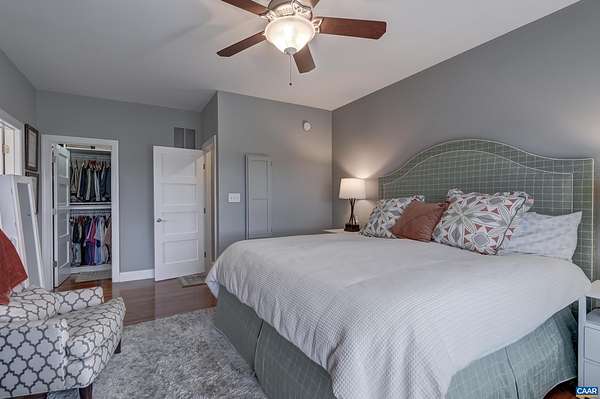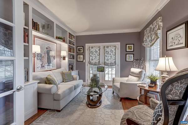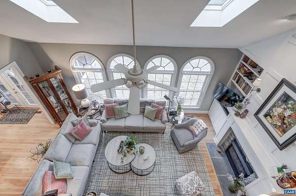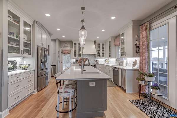 Set on 3+ private acres in Crozet with sweeping Blue Ridge views, this updated farmhouse-colonial offers over 3,500 sq ft of designer-finished living space plus a fully self-contained one-bedroom, one-bath basement apartment with private entrance and patio access - ideal for rental income or multigenerational living. The soaring great room features a vaulted ceiling with dual skylights, four arched transom windows framing mountain views, a stone fireplace, and built-ins. The renovated kitchen showcases two-tone cabinetry, quartz countertops, a six-burner professional range, storage drawers, custom hood, and designer tile backsplash, with an adjoining butler's pantry. The primary suite includes 2 custom walk-in closets and renovated spa-quality en suite bath with walk-in shower. Upstairs, a guest suite features an ensuite bathroom and two additional bedrooms share a jack-and-jill bathroom. The basement apartment with kitchen, living room, bed and bath is great for guests or in-laws. Multiple outdoor living spaces include a screened porch, open deck, covered lower patio, and fire pit area. Two-car garage and detached storage shed. Minutes to downtown Crozet, Charlottesville's Downtown Mall, UVA, and UVA Health.