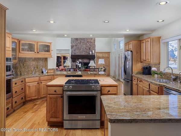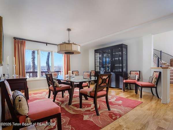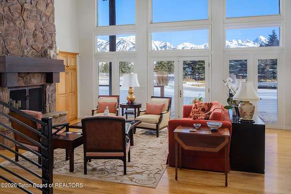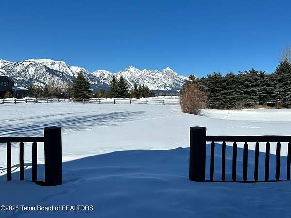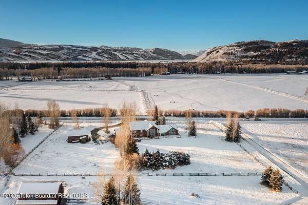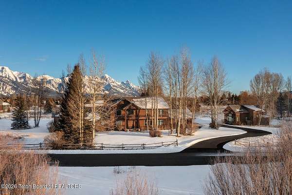 Located just north of the Gros Ventre River along one of Jackson Hole's most scenic roads and across from a large conservation parcel, sits this thoughtfully constructed home and guest home. Enjoy big Teton views across a scenic pond with waterfall from the 4 bedroom, 3.5 bath main home and 1 bedroom, 1 bath guest home. Large first floor primary suite with adjacent den, two walk-in closets, two separate vanities, jacuzzi tub and shower. Two large ensuite guest rooms are upstairs with fourth bedroom/office down. Formal and informal dining, large kitchen and oversized 3 car garage with elevated central bay, perfect a Sprinter van or camper. Brand new large exterior deck overlookng the views of the Tetons with spectacular southern exposure across the Serenity Ranch.