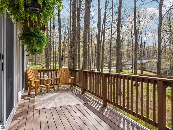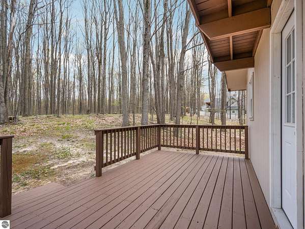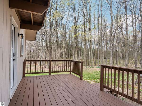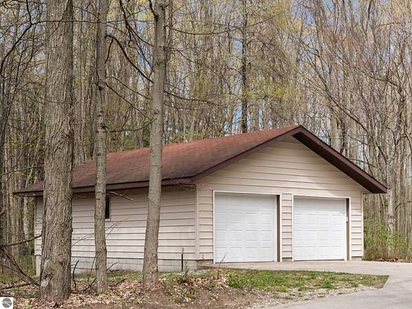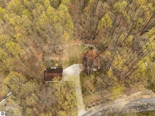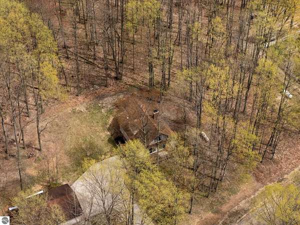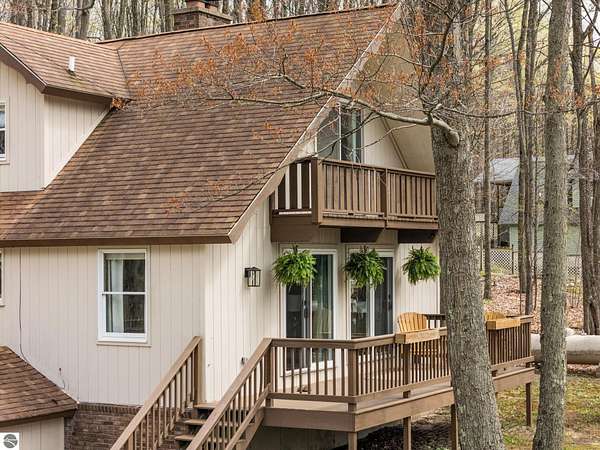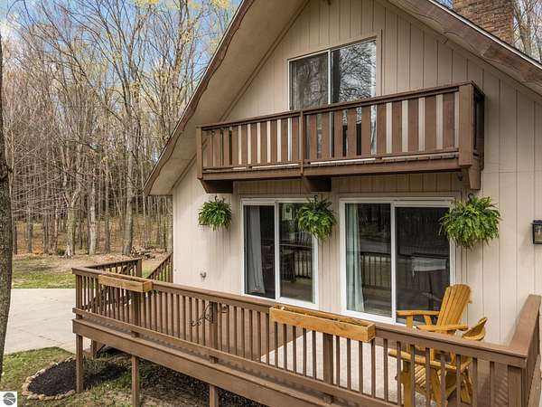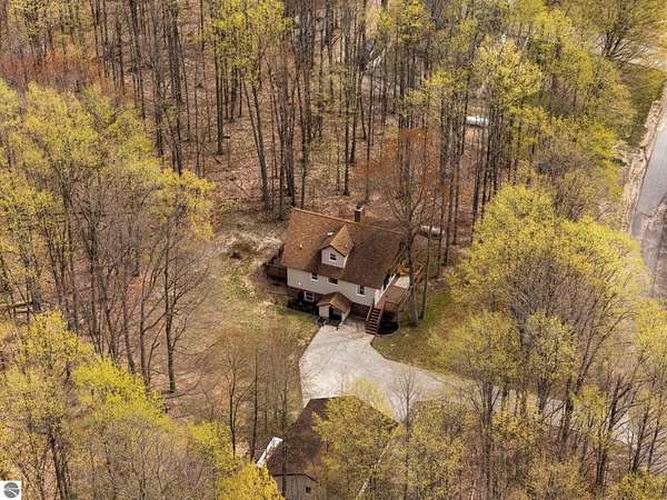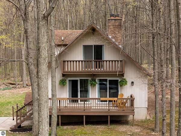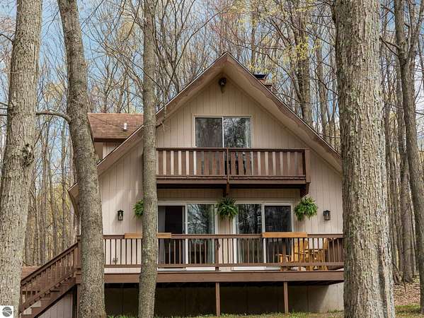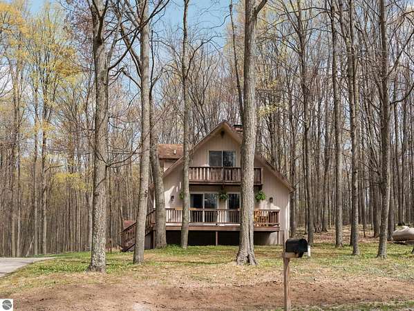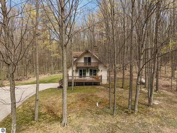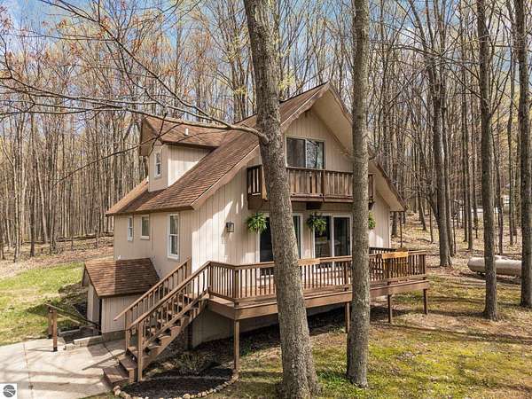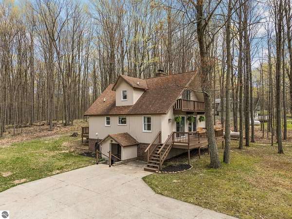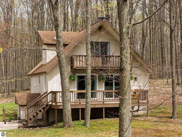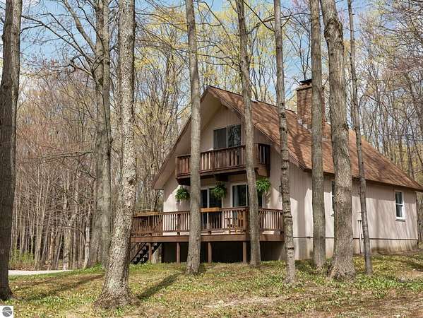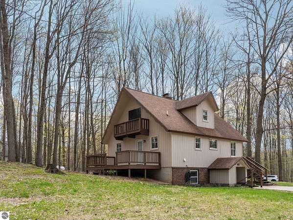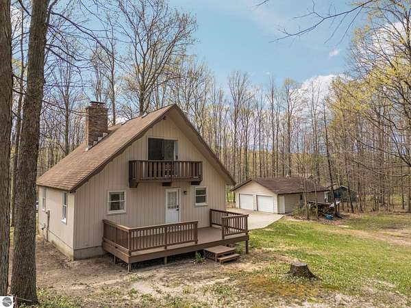 Set on approximately 3 wooded acres between Cadillac and Traverse City, this inviting chalet-style home offers the Up North setting buyers are searching for. Tucked into the trees with a peaceful, private feel, the property features expansive decks, private upper-level balconies overlooking the woods, and a firepit area perfect for enjoying evenings under the Northern Michigan sky. This 3-bedroom, 2.5-bath home offers approximately 1,700 square feet with a main living area showcasing vaulted ceilings, exposed beams, and a beautiful wood-burning fireplace as the focal point, while large windows bring in natural light and scenic wooded views. Upper-level bedrooms open to their own private balconies, adding to the home’s unique character and creating inviting outdoor spaces. The finished walkout lower level features a large family room, creating a comfortable second living area ideal for entertaining, movie nights, or hosting guests, along with a dedicated workout area. A spacious mudroom with built-in lockers is located on the lower level—perfect for storing gear after a day outdoors—while the main floor laundry adds everyday convenience. Recent improvements include a remodeled upstairs bathroom, new kitchen appliances, updated lighting and fixtures throughout, new garage doors, added ceiling fans, basement flooring and trim, enclosed entry stairs with handrails, and freshly painted siding. The wooded parcel offers space to explore and has previously been enjoyed for bow hunting, with nearby trail systems ideal for side-by-side riding. An oversized 2-car detached garage provides excellent storage for vehicles and recreational equipment, and the home is set up for a water softener if desired. Ideal for a year-round home, Up North getaway, or short-term rental opportunity.