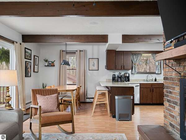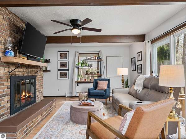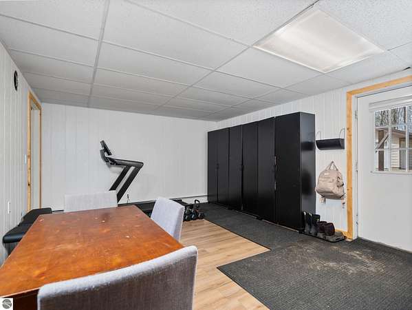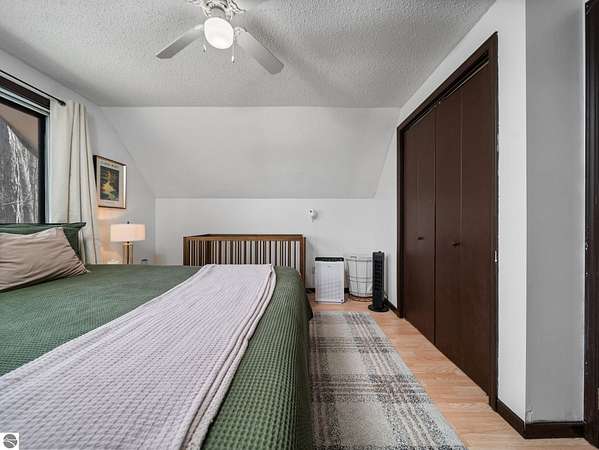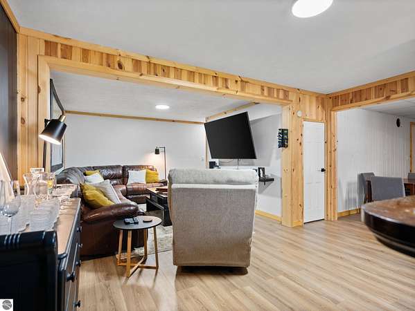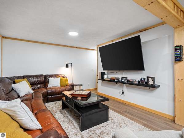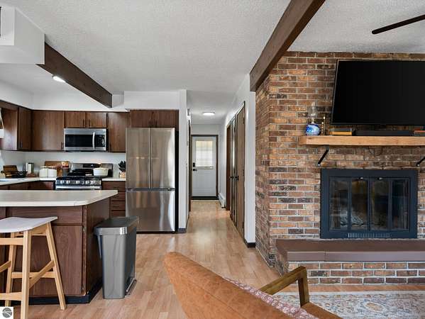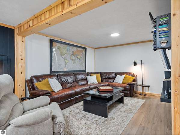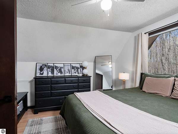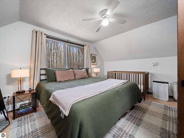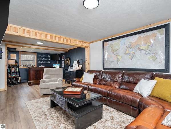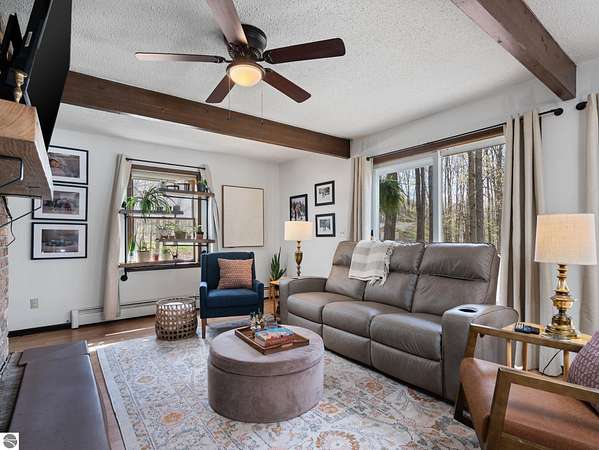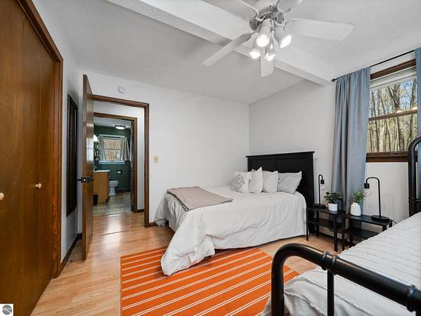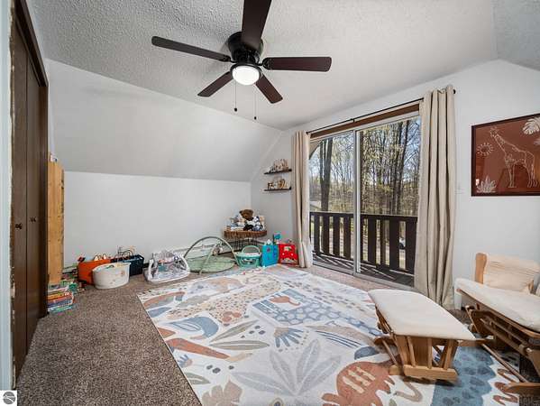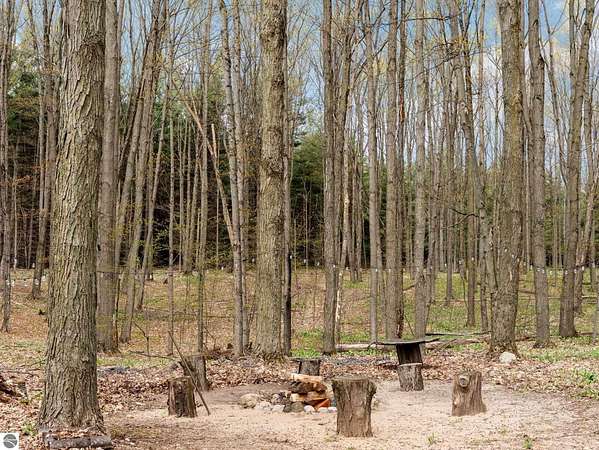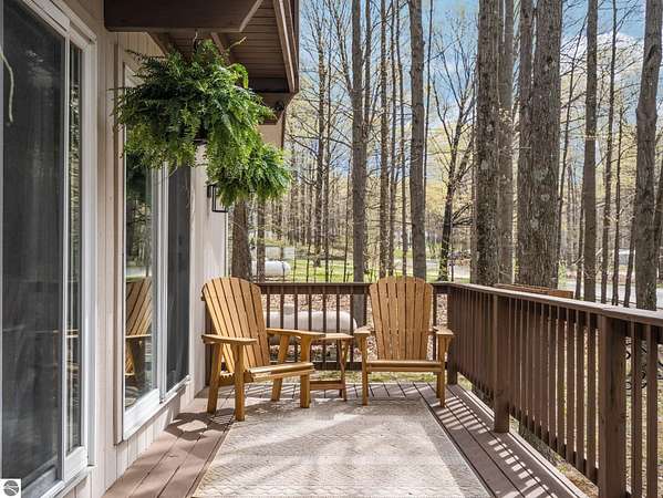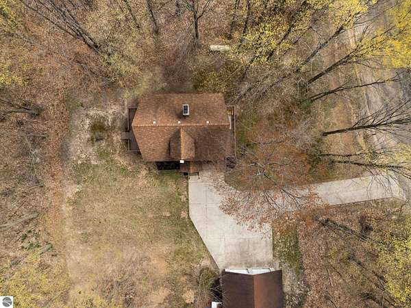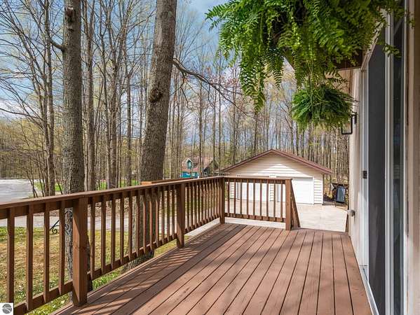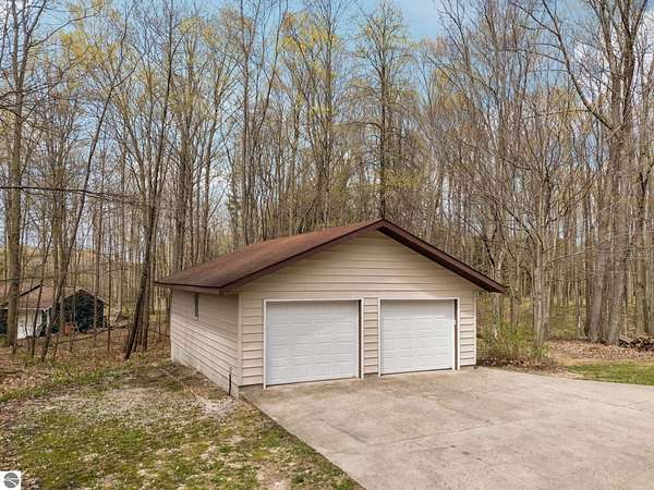 Set on approximately 3 wooded acres between Cadillac and Traverse City, this inviting chalet-style home offers the Up North setting buyers are searching for. Tucked into the trees with a peaceful, private feel, the property features expansive decks, private upper-level balconies overlooking the woods, and a firepit area perfect for enjoying evenings under the Northern Michigan sky. This 3-bedroom, 2.5-bath home offers approximately 1,700 square feet with a main living area showcasing vaulted ceilings, exposed beams, and a beautiful wood-burning fireplace as the focal point, while large windows bring in natural light and scenic wooded views. Upper-level bedrooms open to their own private balconies, adding to the home’s unique character and creating inviting outdoor spaces. The finished walkout lower level features a large family room, creating a comfortable second living area ideal for entertaining, movie nights, or hosting guests, along with a dedicated workout area. A spacious mudroom with built-in lockers is located on the lower level—perfect for storing gear after a day outdoors—while the main floor laundry adds everyday convenience. Recent improvements include a remodeled upstairs bathroom, new kitchen appliances, updated lighting and fixtures throughout, new garage doors, added ceiling fans, basement flooring and trim, enclosed entry stairs with handrails, and freshly painted siding. The wooded parcel offers space to explore and has previously been enjoyed for bow hunting, with nearby trail systems ideal for side-by-side riding. An oversized 2-car detached garage provides excellent storage for vehicles and recreational equipment, and the home is set up for a water softener if desired. Ideal for a year-round home, Up North getaway, or short-term rental opportunity.