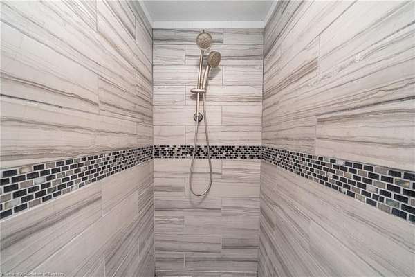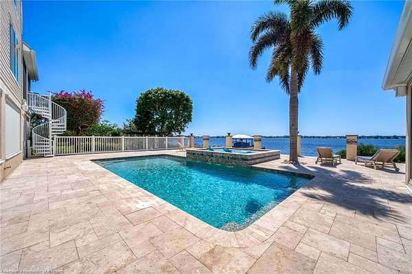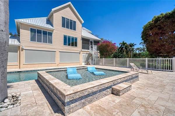 The main living area is on the second floor, with elevated lake views and plenty of natural light. Designed for both relaxing and entertaining, the outdoor area features a heated pool with ledge loungers and travertine tile on a large 45x65 pool plaza. Gas torches around the pool and along the lake create a warm glow at night. There's a screened porch on the pool level and another screened porch upstairs overlooking the water.