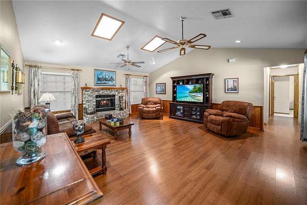 CUSTOM brick-accented home, situated on 2.4 acres......with a DETACHED WORKSHOP & CARPORT!!! METAL ROOF IN 2004, NEW A/C IN 2021, many double-paned windows, NEW WATER HEATER IN 2025, and in mint condition!! BEAUTIFUL FIREPLACE upon entering the front door......vaulted ceilings, skylights, wainscoting, SPACIOUS ROOMS, HUGE kitchen with an island and a built-in workstation. We have outlets in the island and the formal dining is also oversized. ALL APPLIANCES WILL STAY, EVEN THE WASHER & DRYER. The Owner's Suite is tucked down its own mini hall......boasts TWO closets (1 being a big walk-in), and a private bath with dual sinks, a stand-up shower, & a soaker tub. Beds 2 & 3 have NEW CARPET, a HALF BATH is convenient for guests, & our Laundry room is INSIDE! There are extra hall closets, newer blinds, marble sills, gutters, an active TERMITE BOND, & a PHENOMENAL FLORIDA ROOM. Comprised of many windows, a cedar ceiling, central a/c.........this room could be an amazing den, office, crafts or hobby space, & would make that superb additional gathering area for family & friends. The garage has a SIDE ENTRY, is larger than most, offers a utility sink, a bump-in nook for storage, & there is also a GENERATOR OUTLET IN PLACE. STORM BOARDS WILL STAY WITH THE HOME FOR WINDOW/DOOR PROTECTION. This garage & the DETACHED workshop both have door openers. Our WORKSHOP has a NEW ROOF AS OF THIS YEAR........there is shelving, lights/power, & benches. The property is GORGEOUS!! Mature Oaks, Maples, & Pines add great shade and panoramic views. LOOKING TO SPLIT THE PARCEL & BUILD ANOTHER HOME?? That possibility may exist......there is approximately an acre on the west side of this property that could make another homestead or offer the space for a second home. Please ask your Realtor for more info and/or Osceola County agencies. Location is IDEAL......the FL Turnpike is within 4+ miles, OIA is within 22+ miles, East Coast Beaches in 49+ miles, our famous attractions within 28+ miles, downtown St. Cloud shops/eateries & lakefront park in 6+ miles, & Lake Nona is within 18+ miles. NO HOA, NO CDD, NO WATER BILL.........ONE-OWNER & METICULOUSLY MAINTAINED. Not many on the market, make sure to book your private showing to see all we have to offer.