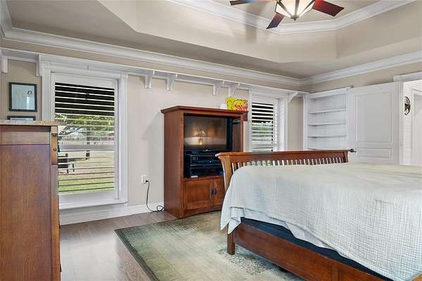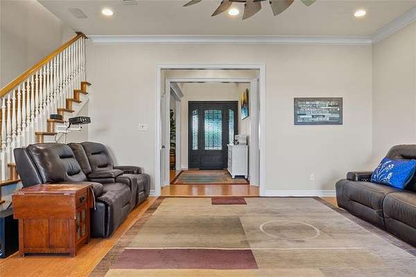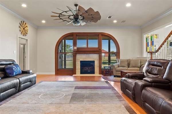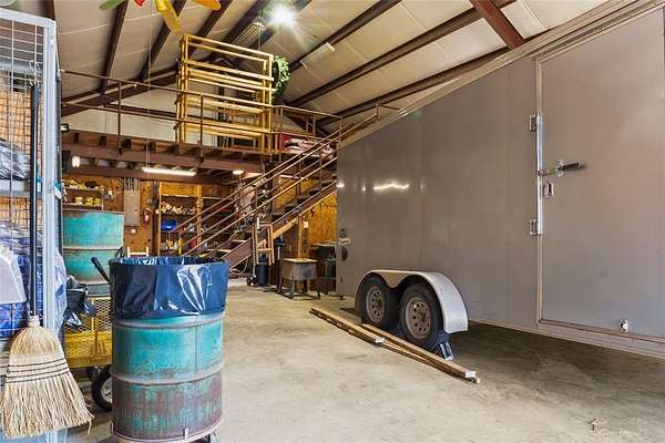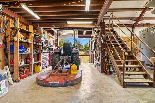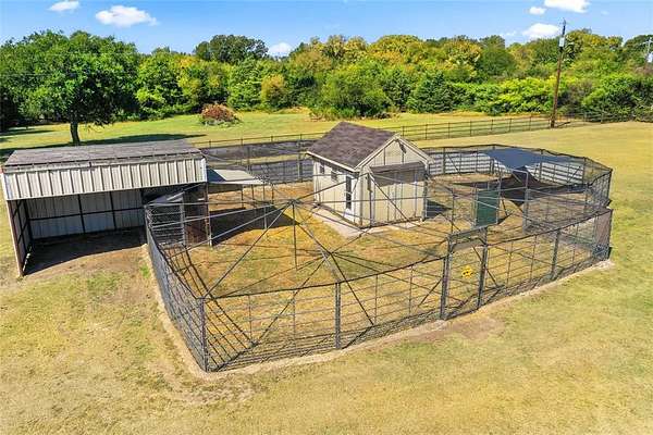 Beautiful retreat for an animal-loving family on 4.3 acres. The first floor offers 10 ft ceilings, an owner's suite, three additional bedrooms, 3.5 baths, a kitchen with upgraded appliances, a large pantry, a home office with a scenic view, a breakfast nook, a laundry room, and a living area with a propane fireplace. Features include plantation shutters, stained glass, wood trim, and recently added ceiling fans. Upstairs are a game room, an extra bedroom and bath, and a hidden gun-storage space. The home also includes an indoor storm shelter built with insulated steel, two fold-up beds, and an interlocking steel door rated for 170 mph winds. Exterior cameras can be monitored from the office or storm shelter. Thick insulated-concrete exterior walls provide efficiency and withstand up to 220 mph winds. Additional features include tumble-brick exterior, solar screens, propane HVAC units, and two whole-house tankless water heaters. The insulated barn, wired with 220-amp outlets, offers roll-up and walk-through doors plus three outdoor horse stalls. Inside is a non-insulated horse area that stores up to 250 hay bales and two 16-foot trailers with drive-through access, along with three indoor stalls and horse waterers. The property also includes a goat pen and chicken compound. Cross-fencing with four-rail pipe and field fencing protects livestock. An iron picket and chain-link fence surrounds the home, creating a park-like yard with a decorative windmill, fire pit, swing set, and grain-bin gazebo. The dog kennel features 6-ft fencing and a fully insulated doghouse with AC, heat, water, and loft storage. This property is move-in ready and equipped for a wide variety of family events.
