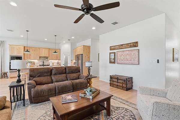 Experience exceptional privacy and tranquility as you drive up the paved, meandering driveway to this beautiful 4-bedroom, 2-bath home nestled on 3 partially wooded acres. This property offers an ideal blend of modern living and rural charm. A highlight of the property is the impressive 30x30 workshop, complete with gutters and additional 30x15' and 30x20' covered awnings, 3 side doors and a 10x10 rollup door, perfect for equipment, vehicles, hobby or recreational toys. Inside, the nearly new home showcases an open concept design with a cozy wood burning fireplace, spacious kitchen and custom cabinetry. The large island provides ample bar seating, complemented by a gas range, electric wall oven, granite countertops, RO water system, and abundant counter space ideal for entertaining and holiday gatherings. The primary suite features dual closets and sinks, a relaxing garden tub, and a walk-in shower, conveniently connected to the utility room. The split-bedroom layout ensures privacy, with each generous bedroom offering a large walk-in closet. Outdoors, the backyard is fully enclosed with pipe fencing and steel panel inserts. The workshop includes electricity with a 220 outlet and plenty of space for vehicles or equipment, while a 12x9 concrete slab is perfectly suited for a dog kennel. Every detail of this property reflects thoughtful design and energy-efficient upgrades throughout. Residents of Mountain Lakes enjoy exclusive community amenities, including two private lakes, a clubhouse, swimming pool, exercise and play park, as well as RV parking and storage.