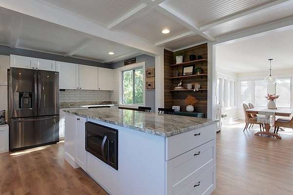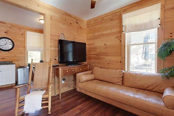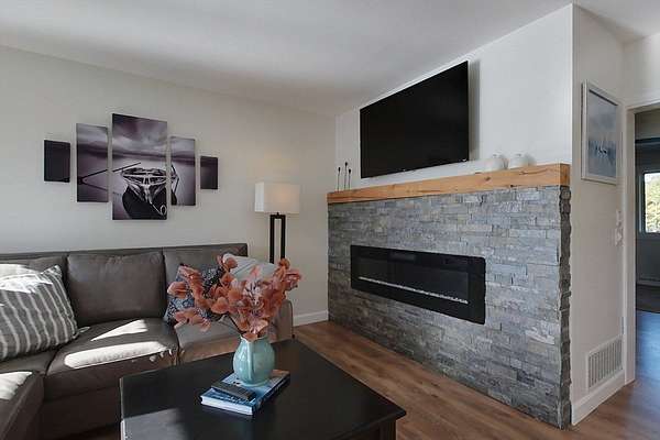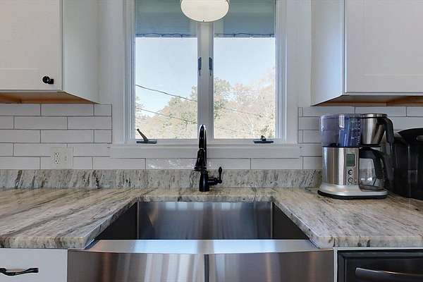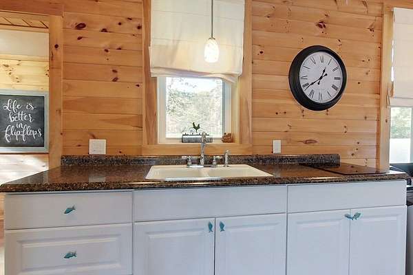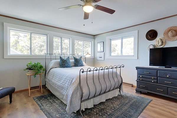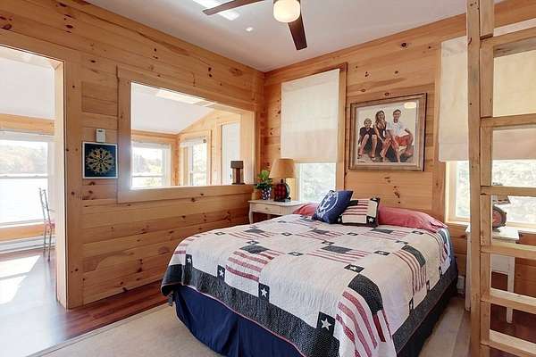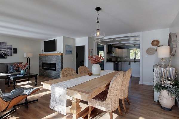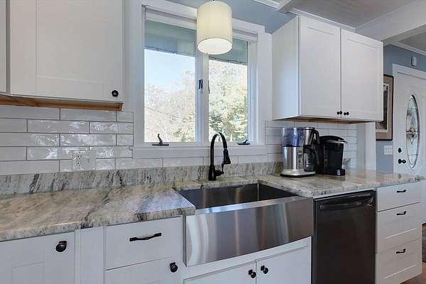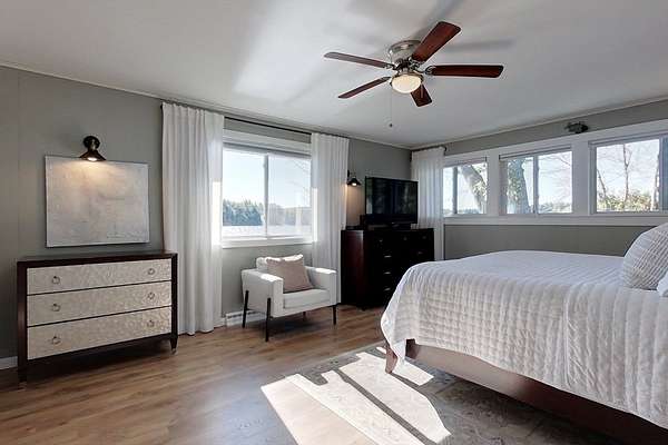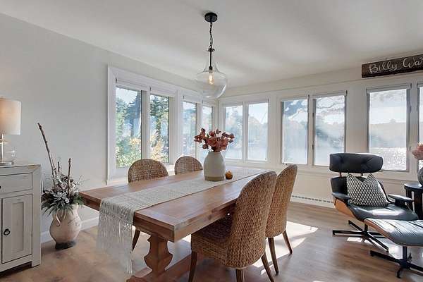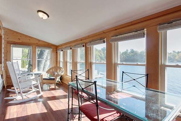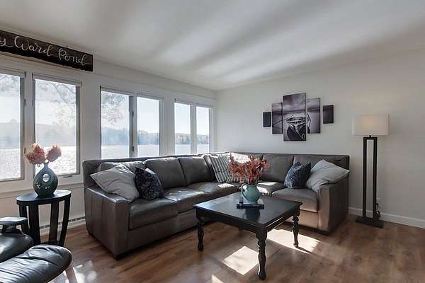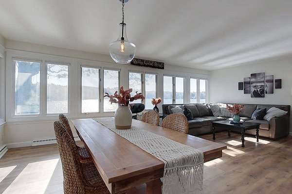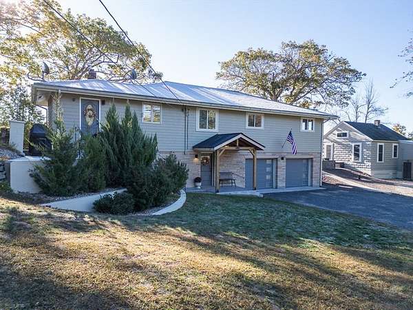 Experience year-round waterfront living on nearly 2.5 acres w/ over 400 ft of frontage! This stunning 2-bedroom raised ranch w/ a detached 1-bedroom lofted cottage--each w/ its own kitchen & living area--has been beautifully updated throughout. Enjoy new floors, counters, & island, fully renovated baths, added electric fireplaces, & new garage doors and insulation (2019). The main home's open layout showcases a grand kitchen w/ white shaker cabinets, stainless farmers sink, & coffered ceilings that flow into a sun-drenched living & dining area wrapped in 14 windows framing serene water views. Both bedrooms feature private ensuites. Outdoors, enjoy professionally landscaped grounds, an outdoor shower, new dock (power boats welcome), fire pit area, & oversized heated garage. The unfinished lower level offers excellent storage or future expansion. The charming guest cottage completes this private, picturesque retreat.