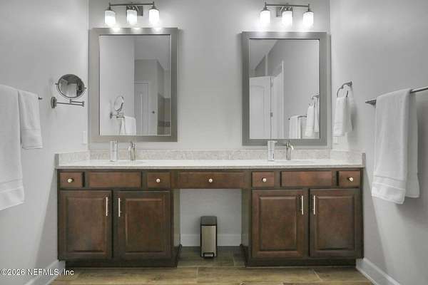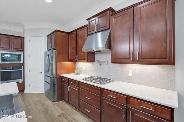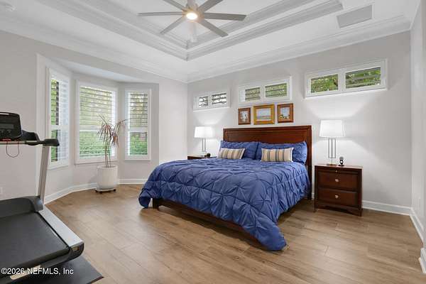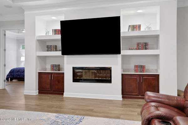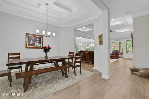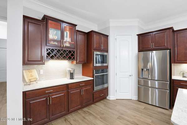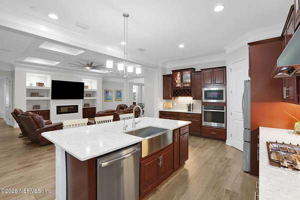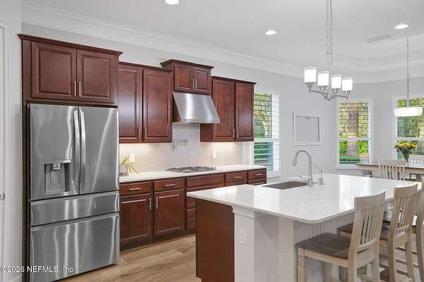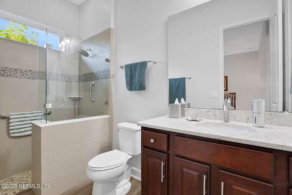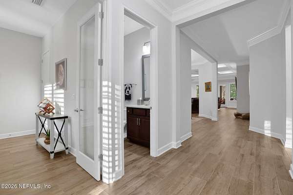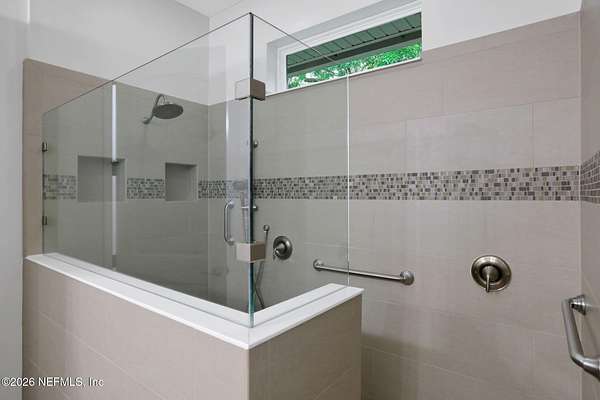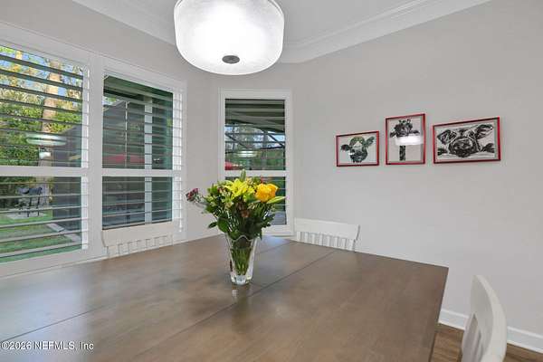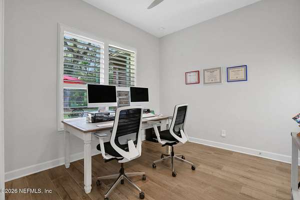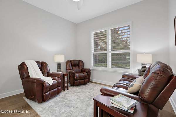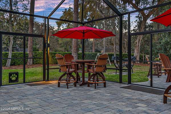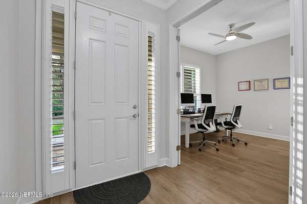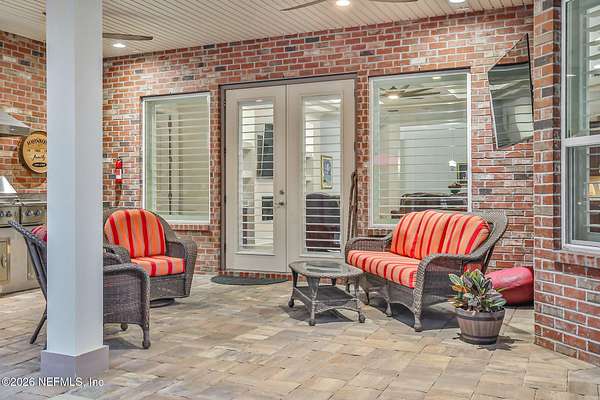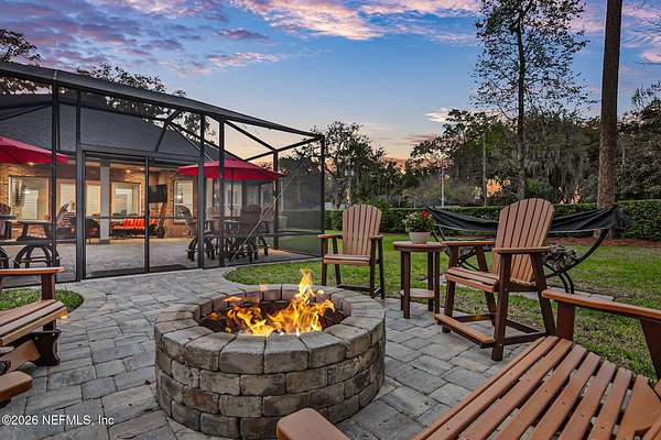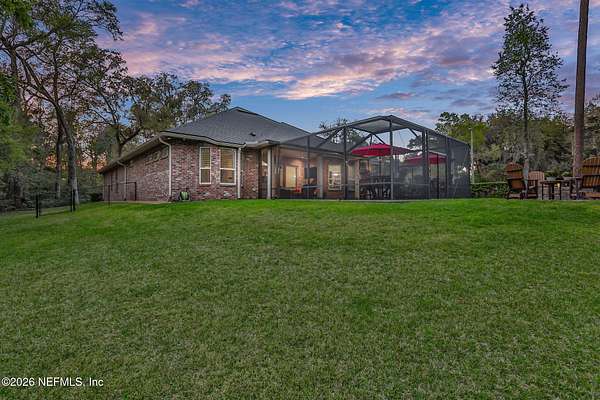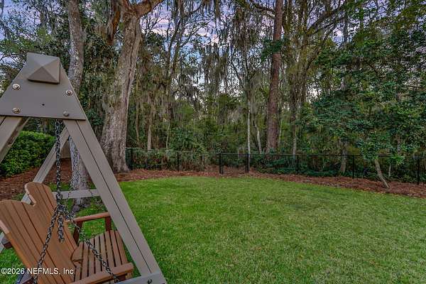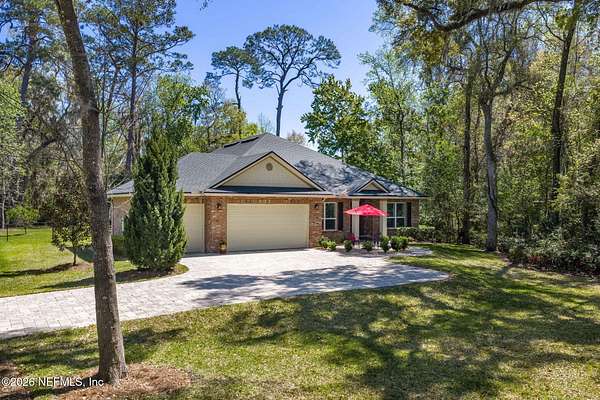 Nestled on 1.9 acres in the heart of Mandarin, this newer-built estate offers the perfect balance of privacy, nature, and city convenience. Surrounded by natural beauty and featuring its own private nature trail, this property provides a peaceful retreat while still being close to everything Jacksonville has to offer. Designed with both comfort and functionality in mind, the home features a dedicated office with French doors and a 3-way split bedroom floor plan for optimal privacy. The fourth bedroom serves as its own guest or in-law suite, ideal for visitors or multi-generational living. Inside, you'll find beautiful ceramic wood-look tile flooring, soaring ceilings with tray ceiling accents, and an open-concept living and kitchen layout filled with natural light. Plantation shutters throughout the home add timeless style while providing privacy and light control. The living room showcases a modern electric fireplace, creating a warm and inviting focal point. The gourmet kitchen is thoughtfully designed with quartz countertops, gas burner cooktop with pot filler, walk-in pantry, and generous workspace for cooking and entertaining. A spacious laundry room with a sink adds everyday convenience. Step outside to your private backyard oasis, complete with paver patios in both the front and backyard, a covered and extended screened lanai, summer kitchen, fire pit area, and swing set--perfect for enjoying Florida outdoor living year-round. The fully fenced backyard offers space for recreation, pets, and gatherings. Additional highlights include a 3-car garage, whole-house generator for peace of mind, and ongoing pest control services. Experience the rare opportunity of city living with acreage, privacy, and your own nature retreat right at home.