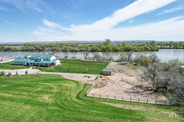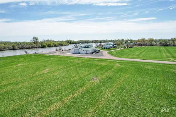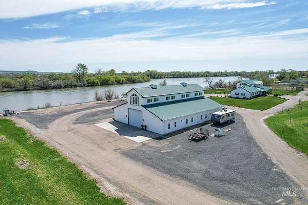 Riverfront ranch on the Snake River at the Idaho border! Two parcels totaling 20.7+/- acres (10.35+/- acres each). One features a 3,710+/- SF 4-bed, 4-bath home with hardwood floors, horse corral, and a 5,000+/- SF shop with two apartments-one used as an office with a full bathroom, the other a 1,600+/- SF finished unit with bedroom, bath, kitchen, and living area. The second parcel includes an unused building permit for future development. Approx. 17+/- irrigated, cultivatable acres with auto sprinklers and a 1,000+/- gal pump station. Seller gets ~4 cuttings/year of alfalfa, and there is wheat. Partial post & pole fencing. Bring your horses, farm, recreate & hunt. Just 1 hour from Boise. Owner carry considered-Make Offer! BTVAD