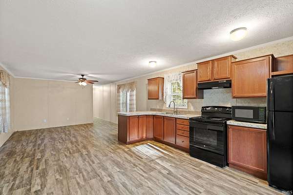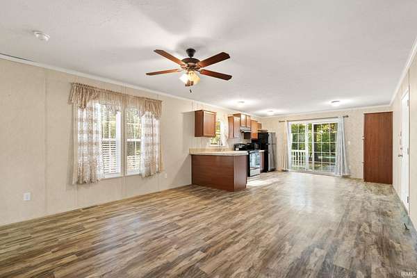 - Breakfast Bar, Ceiling Fan(s), Countertops-Laminate, Main Floor Laundry, Main Level Bedroom Suite, Open Floor Plan, Porch Covered, Refrigerator