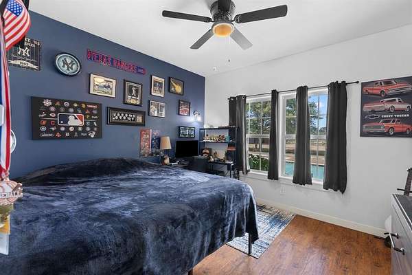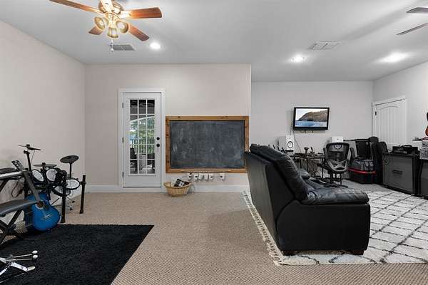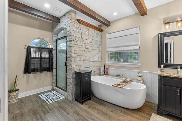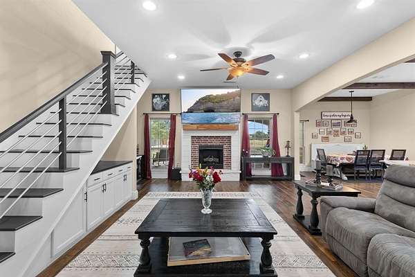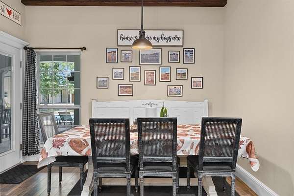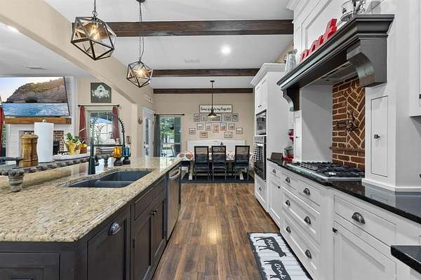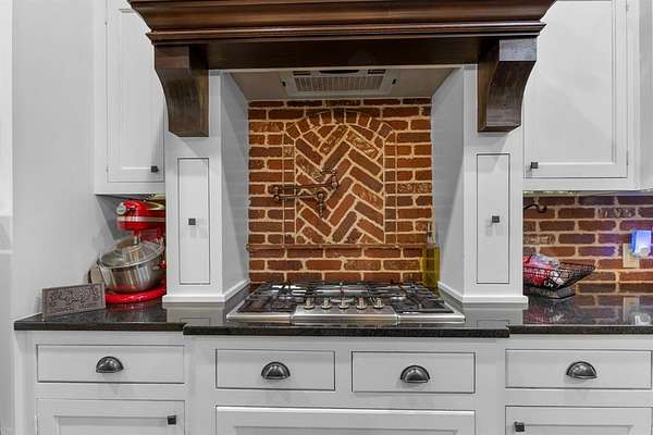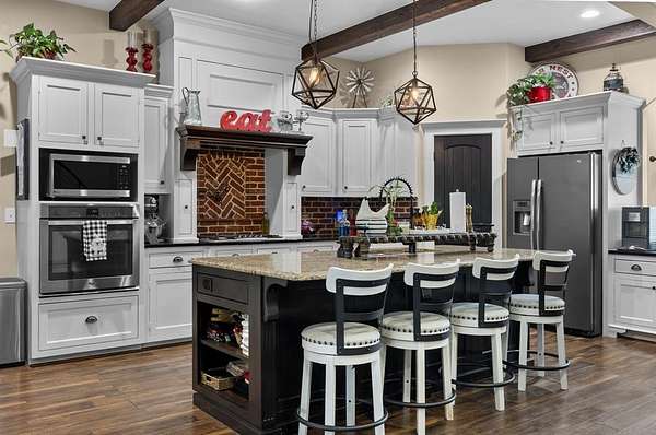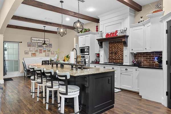 Inside, the open floor plan with fine finishes, elegant wood floors, cozy fireplace, custom built-ins, & stylish light fixtures will leave you breathless. The kitchen--with its brick accents, wood beams, & farmhouse chic--makes cooking a dream from the gas cooktop to gathering at the extra large granite island. The split concept provides space and privacy on the main level. The primary bedroom has a luxury en-suite with his and hers walk-in closets, dual sinks and a separate shower and bath. The guest bedrooms are spacious with walk in closets and big windows for natural light. Jack-and-Jill bathrooms connect 2 of the guest rooms offering privacy and accessibility for a growing family.