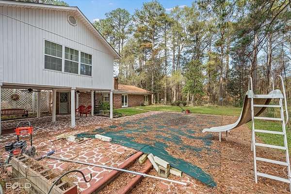 This rare find sits on five beautiful tree studded acres and has been lovingly owned by just one owner. The property offers privacy, space, and exceptional versatility both inside and out. An additional guest room provides approximately 300 heated square feet above the carport, complete with a full bath conveniently located by the pool. This space is not included in the main square footage and is perfect for guests, a private retreat, or flexible living options. Designed for entertaining, the home features a covered patio overlooking a Gunite pool and expansive land that offers endless opportunities for outdoor enjoyment. Whether hosting gatherings or enjoying quiet evenings, the setting is ideal. Inside, the kitchen is both functional and inviting with abundant cabinetry, quartz countertops, and double ovens, making it well suited for everyday living and entertaining alike. The living room features cathedral ceilings that enhance the open and airy feel of the home. Spacious bedrooms and two separate sitting areas provide comfortable living with room to relax and unwind. Throughout the home, you will find beautiful wood accents paired with porcelain tile flooring, adding warmth and character. A roof that is only five years old adds peace of mind. This unique property offers space, charm, and features that are hard to find, all set on a stunning five acre landscape.