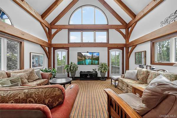 Soaring beams, expansive walls of glass, and four inviting decks highlight the home's stunning architectural design. The open-concept layout is perfect for entertaining, with a flowing kitchen and dining area that lead seamlessly into two breathtaking Great Rooms.