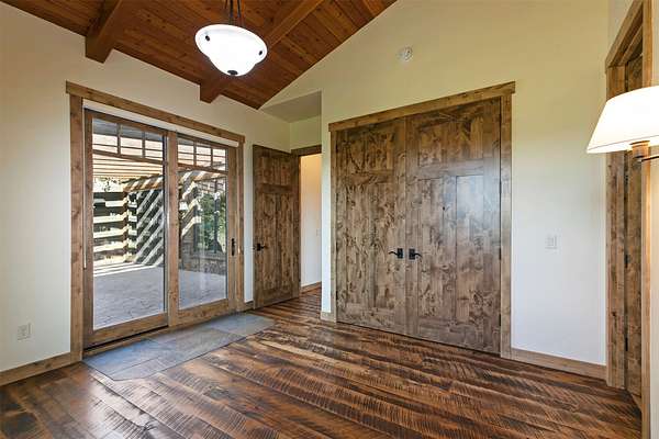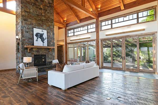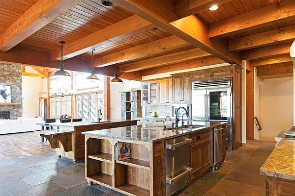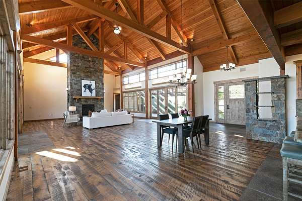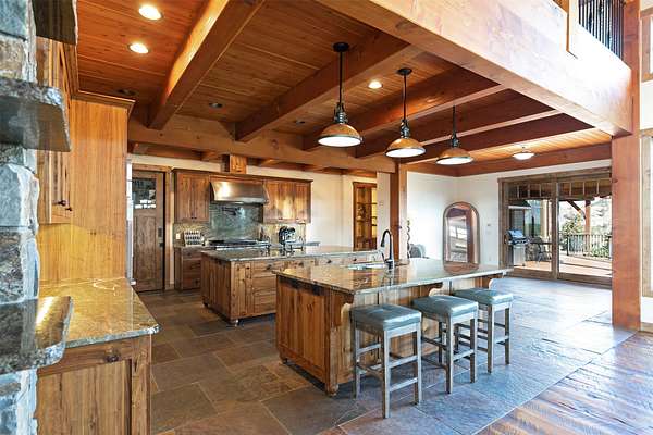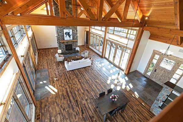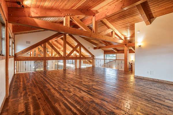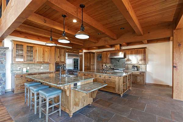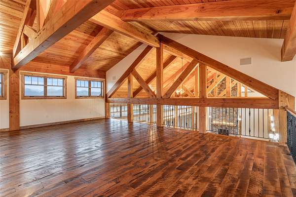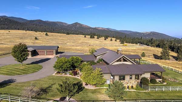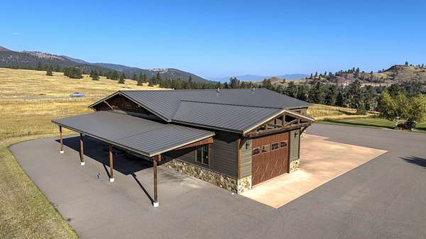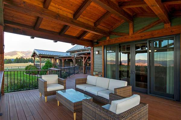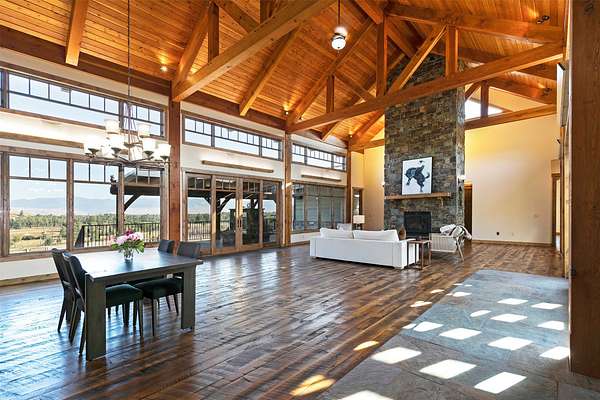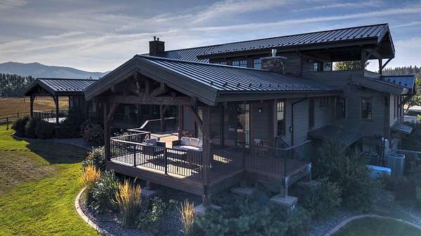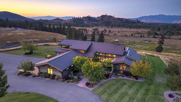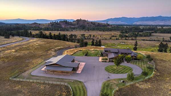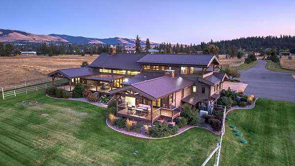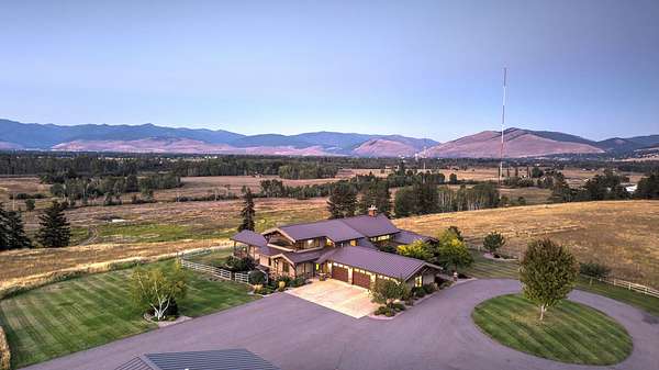 Located within the Blue Mountain neighborhood of Missoula, this exceptional property presents a rare opportunity to own a piece of luxury amidst a private, natural setting, while still being close to town. Spanning over 130 acres of pristine land, with 2,500 Ft. +/- of coveted private Bitterroot River frontage, this estate epitomizes high-end living in the heart of Big Sky Country. At the forefront of this property stands not only an executive 10,408 sq. ft. home, but also a detached 4,324 sq. ft. shop, with high ceilings and 4 oversized overhead doors, and a charming 960 sq. ft. caretaker home. These structures, meticulously designed and crafted, provide both practical functionality and additional living space for guests or staff. As you enter the main residence, you will immediately notice the intricate wood detailing throughout, including circle sawn hardwood floors, massive exposed timber frame trusses and beams, and wood-planked ceilings, creating a rustic yet elegant atmosphere. The open-concept design seamlessly connects the living room, dining area, and chef's kitchen, offering an ideal setting for both intimate gatherings and grand entertaining. The living room features a soaring floor-to-ceiling stone fireplace, cathedral ceilings, and expansive windows framing gorgeous mountain views. The chef's kitchen is a culinary masterpiece, featuring high-end appliances, dual islands, granite counters with a matching backsplash, and a large pantry, ensuring a perfect blend of style and functionality. The main floor primary suite offers both comfort and luxury with a floor-to-ceiling stone fireplace, private deck access, and a spa-inspired ensuite bathroom with a custom-tiled walk-in shower, soaking tub, dual sinks, and a spacious walk-in closet. Upstairs, a loft overlooks the living room, offering a versatile space for entertainment or relaxation. The partially finished basement provides endless possibilities for customization to suit your lifestyle and preferences. Outside, the property features a spacious covered deck, providing a secluded area to unwind away from the view of Blue Mountain Road. The deck includes an exterior fireplace and offers panoramic views of the surrounding mountains and Missoula Valley, providing a beautiful backdrop for outdoor gatherings. Bordering the Lolo National Forest and right next to the popular Blue Mountain recreation area, this property offers unparalleled access to outdoor adventures, including hiking, fishing, wildlife watching, and more. With downtown Missoula just a short 20-minute drive away, enjoy the perfect balance of seclusion and convenience at this truly one-of-a-kind luxury estate in Missoula's Blue Mountain neighborhood.