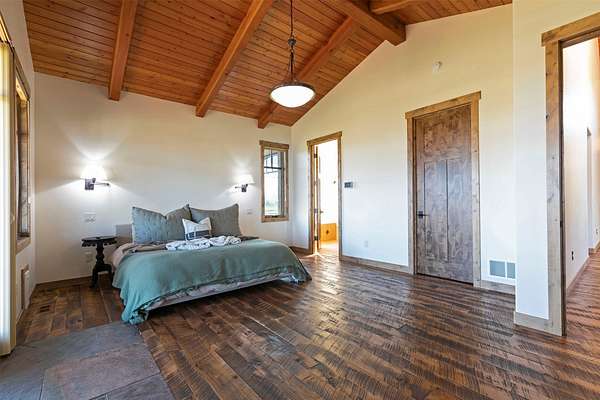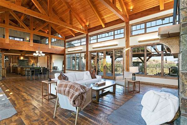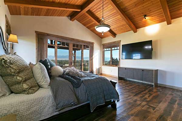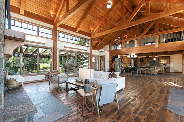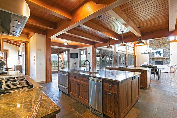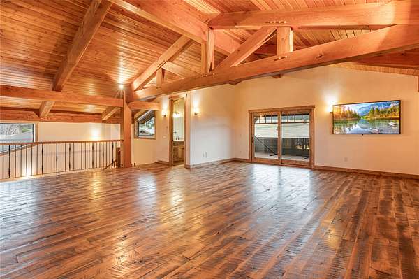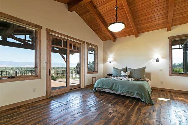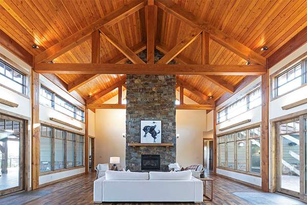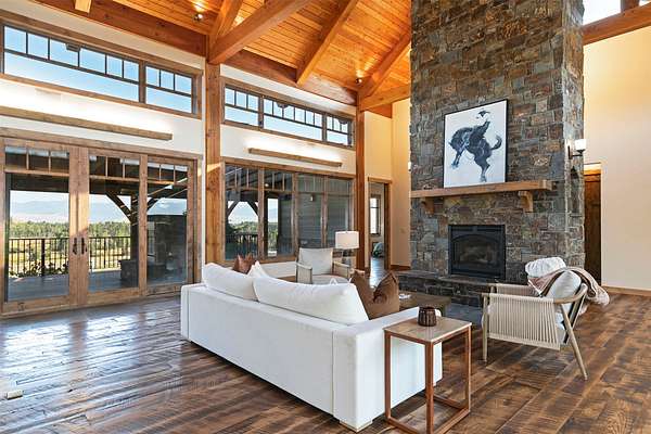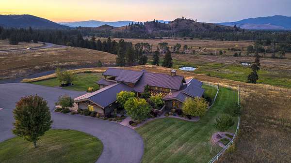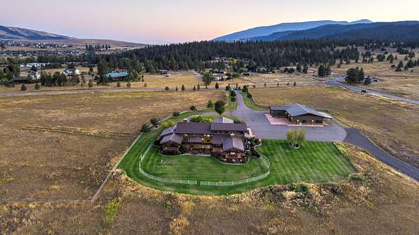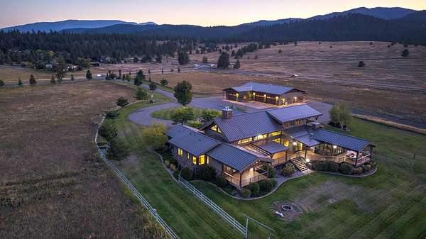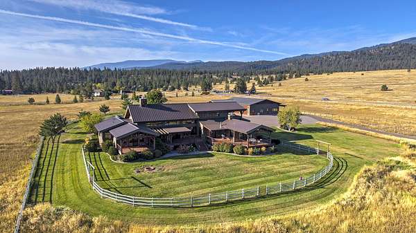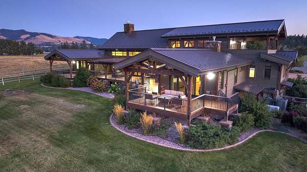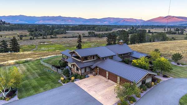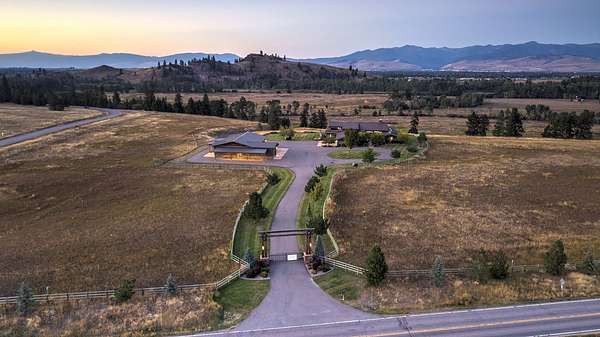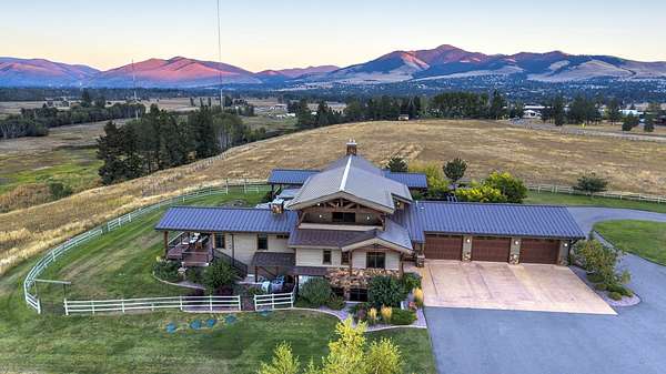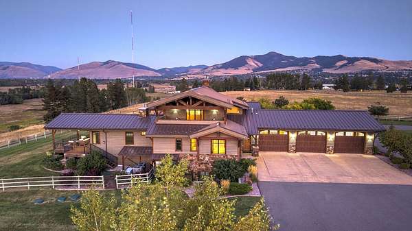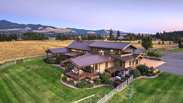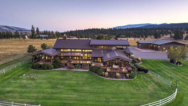 Located within the Blue Mountain neighborhood of Missoula, this exceptional property presents a rare opportunity to own a piece of luxury amidst a private, natural setting, while still being close to town. Spanning over 91 acres of pristine land, with 1,200 Ft. +/- of coveted private Bitterroot River frontage, this estate epitomizes high-end living in the heart of Big Sky Country. At the forefront of this property stands not only an executive 10,408 sq. ft. home, but also a detached 4,324 sq. ft. shop, with high ceilings and 4 oversized overhead doors. These structures, meticulously designed and crafted, provide both practical functionality and additional living space for family or guests. As you enter the main residence, you will immediately notice the intricate wood detailing throughout, including circle sawn hardwood floors, massive exposed timber frame trusses and beams, and wood-planked ceilings, creating a rustic yet elegant atmosphere. The open-concept design seamlessly connects the living room, dining area, and chef's kitchen, offering an ideal setting for both intimate gatherings and grand entertaining. The living room features a soaring floor-to-ceiling stone fireplace, cathedral ceilings, and expansive windows framing gorgeous mountain views. The chef's kitchen is a culinary masterpiece, featuring high-end appliances, dual islands, granite counters with a matching backsplash, and a large pantry, ensuring a perfect blend of style and functionality. The main floor primary suite offers both comfort and luxury with a floor-to-ceiling stone fireplace, private deck access, and a spa-inspired ensuite bathroom with a custom-tiled walk-in shower, soaking tub, dual sinks, and a spacious walk-in closet. Upstairs, a loft overlooks the living room, offering a versatile space for entertainment or relaxation. The partially finished basement provides endless possibilities for customization to suit your lifestyle and preferences. Outside, the property features a spacious covered deck, providing a secluded area to unwind away from the view of Blue Mountain Road. The deck includes an exterior fireplace and offers panoramic views of the surrounding mountains and Missoula Valley, providing a beautiful backdrop for outdoor gatherings. Bordering the Lolo National Forest and right next to the popular Blue Mountain recreation area, this property offers unparalleled access to outdoor adventures, including hiking, fishing, wildlife watching, and more. With downtown Missoula just a short 20-minute drive away, enjoy the perfect balance of seclusion and convenience at this truly one-of-a-kind luxury estate in Missoula's Blue Mountain neighborhood.