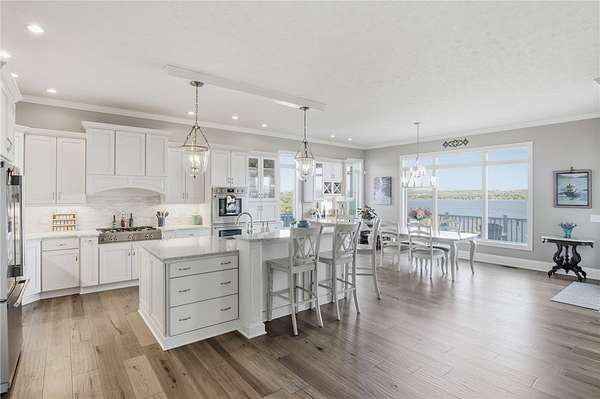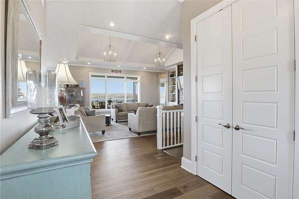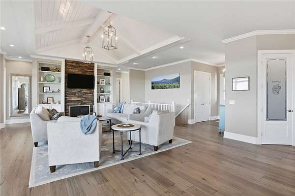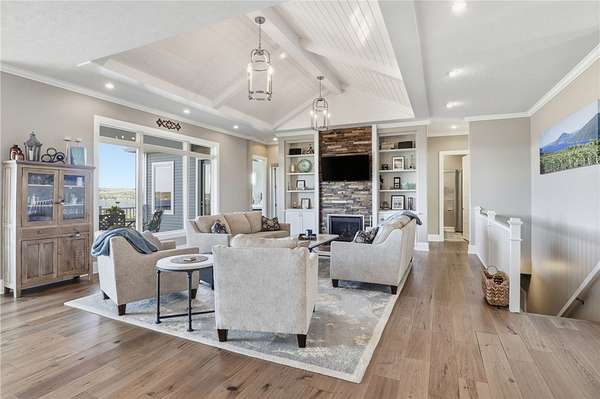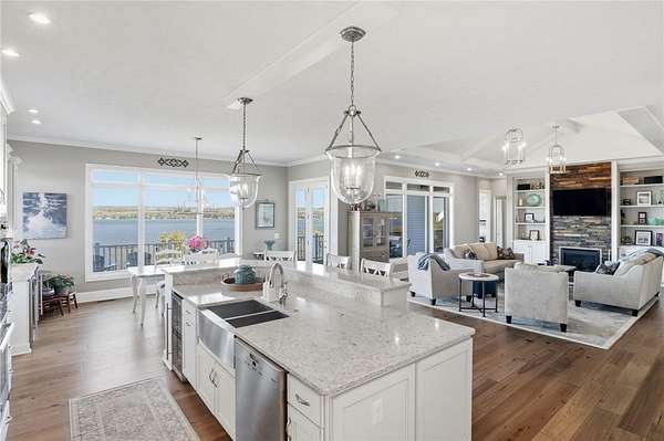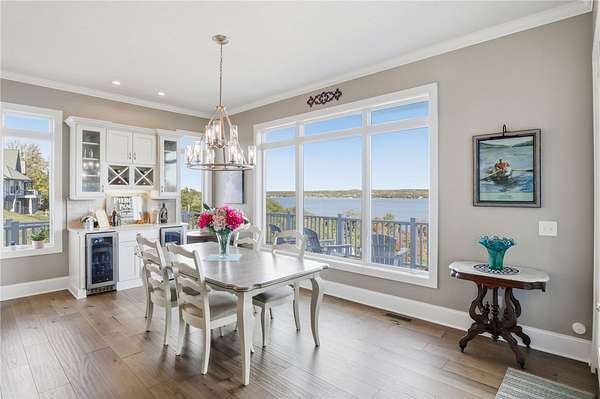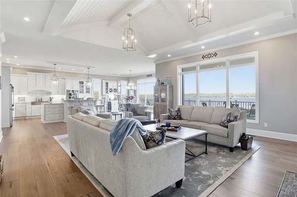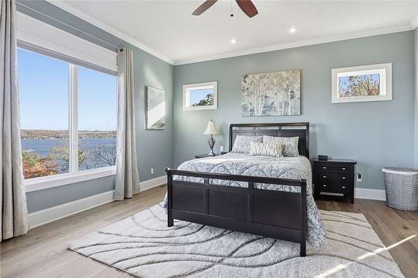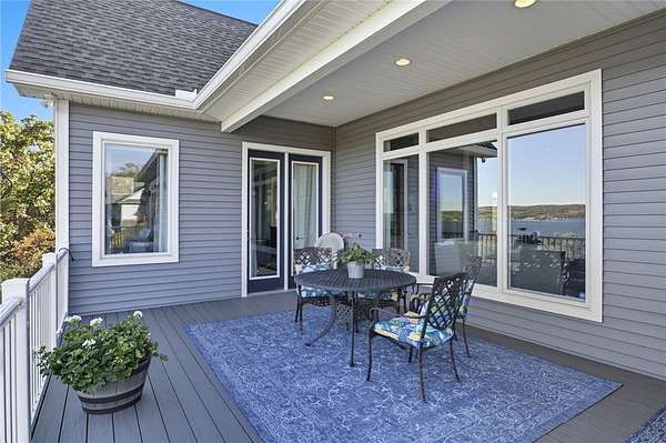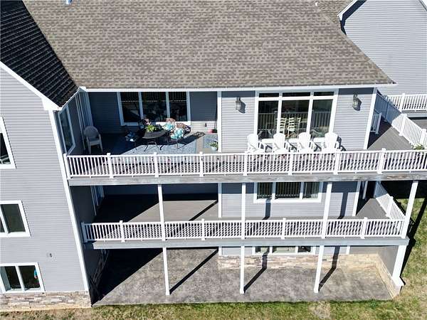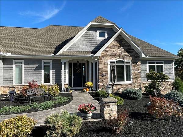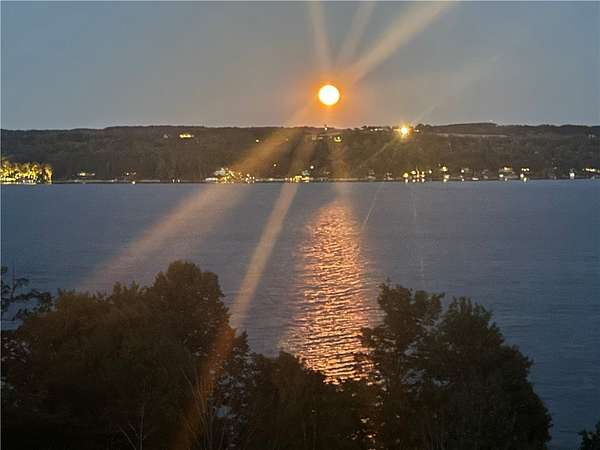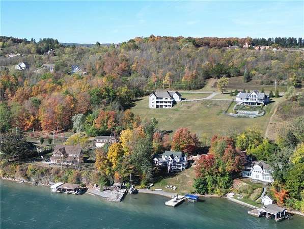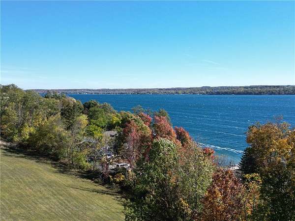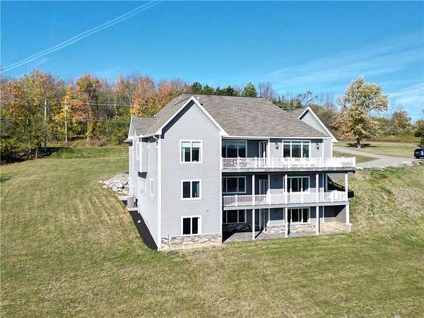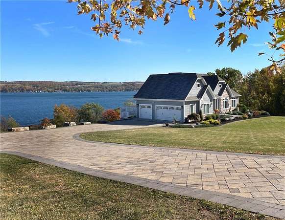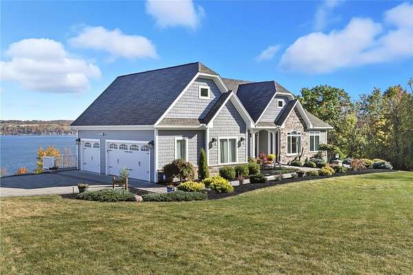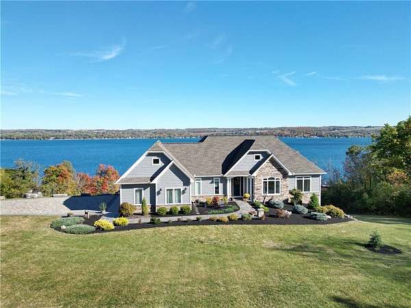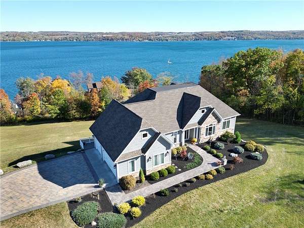 OPEN HOUSE: 1-3 pm Saturday, October 18. Welcome to "Blue View!" Custom built 2017 residence with stunning panoramic Canandaigua Lake views, single level convenience, plus added realms for family and friends. Main floor primary suite with lake views, walk-in closet, luxury bathroom, and door to a large deck overlooking the lake. Two additional main floor bedrooms with full bathroom. Lake facing, upgraded, chef's kitchen with white cabinetry, quartz counters, high end appliances, large island with breakfast bar, walk-in, custom pantry, plus dining area that opens to the vaulted ceiling Great room featuring the wood accented, gas fireplace & built ins. Upgrades galore: 10 ft ceilings throughout, 8 ft paneled doors, transom windows, hickory hardwood flooring, radius corners...nothing but the best! Mezzanine level offers two additional lake facing bedrooms including bunk room with a special play area and an ensuite bedroom. Other rooms on mezzanine level provide options for an office, exercise room, workroom & storage space. For some added fun, the terrace level includes a pub-style wet bar with a 12-foot live edge maple bar top, refrigerator & dishwasher, and adjacent areas with 3 TVs, fireplace, dining area & golf room with Skytrak simulator system. Enjoy the outdoors with spacious decks, stamped concrete patio, attractive paver driveway, and professionally landscaped 1.9 acres setting adjoining woods. Attached 3 car finished garage, all public utilities: gas, water, sewer, high-speed Internet. Sq ft per appraisal. Low-maintenance composite decks and vinyl siding. Conveniently located in the the Heart of the Finger Lakes Region near downtown Canandaigua amenities, marina with boat launch, Onanda Park for swimming, kayaking & hiking, Bristol Mountain Ski Resort, Wegmans, CMAC, wineries, festivals!