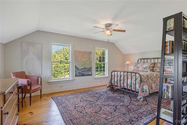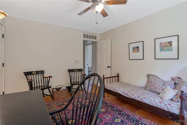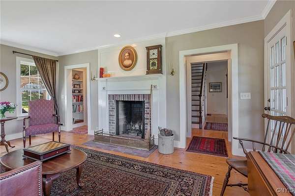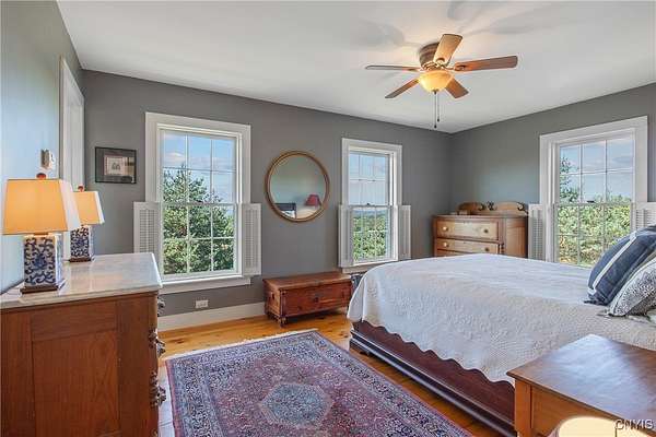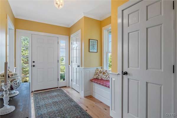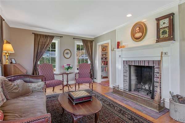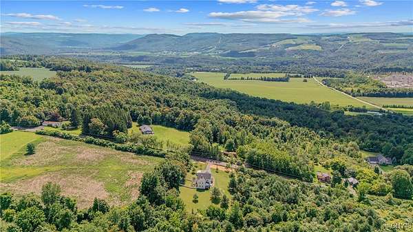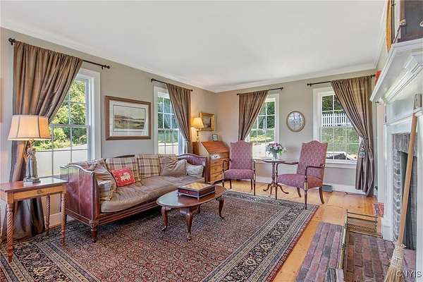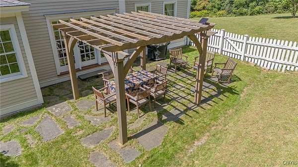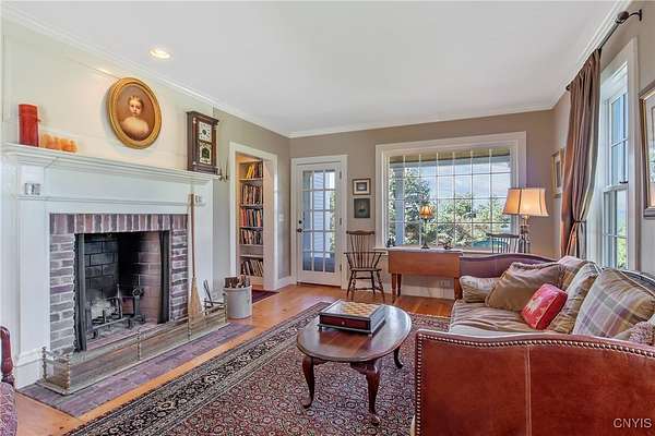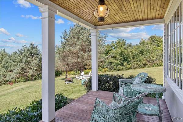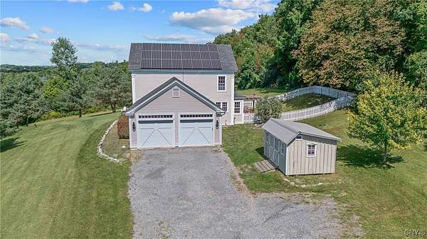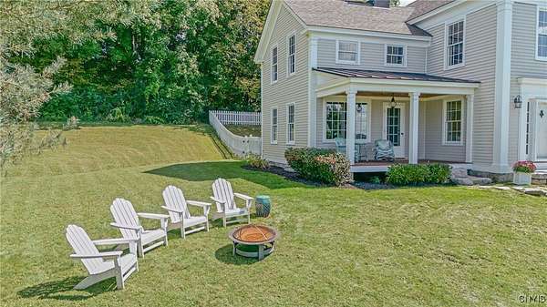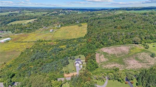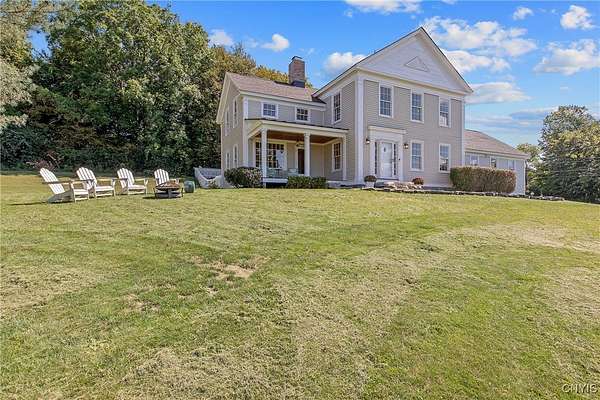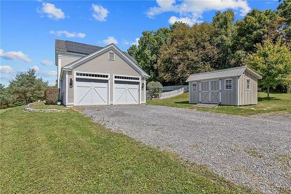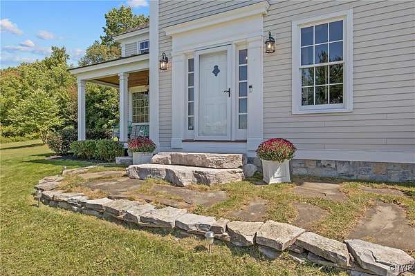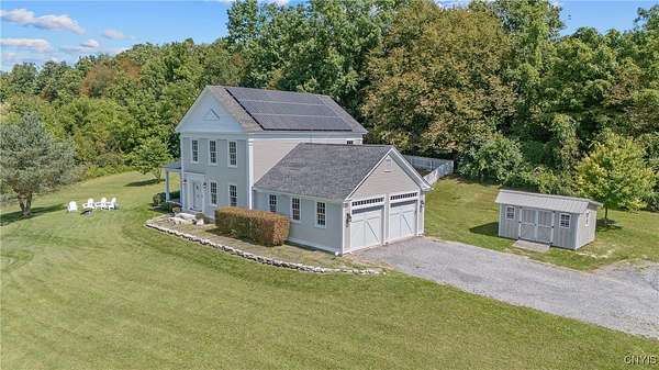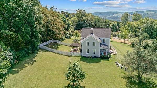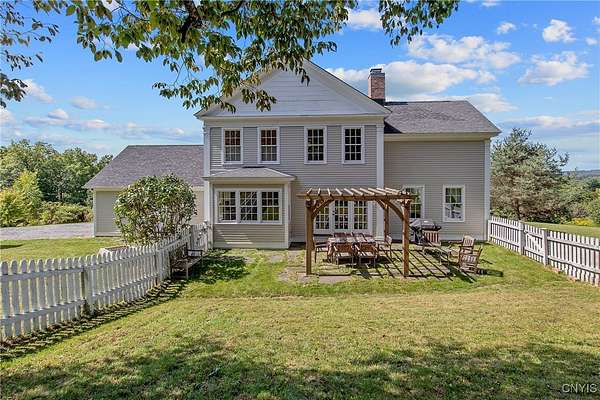 Classic American Home on 6.7 acres with sweeping views. Welcome to this mill built architectural gem featuring 4 bedrooms, 2 1/2 baths and 2342 sq. ft. of thoughtfully designed living space. Nestled on 6.7 acres, the property is a nature lover's paradise with wooded walking trails, a creek, raspberry bushes and endless opportunities for birdwatching --- all framed by spectacular sunsets and panoramic views that stretch for miles. Step inside to an extra wide foyer with built-in seating. Natural light fills the comfortable family room. The formal dining room opens directly to the pergola covered patio and fenced backyard. The beautifully appointed formal living room features a woodburning fireplace, flanked by custom bookcases with access to the charming covered front porch and stunning exterior detailing. The fully applianced eat-in kitchen is designed for everyday living and entertaining and features a huge central island, abundant cabinetry, pantry and convenient mudroom with tile floors, Dutch door and laundry hookup. A second laundry area is located in the basement which also provides an abundance of storage. Upstairs you will find four spacious bedrooms with large closets, two full baths and a new master shower. Wide pine floors and transoms over doors and windows add timeless charm throughout both levels. Additional highlights include: oversized two car garage with access to storage space. Handy 10x14 storage shed. Recently installed air conditioning. Stone patio and fenced backyard. Plantation shutters in the main level and primary suite. A short 15 minute drive to Skaneateles, Syracuse University and Hospitals. This beautifully maintained home blends classic American architecture with modern updates offering space, character and a setting you'll love to come home to.