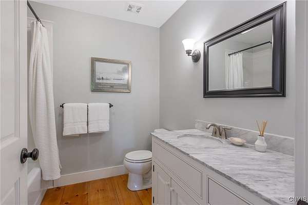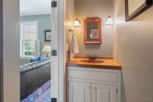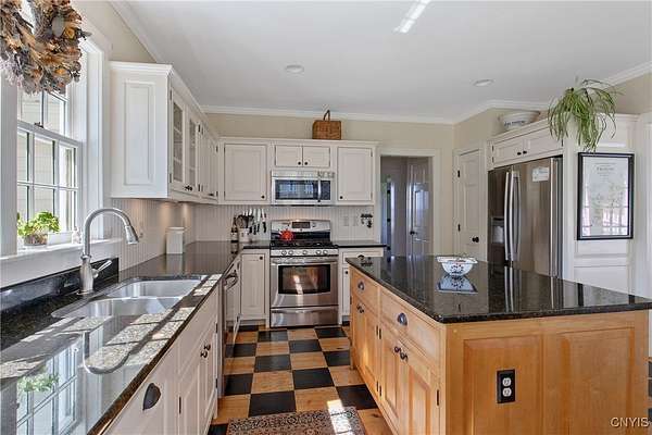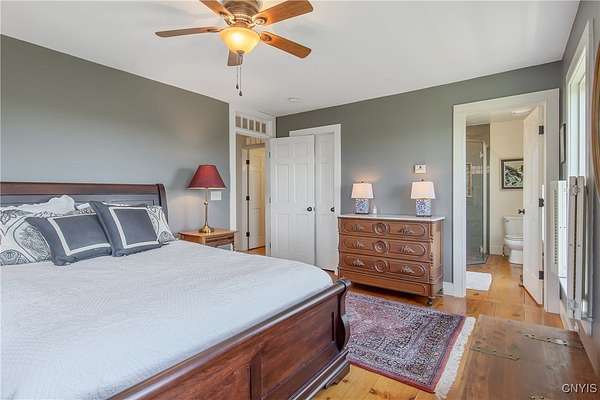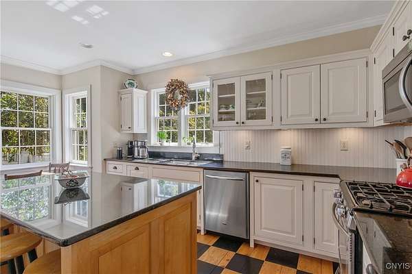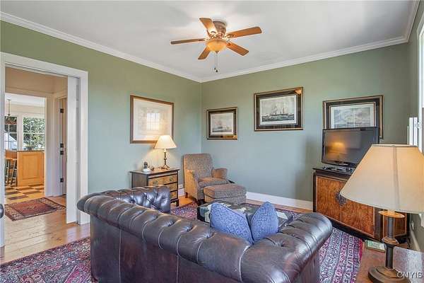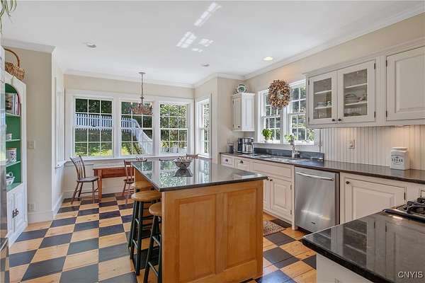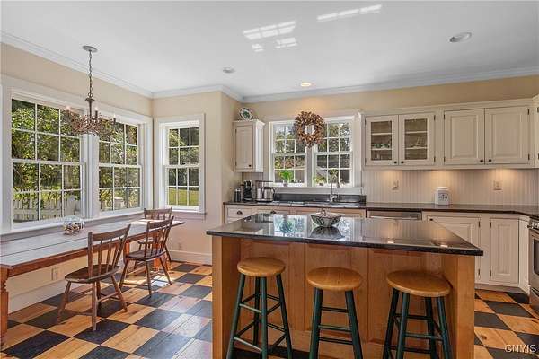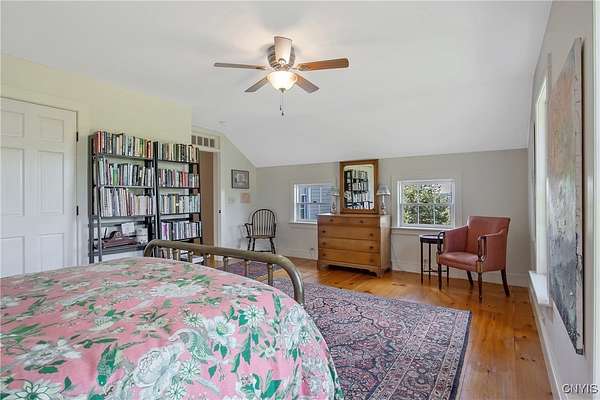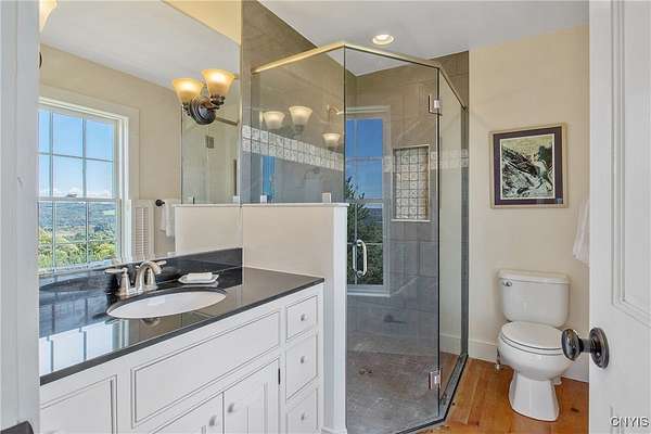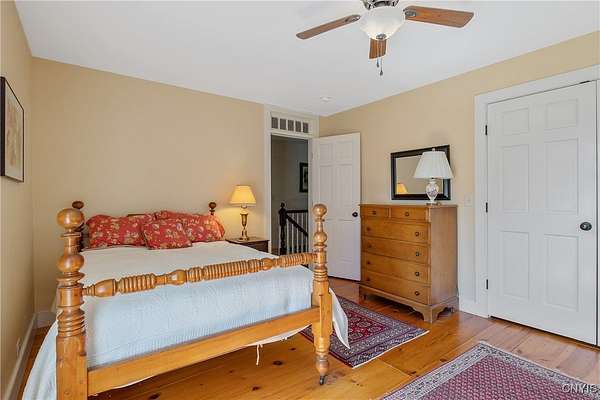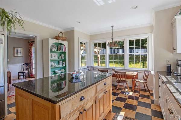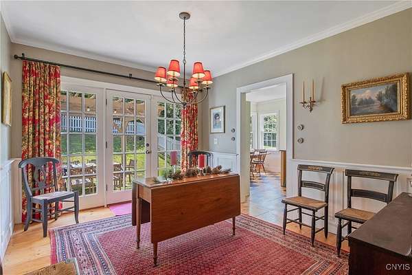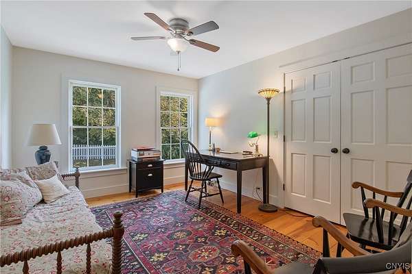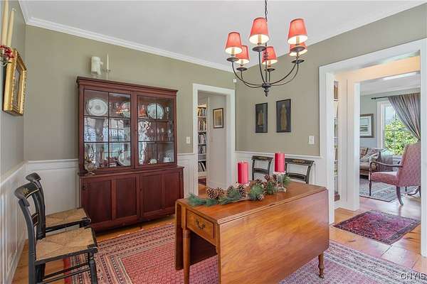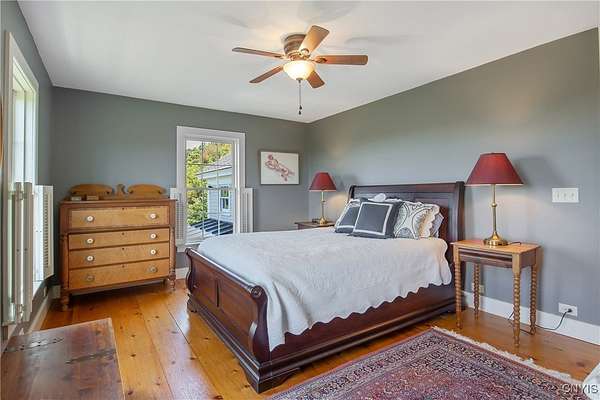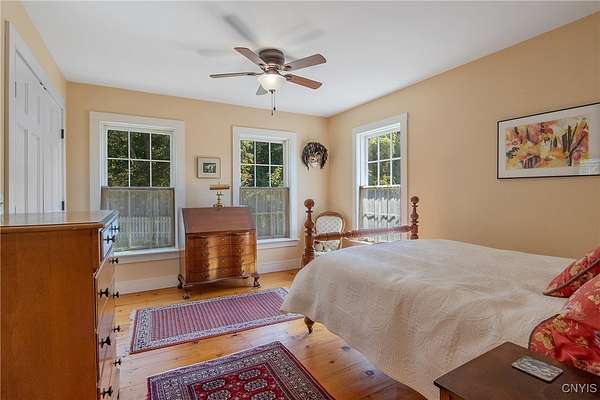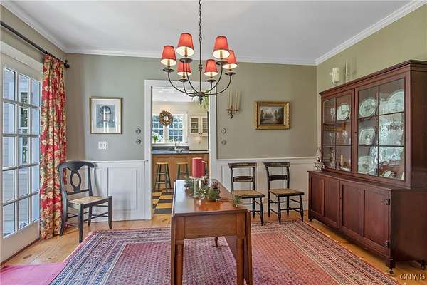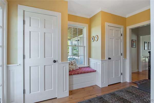 Classic American Home on 6.7 acres with sweeping views. Welcome to this mill built architectural gem featuring 4 bedrooms, 2 1/2 baths and 2342 sq. ft. of thoughtfully designed living space. Nestled on 6.7 acres, the property is a nature lover's paradise with wooded walking trails, a creek, raspberry bushes and endless opportunities for birdwatching --- all framed by spectacular sunsets and panoramic views that stretch for miles. Step inside to an extra wide foyer with built-in seating. Natural light fills the comfortable family room. The formal dining room opens directly to the pergola covered patio and fenced backyard. The beautifully appointed formal living room features a woodburning fireplace, flanked by custom bookcases with access to the charming covered front porch and stunning exterior detailing. The fully applianced eat-in kitchen is designed for everyday living and entertaining and features a huge central island, abundant cabinetry, pantry and convenient mudroom with tile floors, Dutch door and laundry hookup. A second laundry area is located in the basement which also provides an abundance of storage. Upstairs you will find four spacious bedrooms with large closets, two full baths and a new master shower. Wide pine floors and transoms over doors and windows add timeless charm throughout both levels. Additional highlights include: oversized two car garage with access to storage space. Handy 10x14 storage shed. Recently installed air conditioning. Stone patio and fenced backyard. Plantation shutters in the main level and primary suite. A short 15 minute drive to Skaneateles, Syracuse University and Hospitals. This beautifully maintained home blends classic American architecture with modern updates offering space, character and a setting you'll love to come home to.