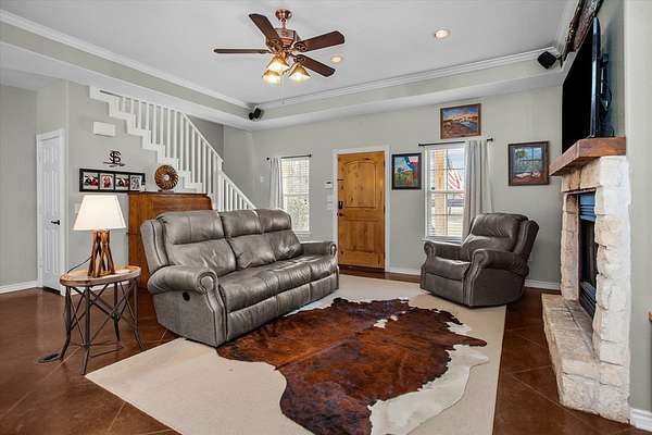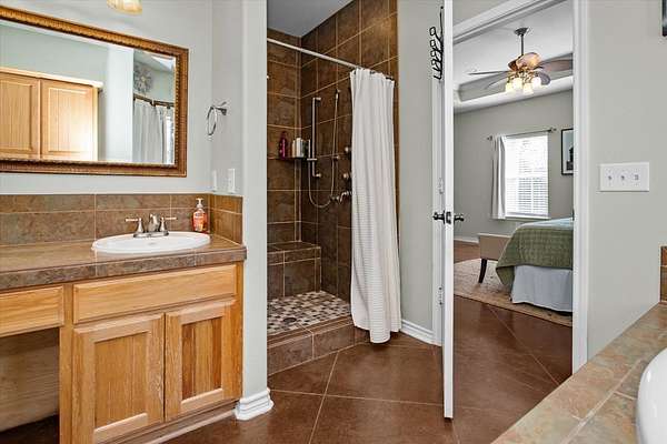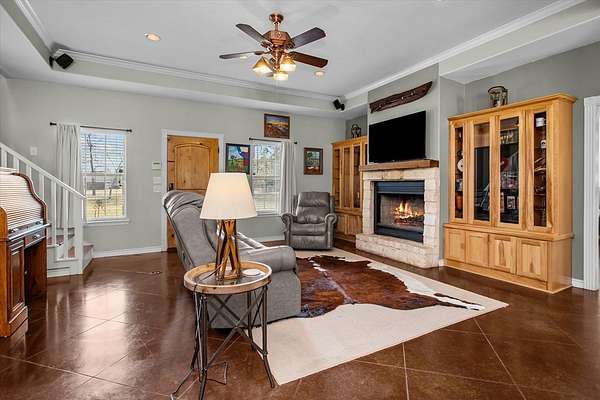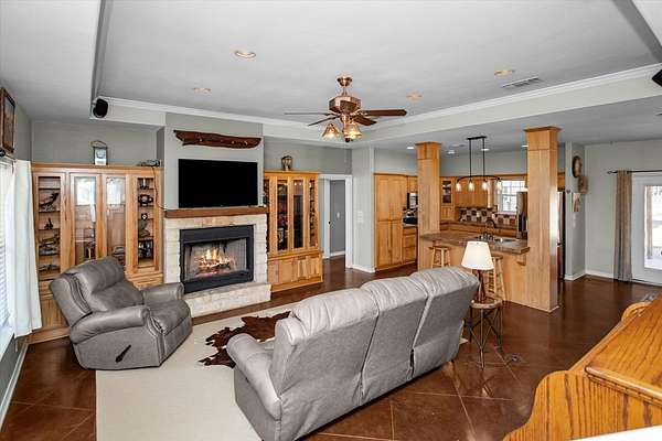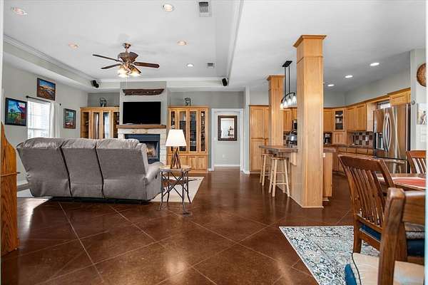 - Blinds, Bookcases, Built-In Features, Ceiling Fan(s), Jetted Tub, Kitchen Island, Open Floorplan, Primary-Lower Level, Split Bedrooms