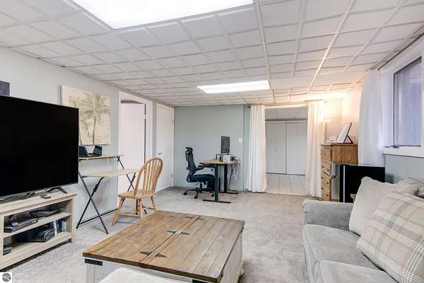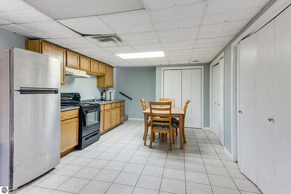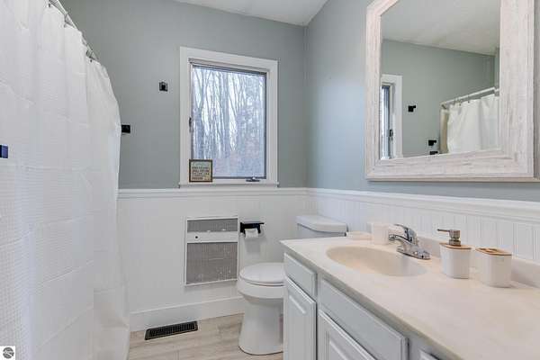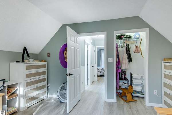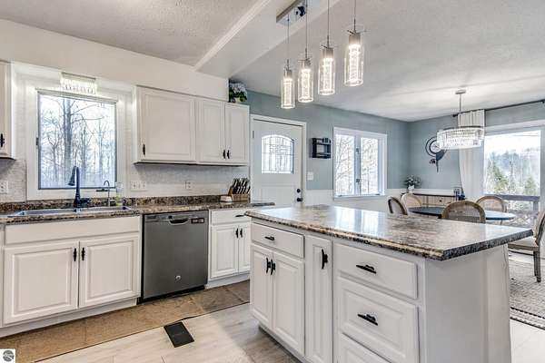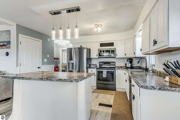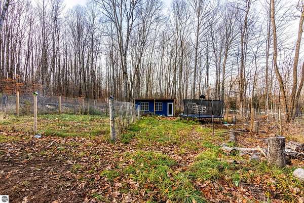 This property offers 2.75 acres of land, complemented by a spacious four-bedroom, three-bath chalet and an oversized three-car garage just a few minutes from town and year-round recreation. You'll appreciate recent updates that include updated lighting, refrigerator, mother of pearl backsplash, luxury vinyl plank flooring, and reverse osmosis filtration for both the refrigerator and cold-water tap. On the main floor there is a welcoming great room, with a natural stone fireplace & access to a wrap-around deck. The island kitchen offers ample space for preparing meals for gatherings. The laundry is conveniently located on the main level, along with a bedroom and a full bath for ease of daily living. Upstairs, you will find two additional bedrooms share a full bath. The lower level serves as a complete separate living or guest suite, featuring a bedroom or office, a 3/4 bath, a second full kitchen, and a family room with wood stove--accessible from an exterior entrance and suitable for use as a game room or extra living space. The expansive garage accommodates multiple vehicles and equipment and includes a wood stove for heating. The generous yard ensures privacy, and the fenced garden area will enable you to test your green thumb. An additional garden building provides space for storage or may serve as a chicken coup. The property is conveniently located just minutes from the charming village of Bellaire, Shanty Creek Resort, the Cedar River and some of the region's finest lakes and trails.