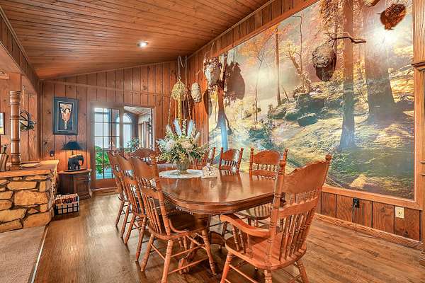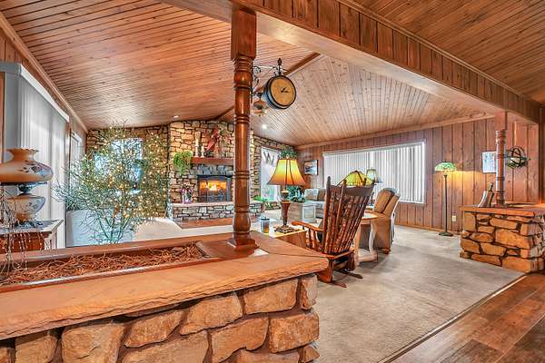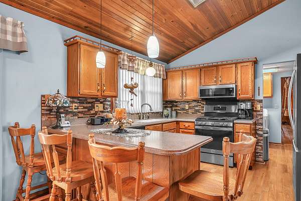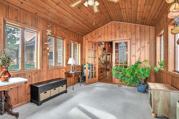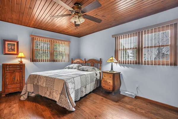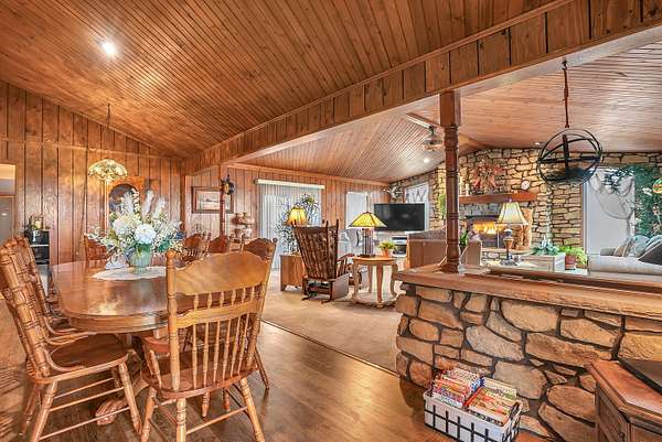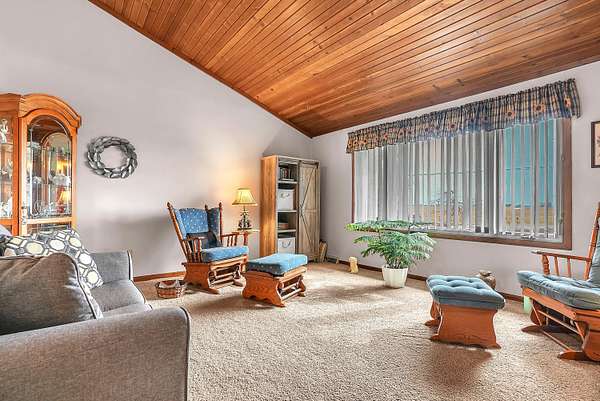 Welcome home to this stunning farmhouse-style ranch offering over 4,000 square feet of living space, perfectly nestled on 2 peaceful acres with private trails leading to a scenic pond. The main level features 2,296 square feet of thoughtfully designed space including 3 spacious bedrooms and 2 baths. The gorgeous kitchen is truly the heart of the home, offering abundant cabinetry and room to gather. A warm and inviting family room with fireplace creates the perfect setting for cozy evenings, while wood vaulted ceilings add character and charm throughout. The formal dining area provides the ideal space for hosting family and friends. One of the showstoppers of this home is the beautiful 24 x 24 sunroom filled with natural light and breathtaking views of the property. Step outside onto the large deck with gazebo and enjoy peaceful mornings or relaxing evenings overlooking the pond. The 1,720 square foot basement offers incredible additional space for recreation, storage, or future finishing potential. If you've been dreaming of country living with room to roam, scenic views, and timeless farmhouse charm -- this is it.