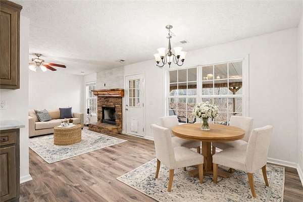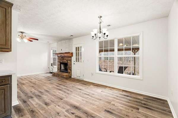 Welcome to peaceful country living in Oxford GA, nestled on a private wooded lot of nearly 3 acres and no HOA! This beautifully updated ranch features luxury vinyl plank flooring throughout, fresh neutral paint, and an open concept layout. The kitchen and bathrooms have been updated with new quartz countertops. The seamless flow between the kitchen, breakfast area, and living room makes the home ideal for both everyday living and entertaining. The primary suite has generous space for furnishings, and an en suite bath with a separate soaking tub and shower. A spacious walk-in closet with a custom shelving system adds both function and style. Secondary bedrooms offer great natural light and flexibility for guests, a home office, or additional living space. Enjoy privacy in the wooded backyard from the covered patio. An additional outbuilding provides extra storage or workshop potential. Conveniently located with easy access to Covington, Conyers, and I-20, this home offers quiet country living with shopping and dining a short drive away.