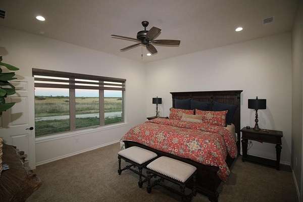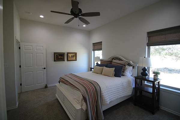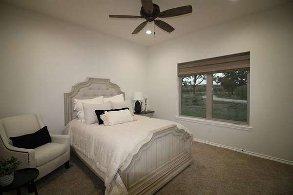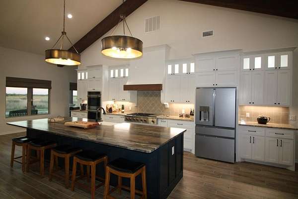 The ranch-style home has vaulted ceilings, an open-concept floor plan, and exquisite custom touches of granite countertops, vaulted ceilings, dramatic windows throughout, and exposed beams. A chef's kitchen with premier appliances, custom cabinets, a double oven, a walk-in pantry, and a large island featuring a magnificent granite countertop. The living area is refined with a stone gas fireplace, built-in cabinets, and decorative lighting. The master bedroom also features large windows for sunrise views, dual vanities, a garden tub, a custom shower, and an ample walk-in closet. The remaining three bedrooms are spacious and offer large closets. There is additionally a safe room and laundry room, and this home has a Generac generator. The home has a large attached insulated garage that has electricity and is piped for plumbing.