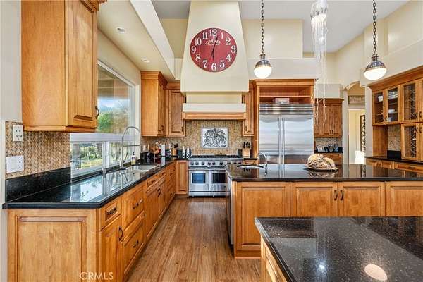 Beautiful gourmet kitchen with an abundance of wood cabinets and a six-burner Viking stove, Sub Zero refrigerator, and a large walk-in pantry.