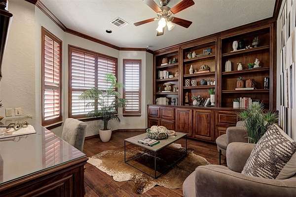 Inside, the home is equally exceptional. Soaring 10-12' ceilings, rich crown molding, custom built-ins, and warm hardwoods set the tone. The open kitchen features double ovens, custom cabinetry, and granite counters--perfectly positioned for flow and function. A spacious home office with solid cherry woodwork offers a polished work-from-home setup, while the upstairs bonus room is a haven for kids, teens, or game nights.