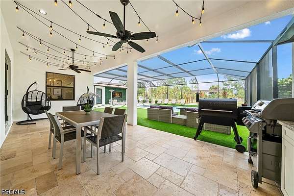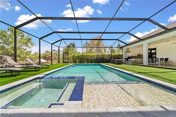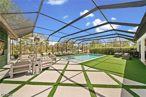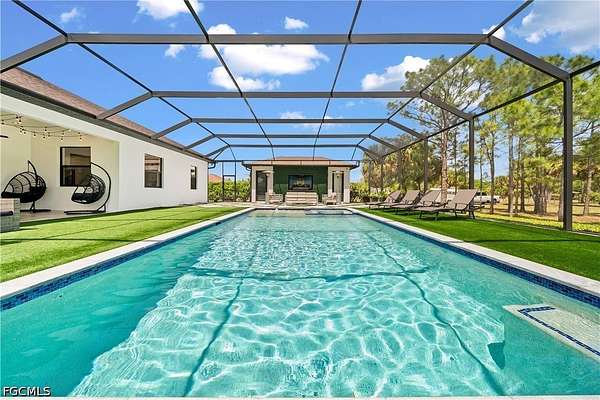 Welcome to a truly one-of-a-kind property that redefines what it means to live in Golden Gate Estates. This is not your typical home. This is a private retreat designed for lifestyle, entertainment, and comfort all in one. Situated on an oversized lot, this property offers space, privacy, and a setup that is incredibly hard to find. The highlight is the fully equipped pool house, featuring its own bathroom, dry cedar sauna, steam shower, and dedicated storage space. Whether you are hosting guests, creating a wellness retreat, or simply enjoying your own private escape, this space sets this home apart from anything else on the market. The outdoor living experience is unmatched. Enjoy a resort-style saltwater pool and spa, built in 2023, complete with both electric and propane heating. The expansive screened lanai with artificial turf creates the perfect setting for relaxing or entertaining year-round. The outdoor kitchen and entertainment area, along with a fully equipped pool house featuring a TV and sound system, make this property ideal for hosting and enjoying the Florida lifestyle. Inside, the home offers a functional and desirable layout with 3 bedrooms, a den, and 3 bathrooms, with the third bathroom located in the spa area. Tile flooring runs throughout the home, and the primary suite includes custom built-in closet organizers for added convenience and storage. This property has also been thoughtfully upgraded for efficiency and long-term value. A whole house reverse osmosis system was installed in 2024, along with UV filtration on the air handlers, providing enhanced water and air quality. The home also features a full irrigation system to maintain the grounds with ease. Additional highlights include a newly painted exterior, a recently sealed driveway, a covered carport, and a fully fenced front entrance with electric gates and keypad access, offering both security and privacy. Opportunities like this are rare. With its combination of luxury features, outdoor living, and unique amenities, this home stands out in a market full of standard properties. If you have been searching for something different, something elevated, and something that truly offers a lifestyle, this is the one.