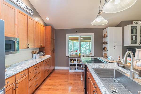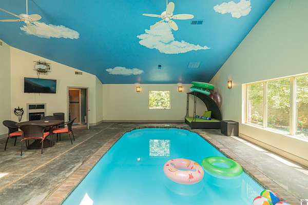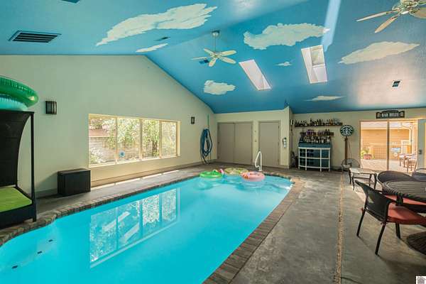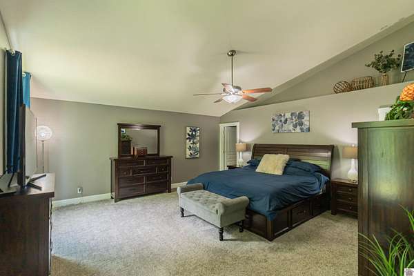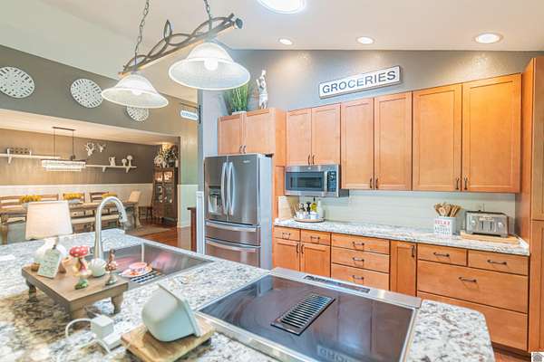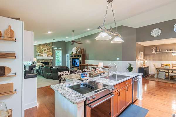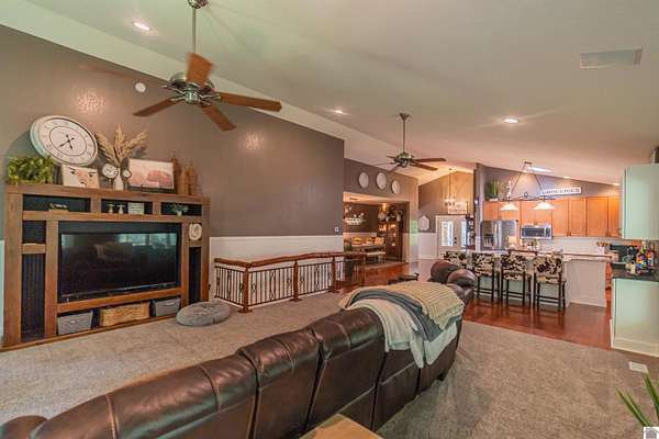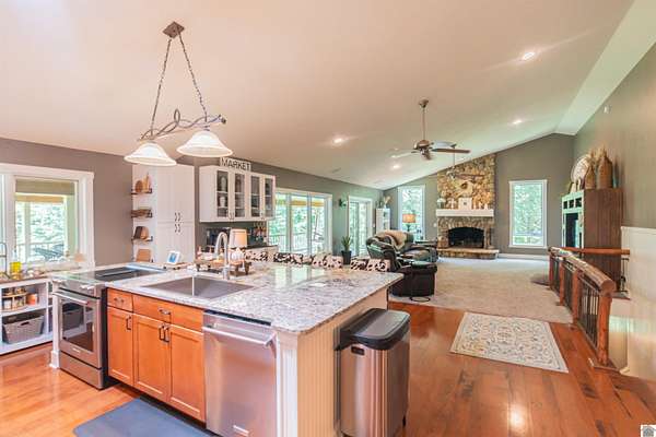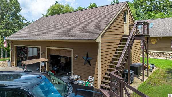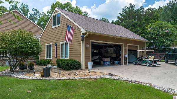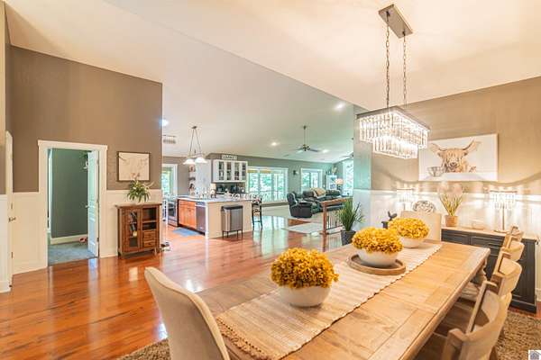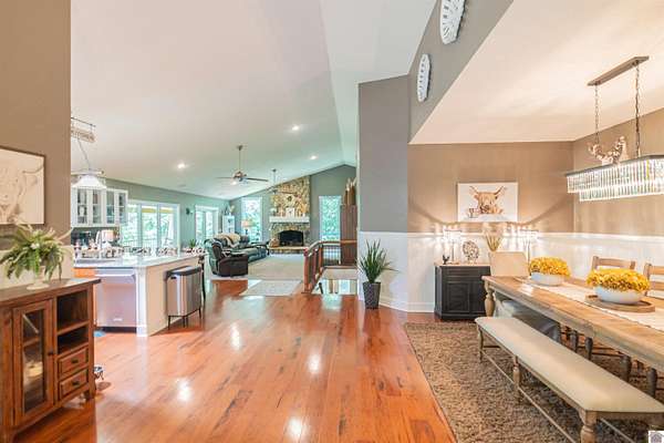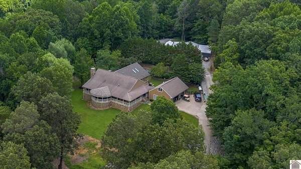 Stunning 5+ Acre Retreat Near Lake Barkley with Indoor Pool! Welcome to your dream home! Nestled on over 5 beautifully wooded acres just 3 minutes from Dryden Creek Boat Ramp, this spacious single-family home offers comfort, style, and privacy. Step inside to discover an open-concept layout featuring a vaulted ceiling great room with a striking stone fireplace. The heart of the home is the expansive kitchen and dining area, designed for gatherings with ample counter and cabinet space. The large master suite is a true retreat, boasting a walk-in closet, luxurious jetted tub, tiled shower, and a double vanity. Enjoy year-round relaxation with an in-ground indoor pool and dedicated full bath--ideal for entertaining or unwinding after a long day. The fully finished basement adds even more living space with a spacious family room and office. Additional highlights include: 3-car attached garage, 50 x 60 workshop with carport and abundant storage, fenced backyard for pets or play.