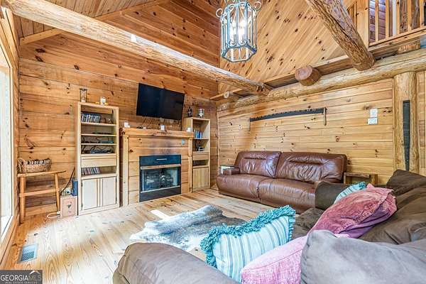 Unique cabin with stunning architecture and craftsmanship! The notched tree beams really set this home character above the rest. Private residence or Airbnb/VRBO short term rental. Your choice. Large groups love the value and spacious experience of up to 7 beds, a large kitchen and eating area, can sleep 12+, 10+ parking spaces and the huge, level grassy backyard with a detached garage where kids and pets can run and play. Makeover the backyard garage into a cute event space however you can imagine, or use it for great extra storage! All furnishings, appliances, hot tub, and generator included. Grand Chateau is a beautiful, large timber log cabin on 3 stories. Long beautiful paved driveway with a babbling creek and stunning hardwood forest! Bedrooms, bathrooms, and central heat and air on every floor. Enter the cabin on the front terrace level, into a spacious living room with leather couch, board games and TV. This room could also be a front reception area for guests and events. On the same level, you will find a game room with a basketball game, 2 bedrooms (1 with an en suite full bath) and a half bath. On the second level (main floor), you will find a spacious and open kitchen, equipped for all your cooking needs to show off your culinary skills, and a large dining table built on site with trees from the Appalachian forest! A large living room with 2 large couches, a huge LED TV, a master bathroom with a king size bed, french doors to the back deck (with new grill), an en suite bath with a step-less entry tile shower, and water closet. On the top floor, there are 2 spacious bedrooms with vaulted ceilings: one room with king size bed, the other room with a set of bunk beds, 1 queen bed and 1 single bed, game console, as well as a full hall bathroom with a relaxing jacuzzi tub. Roast marshmallows or sip a glass of wine at the fire pit while relaxing Adirondack chairs. Let kids and pets run and play in the large, grassy, and totally private fenced backyard. Play volleyball, badminton, lawn darts, horseshoes, cornhole, you name it! Short-term rental coaching, photographs, and maintenance contractors provided by owner. Current bookings must be honored. This cabin is very easy to access and is conveniently located near Dahlonega. 5 to 30 minutes away from multiple wineries, wedding venues, hiking and waterfalls, kayaking, canoeing, tubing and fishing down the river, gold and gem mining, 10 minutes to downtown Dahlonega square with all its restaurants, shops, festivals and antiquing, and 10 minutes to the beautiful Lake Zwerner Trail for hiking, kayaking and fishing. An easy drive from Atlanta. Area attractions draw a crowd, and within easy reach of Atlanta, Alpharetta, Helen, Jasper, Blue Ridge, Amicalola Falls State Park, the start of Appalachian Trail, Tallulah Gorge, Clayton, North Carolina, and more. You won't find an easier setup for beginning your journey to wealth. Please no drive-bys or walkthroughs of the property without an appointment! This is an operating business and guest privacy must be respected. All furniture, personal property and other items seen in the pictures are included in the sale, ready to move in.