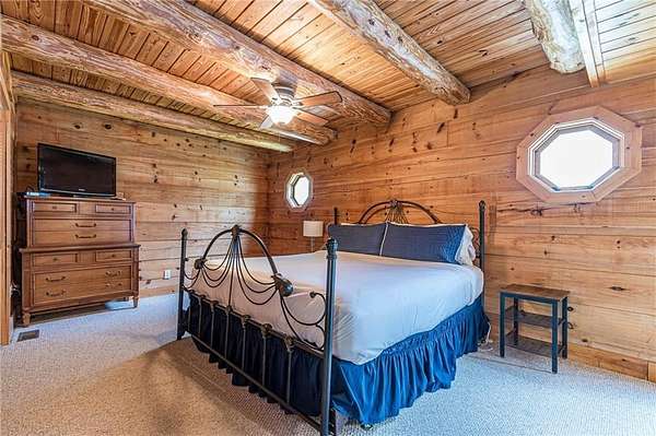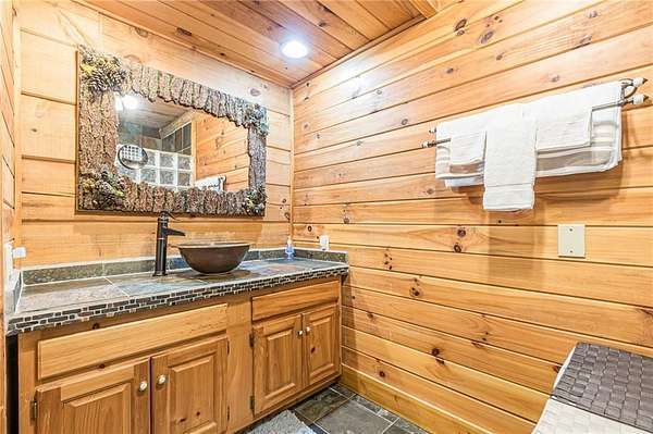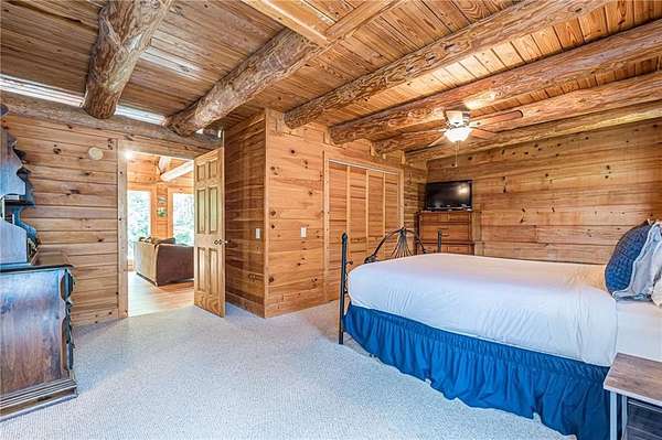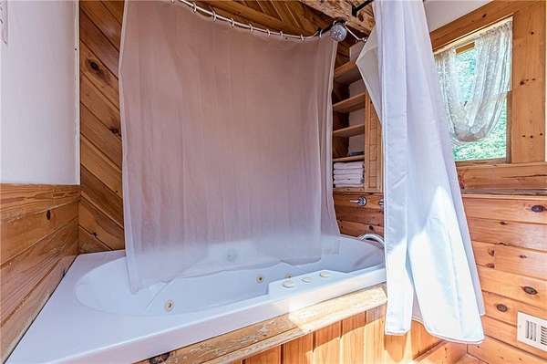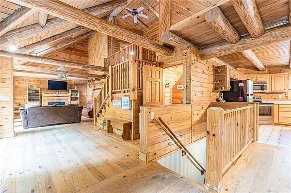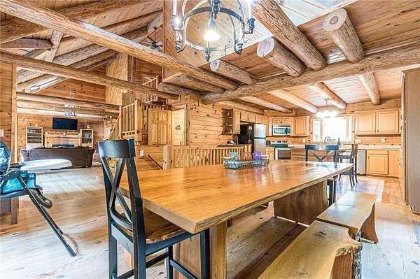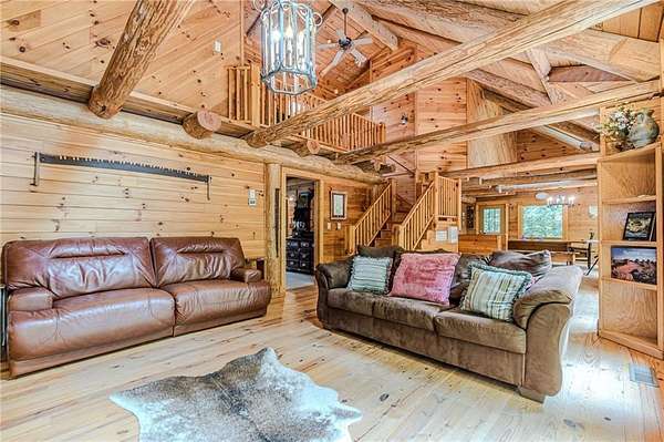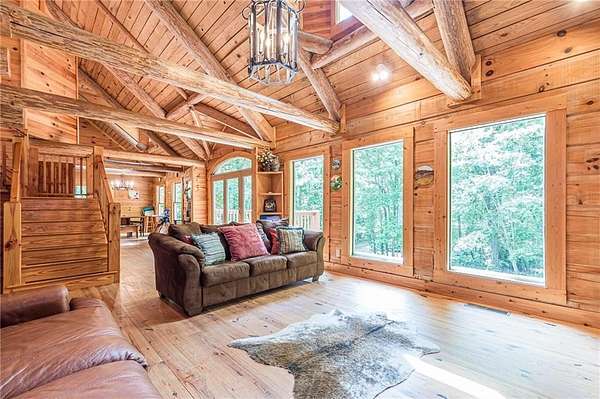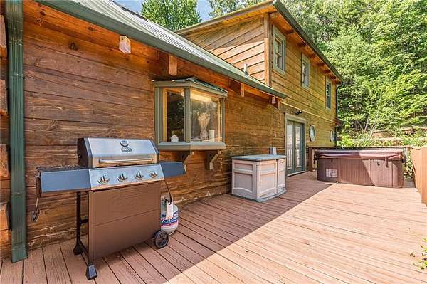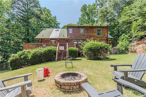 Unique cabin with stunning architecture and craftsmanship! The notched tree beams really set this home's character above the rest. Private residence or Airbnb/VRBO short term rental. Your choice. Large groups love the value and spacious experience of up to 7 bedrooms, a large kitchen and eating area, can sleep 12+, 10+ parking spaces and the huge, level grassy backyard with a detached garage where kids and pets can run and play. Makeover the backyard garage into a cute event space however you can imagine, or use it for great extra storage! All furnishings, appliances, hot tub, and generator included. Grand Chateau is a beautiful, large timber log cabin on 3 stories. Long beautiful paved driveway with a babbling creek and stunning hardwood forest! Bedrooms, bathrooms, and central heat and air on every floor. Enter the cabin on the front terrace level, into a spacious living room with leather couch, board games and TV. This room could also be a front reception area for guests and events. On the same level, you will find a game room with a basketball game, 2 bedrooms (1 with an en suite full bath) and a half bath. On the second level (main floor), you will find a spacious and open kitchen, equipped for all your cooking needs to show off your culinary skills, and a large dining table built on site with trees from the Appalachian forest! A large living room with 2 large couches, a huge LED TV, a master bathroom with a king size bed, french doors to the back deck (with new grill), an en suite bath with a step-less entry tile shower, and water closet. On the top floor, there are 2 spacious bedrooms with vaulted ceilings: one room with king size bed, the other room with a set of bunk beds, 1 queen bed and 1 single bed, game console, as well as a full hall bathroom with a relaxing jacuzzi tub. Roast marshmallows or sip a glass of wine at the fire pit while relaxing Adirondack chairs. Let kids and pets run and play in the large, grassy, and totally private fenced backyard. Play volleyball, badminton, lawn darts, horseshoes, cornhole, you name it! Short-term rental coaching, photographs, and maintenance contractors provided by owner. Current bookings must be honored. This cabin is very easy to access and is conveniently located near Dahlonega. 5 to 30 minutes away from multiple wineries, wedding venues, hiking and waterfalls, kayaking, canoeing, tubing and fishing down the river, gold and gem mining, 10 minutes to downtown Dahlonega square with all its restaurants, shops, festivals and antiquing, and 10 minutes to the beautiful Lake Zwerner Trail for hiking, kayaking and fishing. An easy drive from Atlanta. Area attractions draw a crowd, and within easy reach of Atlanta, Alpharetta, Helen, Jasper, Blue Ridge, Amicalola Falls State Park, the start of Appalachian Trail, Tallulah Gorge, Clayton, North Carolina, and more. You won't find an easier setup for beginning your journey to wealth. Please no drive-bys or walkthroughs of the property without an appointment! This is an operating business and guest privacy must be respected. All furniture, personel property and other items seen in the pictures are included in the sale, ready to move in.