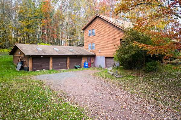 Nestled on a sprawling 6.6-acre parcel of private land, this saltbox-style offers the perfect blend of classic architectural charm and serene natural surroundings. The saltbox home is characterized by its long, pitched roof and slopes down to the back, creating a unique and recognizable profile. The exterior is clad in traditional wood siding, painted in warm inviting tones that complete the lush greenery surrounding the property. Large windows allow ample natural light to fill the interior spaces while providing picturesque view. Step inside to discover the blend of rustic elegance and modern comfort. The main level features and open concept living area with exposed beams and hardwood floors, creating a warm atmosphere. The kitchen with its cooper ceiling and updated appliances offers plenty of opportunity for entertainment, bonus is the charming wood stove in the corner with a brick wall that completes this room. The second floor has 2 bedrooms including a generous master bedroom. Well-appointed bathrooms with contemporary fixtures. There is a flexible bonus room for office, studio or guest space. There are 4 indoor garage spaces with a large covered outside carport. Plenty of room for gardens and play area. This is an ideal setting for relaxation on the front porch and entertaining. If you are looking for a perfect sanctuary, comfort, character and to connect with nature, look no further.