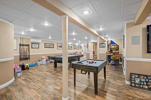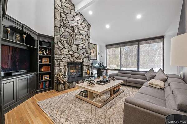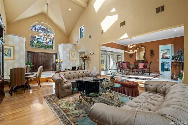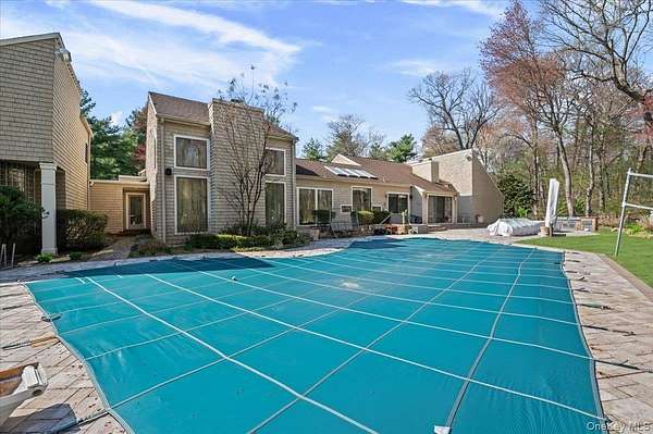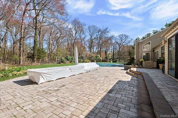 Welcome to 45 Coves Run, a contemporary ranch offering nearly 5,000 square feet of living space on over 2 private acres in the exclusive Coves Run neighborhood of Oyster Bay Cove. A welcoming foyer opens seamlessly into a stunning great room with soaring 30-foot ceilings, creating an impressive yet inviting first impression. The open dining room is ideal for large gatherings, while a cozy den with a wood burning fireplace provides the perfect setting for everyday relaxation. At the heart of the home, the newly renovated eat-in kitchen is thoughtfully positioned and designed for both functionality and style. The primary suite features vaulted ceilings, a private loft ideal for a home office or gym, and an oversized spa-like bathroom with custom fixtures and finishes throughout. The main level also includes four additional bedrooms, three full bathrooms, and a powder room, offering ample space and flexibility. The fully finished lower level expands the home's living space with two additional rooms, two full bathrooms, and a large open area perfectly suited for entertaining. Step outside to a beautifully designed backyard retreat, complete with a built-in outdoor kitchen and an expansive patio with multiple areas for seating and dining. Enjoy resort-style living with a pool, Har-Tru tennis court, grass volleyball court, and a newly built custom playground. Tucked away at the end of a private cul-de-sac in Oyster Bay Cove, this exceptional property offers both privacy and luxury. Located within the Syosset Central School District (Berry Hill Elementary) with low taxes, this is truly a one-of-a-kind opportunity.