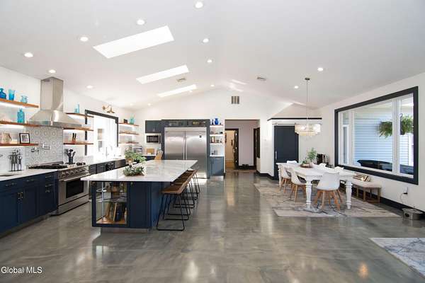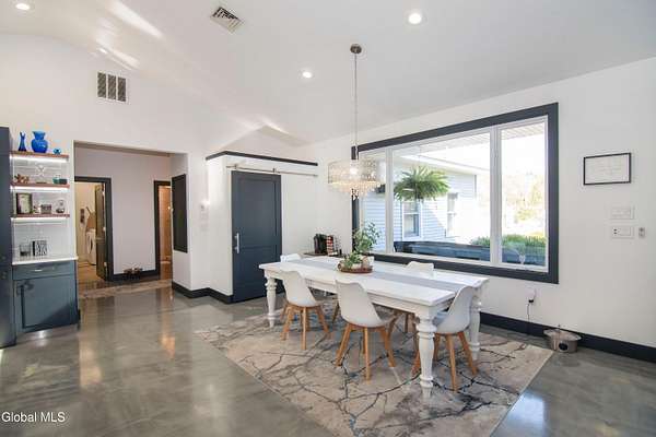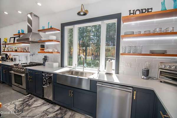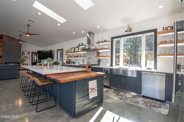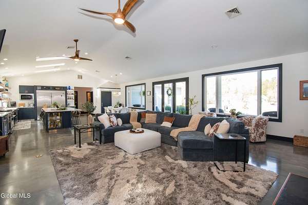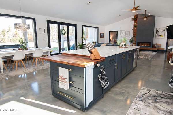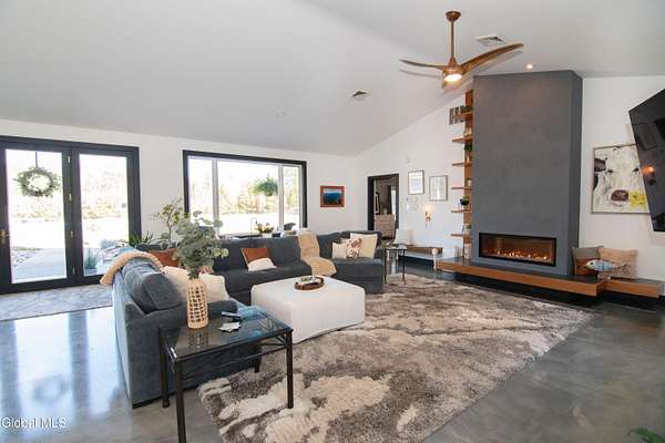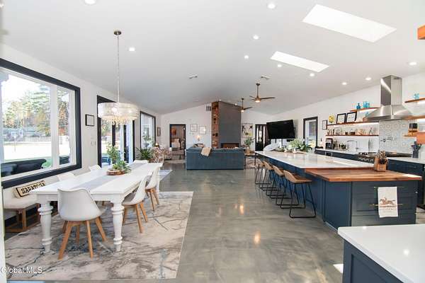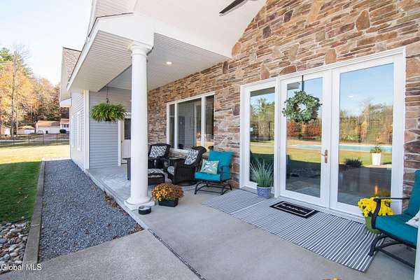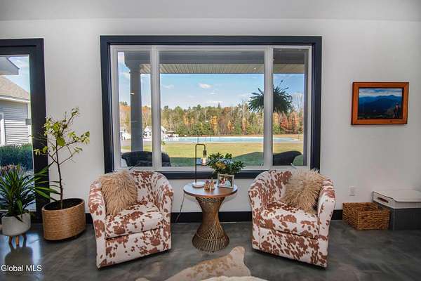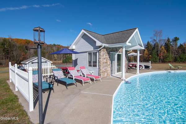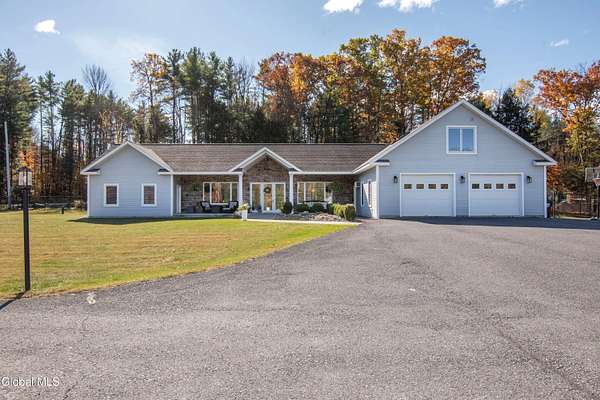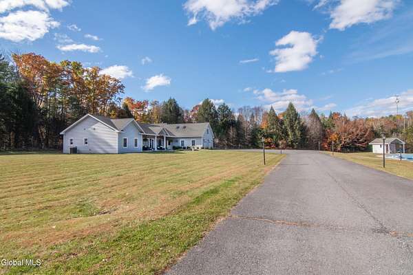 Striking Modern Industrial Design + Wide Open Spaces Inside/Out Make this Greenfield Ranch & Pool Truly Unique and Private, just 4 Miles from Broadway in Saratoga Springs! This thoroughly renovated ranch interior gives ''barndominium'' vibes, offering an efficient layout with a vast, cathedral centralized great room and two wings holding 4 bedrooms that each have an ensuite bathroom. The primary suite is exceptionally private, spacious and well-appointed! Highlights include a floor to ceiling gas linear ''Fire Glass'' fireplace, a showstopping kitchen w/ 12' marble island and Acacia butcher block, quartz perimeter top, floating shelves, backsplash, upgraded stainless appliances & walk-in pantry, radiant flooring t/o + central A/C, gated entry, 5 stunning updated tiled bathrooms. Fourth BR is versatile w/ exterior access through mudroom for other uses! Pool provides year-round water feature and seasonal fun w/ two pool houses offering a kitchenette, powder bath and lounge space. Oversized garage provides extra storage and the home has a full automatic backup generator for peace of mind. Home was originally built to be ADA compliant throughout. Enjoy peaceful country living just 4 mi. to Downtown Saratoga Springs in the Town of Greenfield and Saratoga School District, less than a mile from the Award-winning Greenfield Elementary School. There is a town post office, Stewarts, Greenfield Animal Hospital, Fierro's Pizza, Greenfield Wine & Liquor, Fossil Stone Winery, Twin Leaf Farms, Mihalek's Garage and other businesses all within a mile. A weekly farmers market takes place all summer long and the town offers popular youth recreation programs, the Brookhaven Golf Course, and many community activities throughout each year. Contingent upon sellers securing closing on house they have under contract. Prefer to close in 4-6 weeks.
