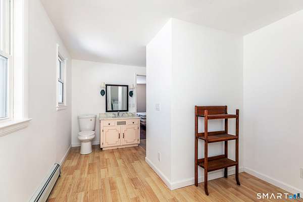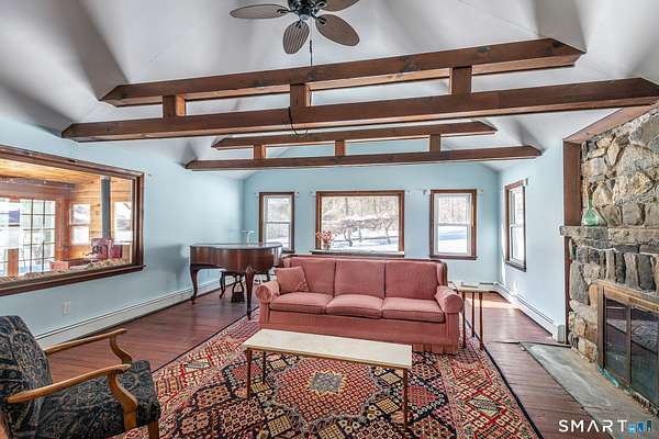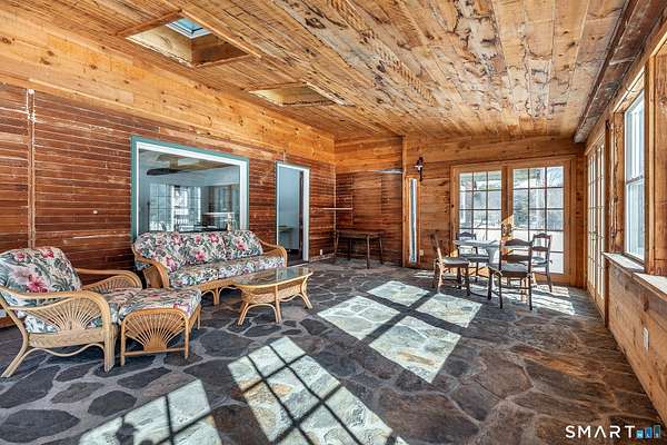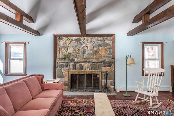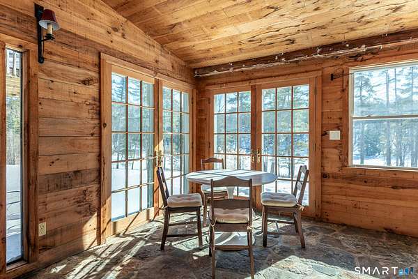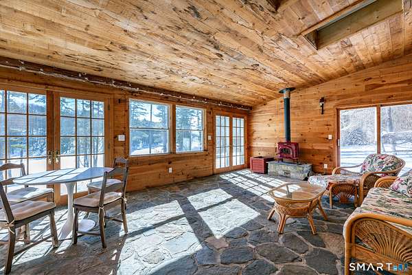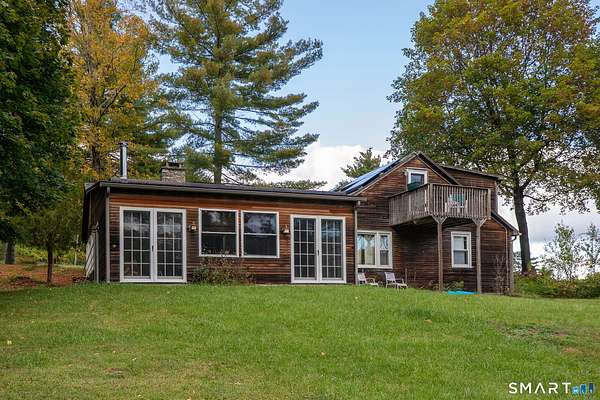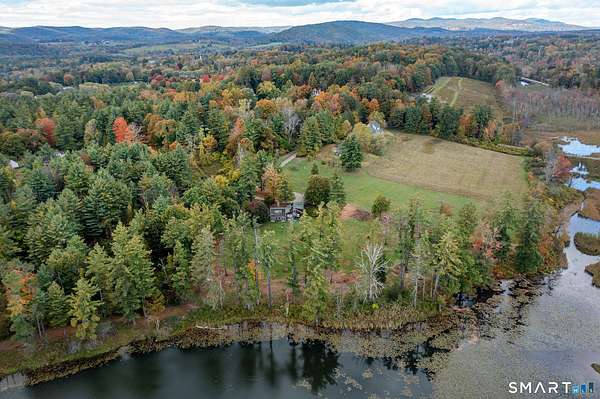 Amazing opportunity just outside Sharon's village center with truly spectacular pond views. Perched above the water, the existing two-bedroom cottage features a vaulted living room with fireplace, a home office, a first-floor bedroom and full bath, and an upstairs primary suite with private bath and a balcony that takes in the scenery. Off the living room, a spacious rustic sunroom with a stone floor and woodstove offers a cozy, light-filled place to relax while enjoying the setting. The home offers the next owner a chance to personalize and update to their taste or to reimagine the property with a new build. A separate post-and-beam barn includes a two-car garage and a recently updated studio apartment above. Set on 3.6 private acres, the property is approached by a private driveway and sits well back from the road for added privacy.