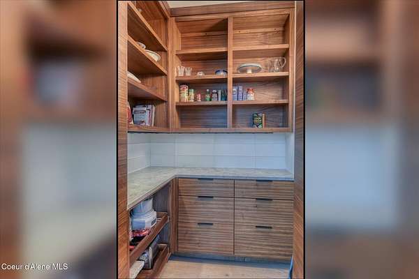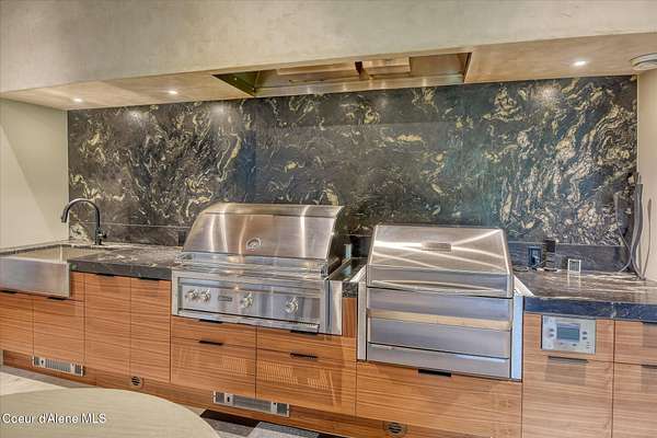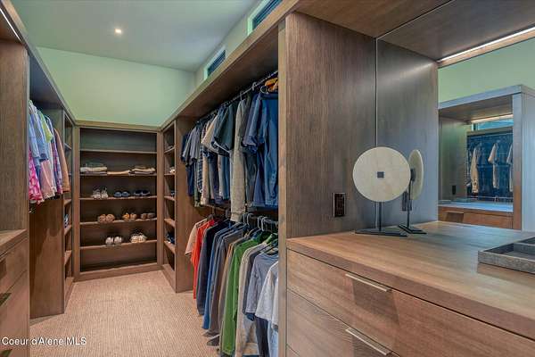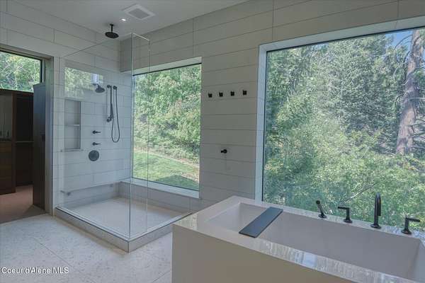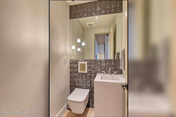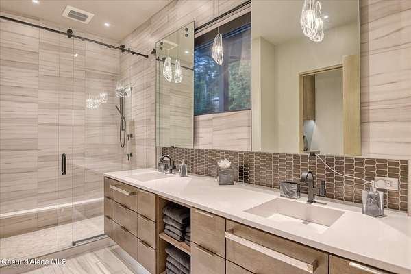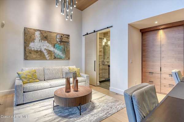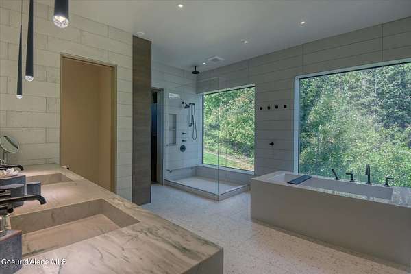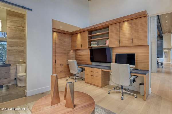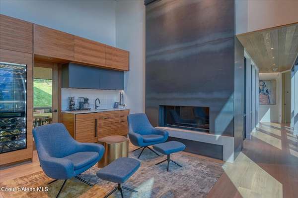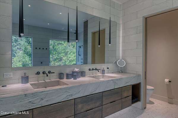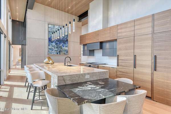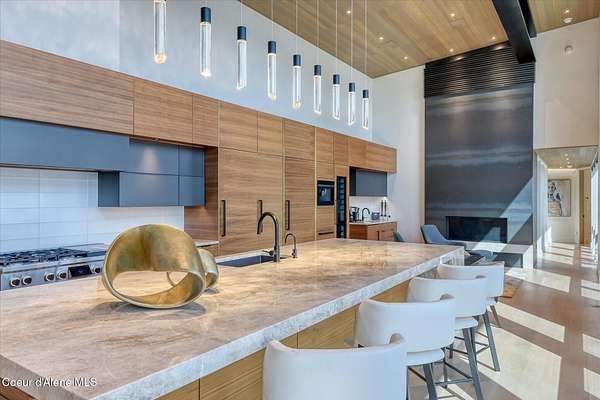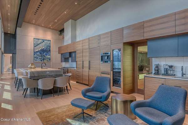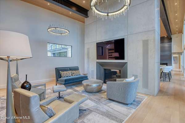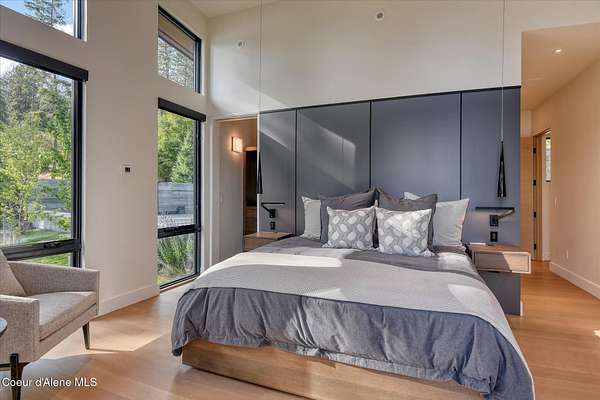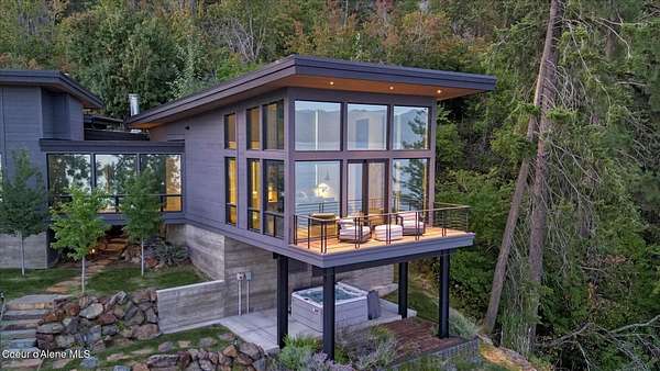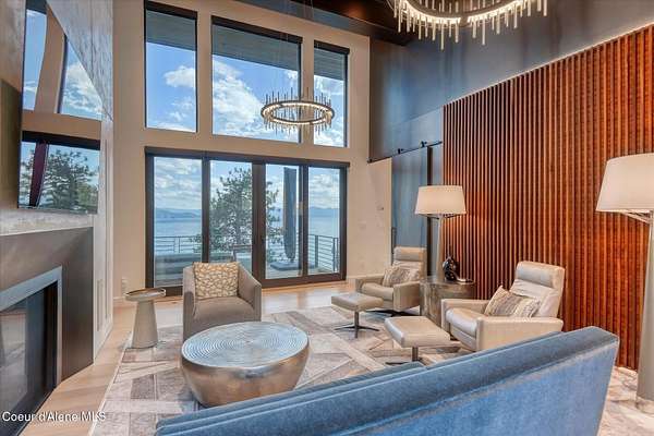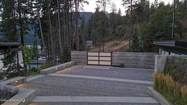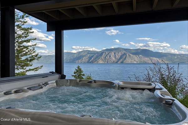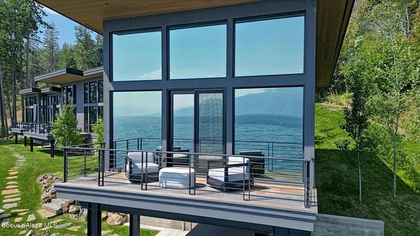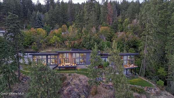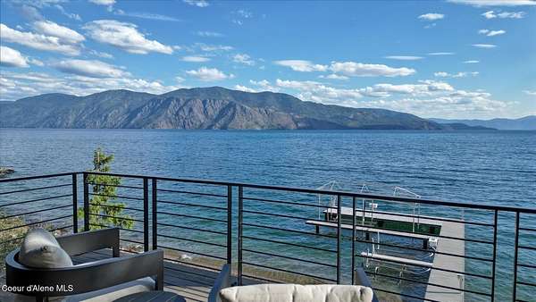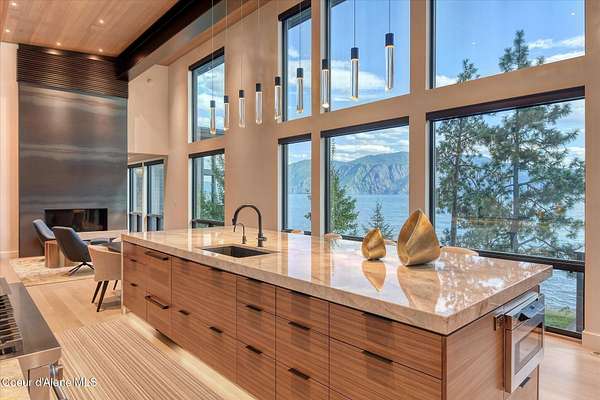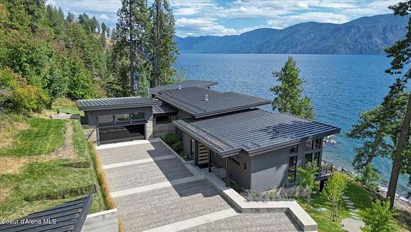 This modern masterpiece provides exceptional privacy within a gated 2+ acre setting, boasting 433' of pristine shoreline. This exceptional home is a one-of-a-kind blend of architectural excellence and bespoke design. Every detail has been thoughtfully curated by the renowned Uptic Studios, with custom finishes throughout and spectacular views of Lake Pend Oreille and the Green Monarchs from every room. Step inside and you're immediately greeted by a seamless fusion of luxury and functionality in the living room with an ornate fireplace and floor to ceiling windows showcasing coveted North Idaho scenery. The heart of the home is a gourmet kitchen designed for both everyday living and the hearth room to enjoy sophisticated entertaining. Highlights include custom Walnut cabinetry, a walk-in butler's pantry, gourmet-grade appliances, built-in espresso machine, wet bar with an undercounter refrigerator and ice maker, and polished quartzite countertops. Just beyond, an enclosed 4-season lounge that features a Lynx grill and Memphis pellet smoker, commercial-grade hood fan, wood burning fireplace and direct access to the outdoors - perfect for year-round culinary creativity. An elevated walkway leads you to the primary suite, an architectural showpiece with exposed steel beams, a private balcony, and a custom built-in bed with matching nightstands. The spa-like master bath is a sanctuary of natural light and organic textures, with limestone walls, a soaking tub, dual sinks, a walk-in shower, and an expansive walk-in closet. Two additional guest suites, each with their own private bathrooms, provide luxury and privacy for family or visitors. The oversized laundry room is both beautiful and practical, offering abundant storage, folding space, and built-in drying racks. Step outside to enjoy your own private pebble beach, a deep-water dock with a boat lift and twin jet ski lifts, plus a fully equipped outdoor pavilion - everything you need to make the most of lakefront living. This is more than a home. It's a lifestyle defined by custom luxury, bold design, and the natural beauty of Garfield Bay.