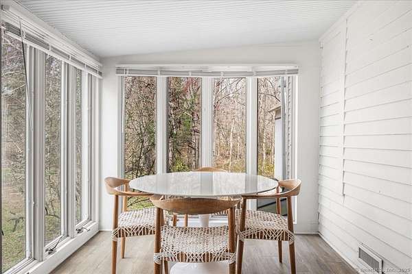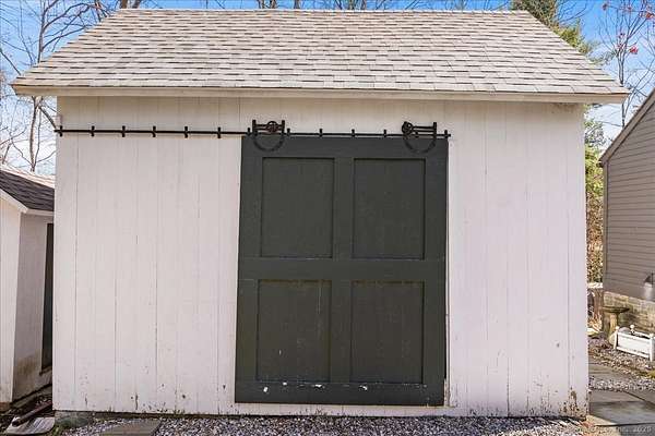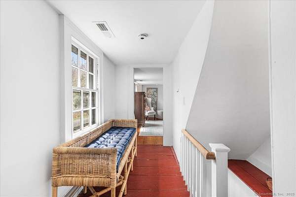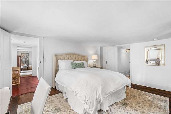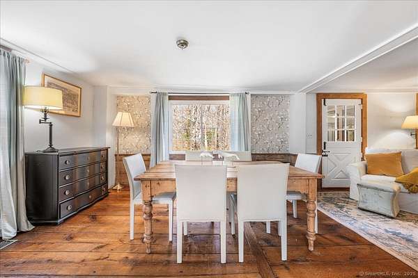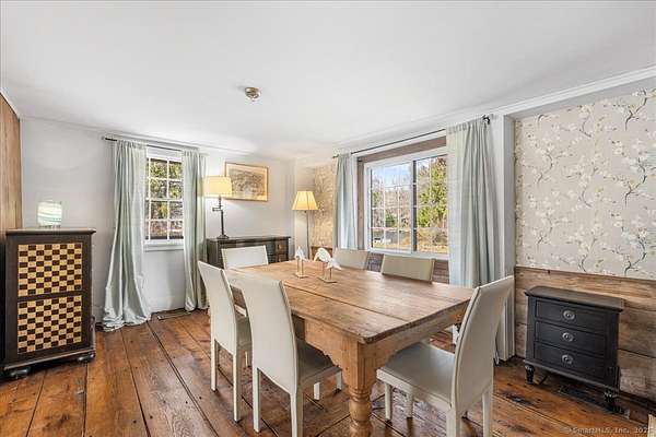 The Parker Bull House, circa 1754 located in Ivoryton overlooking the Falls River, this stately home is a unique blend of original antique features with updated modern amenities. The large sunny kitchen has granite countertops and stainless-steel appliances, hardwood floors, and is adjacent to a spacious pantry/laundry room, heated sunroom, and a covered porch. The living room has a large fireplace and antique wide board floors, leading to a formal dining room with another fireplace and beehive oven. A parlor serves as a comfortable family room, and there is also a powder room on the first floor. Upstairs, the primary bedroom includes a wood-floored bath with a glass shower, plus two additional bedrooms and another updated bathroom. A large attic has plenty of room for storage, and a back staircase leads to the kitchen. The property also includes a 3-bay garage, outbuilding, and original outhouse on 1.6 acres. This home is next to Prive Swiss and across the street from Copper Beech Inn