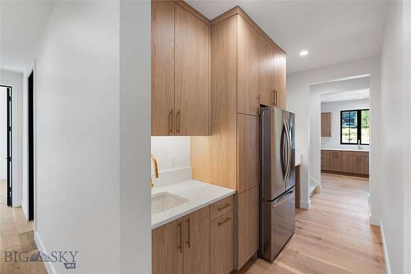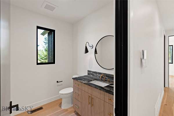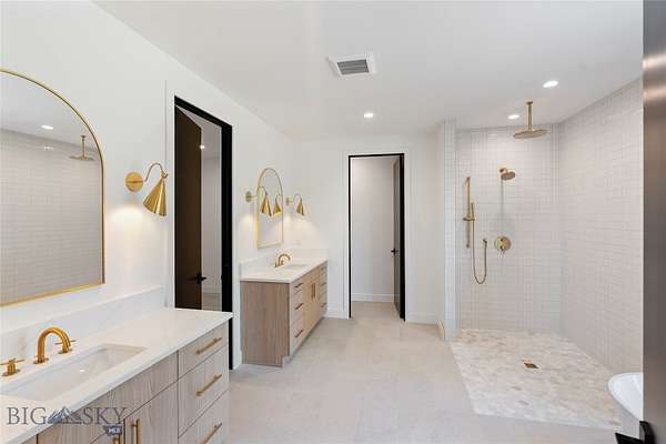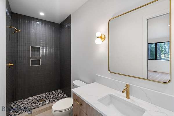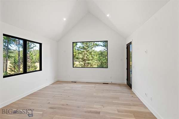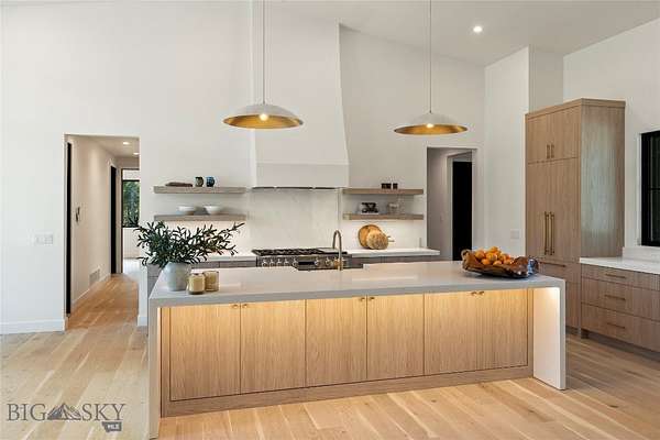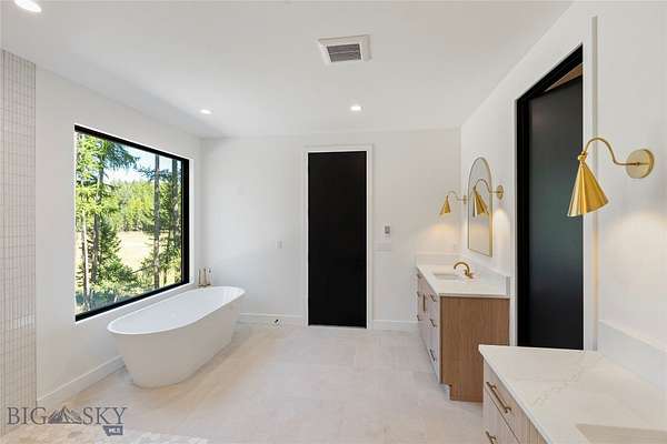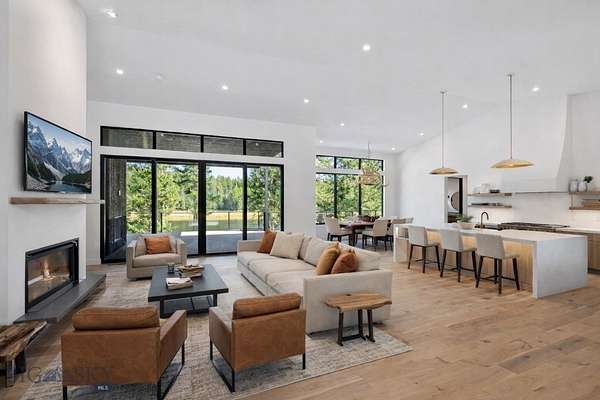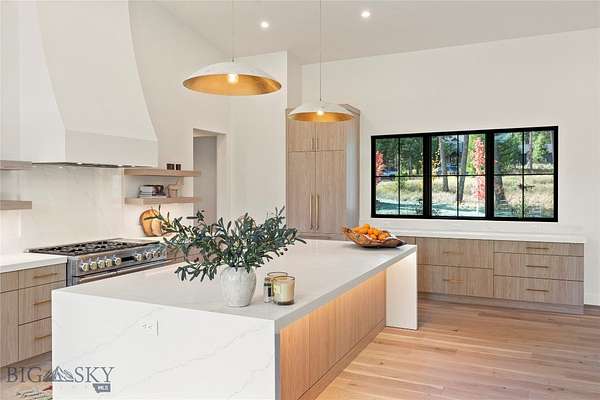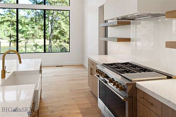 Located in the sought-after Whitefish Hills Village, this newly completed custom home offers a refined blend of modern design, privacy, and natural beauty. Set on 2.24 peaceful acres at the end of a quiet cul-de-sac, the 6-bedroom, 4.5-bath residence spans 3,867 square feet and is thoughtfully designed for both elevated entertaining and everyday living. Surrounded by mature trees, open meadow, and a tranquil pond, the home captures expansive views and a true sense of retreat. Inside, light-filled interiors feature high ceilings, engineered white oak hardwood flooring, and a seamless open-concept layout that balances warmth with contemporary elegance. The main living space is anchored by a gas fireplace with a reclaimed white oak mantel and flows effortlessly into a chef's kitchen equipped with a 48" Monogram gas range with six burners and griddle, paneled Monogram refrigerator and freezer, paneled dishwasher, built-in microwave, open shelving, Calacatta Lux double-thick quartz countertops, and an oversized waterfall island. A fully appointed butler's pantry includes a secondary refrigerator, sink, wine fridge, and ample storage-ideal for entertaining. Large glass doors extend the living area outdoors to a nearly 800-square-foot upper deck, creating a seamless indoor-outdoor experience with views of the surrounding landscape and pond. The primary suite serves as a private sanctuary with heated bathroom floors, a freestanding soaking tub, and a spacious Glazzio porcelain-tiled shower with multiple Grohe showerheads. All bathrooms feature Glazzio porcelain tile, each with a unique palette while maintaining cohesive design throughout (glass enclosures currently being installed). Four of the six bedrooms include ensuite baths, with the remaining two sharing a Jack-and-Jill bathroom. A spacious laundry room near the garage offers double washers and dryers, additional sink, and generous storage. The upper level includes two flexible bonus rooms-one with a private bath-providing options for a media room, office, gym, guest suite, or secondary primary retreat. Offering privacy, thoughtful design, and a setting that celebrates Montana living, this Whitefish Hills Village home presents a rare opportunity to own a refined and timeless retreat.