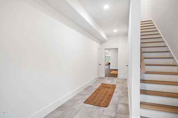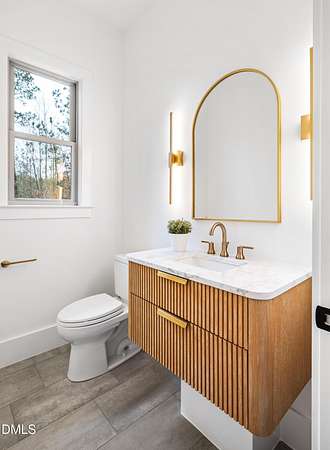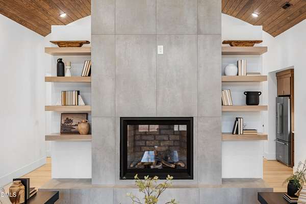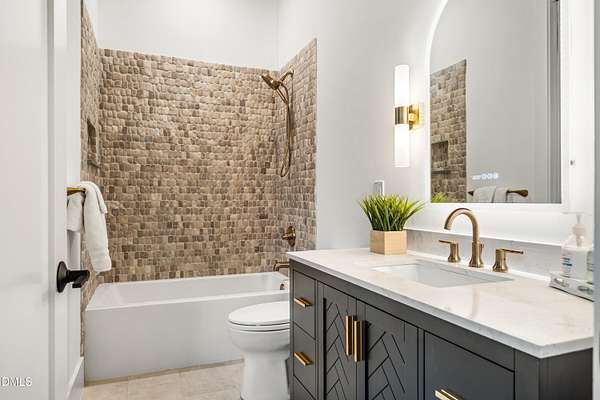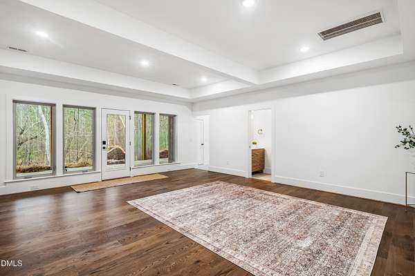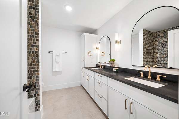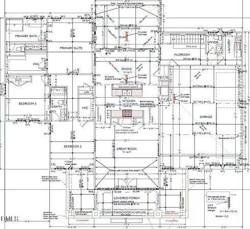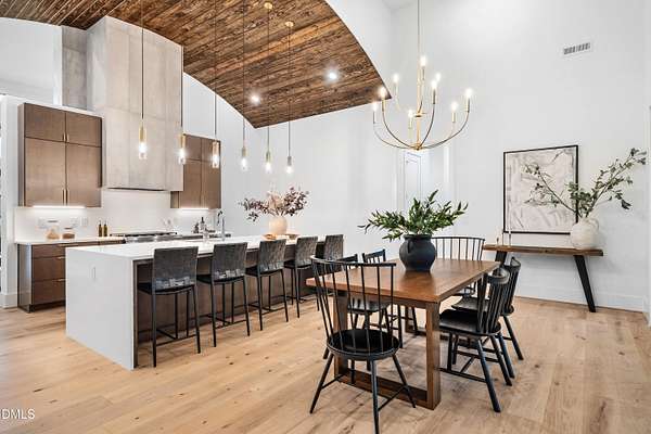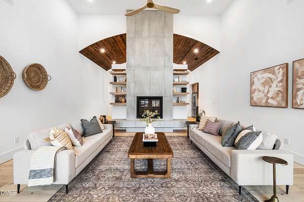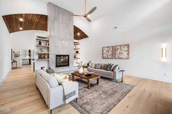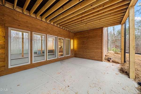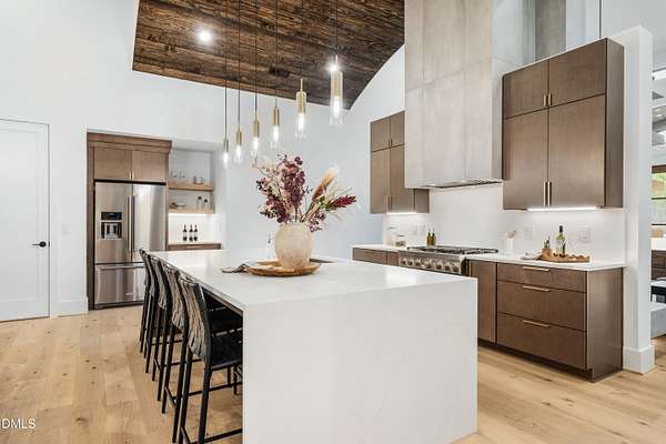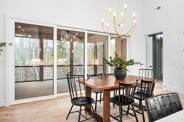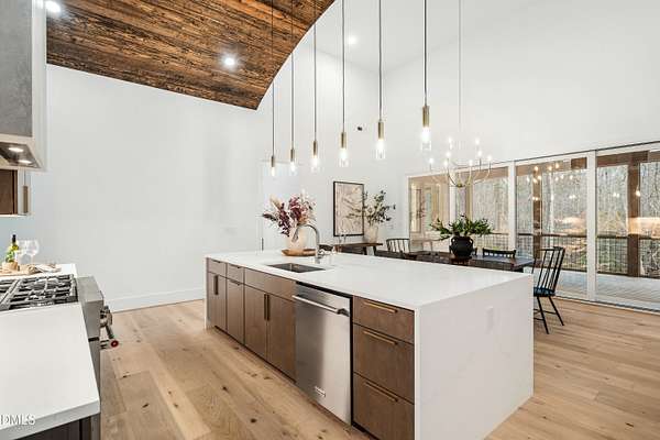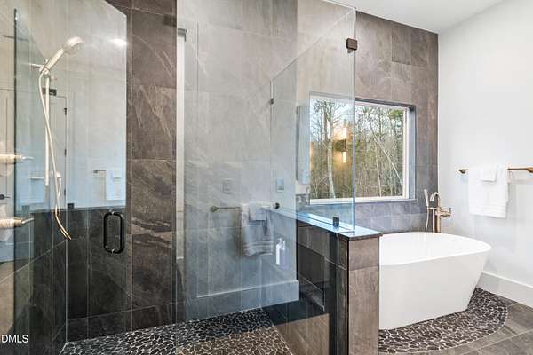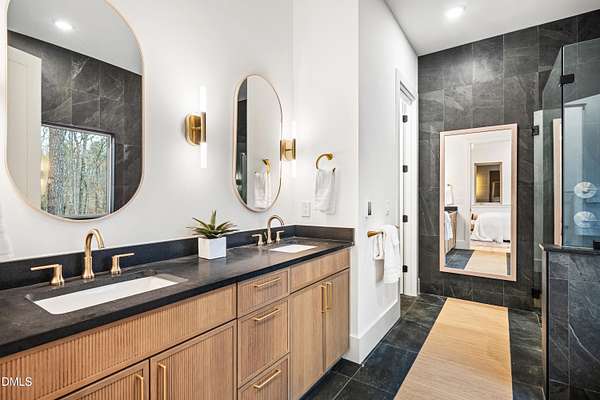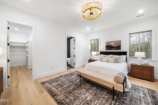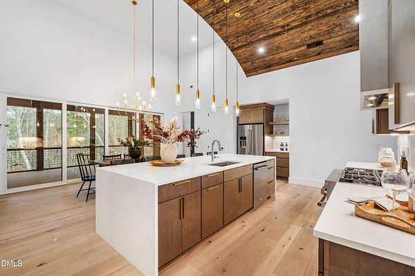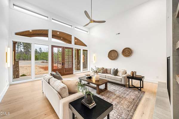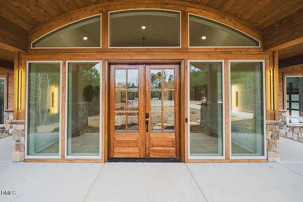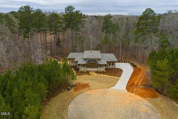 Modern rustic home offering one-level living with open, light-filled spaces. Stone and cedar exterior with a wrap-around covered porch and tapered stone columns. Floor-to-ceiling windows highlight the great room with 16-foot ceilings and gas fireplace. Gourmet kitchen features a 10-foot waterfall island and a slider opening to a screened porch with wooded views. Main level includes three bedrooms, including a primary suite with walk-in closet and spa-style bath. Two additional bedrooms share a Jack-and-Jill bath. Mudroom, powder room, and laundry connect to the 3-car garage. Daylight basement offers flexible living with a rec room, full kitchen, living area, and a fourth bedroom with en-suite bath-ideal for guests or in-law suite. Situated on a partially wooded 3.5-acre cul-de-sac lot with a creek, just 10 minutes from downtown Chapel Hill. AGENTS: See Private Remarks.