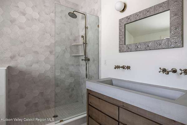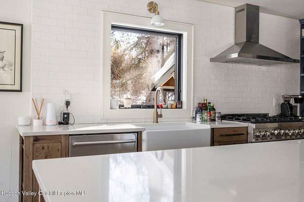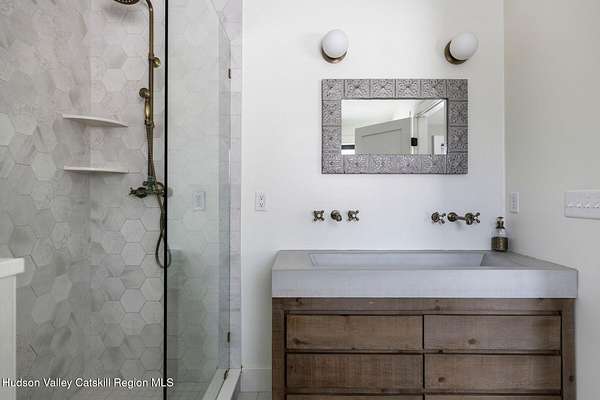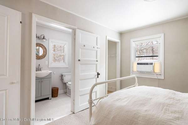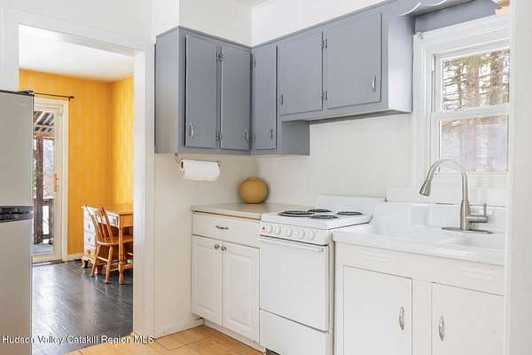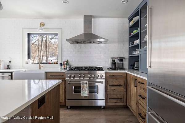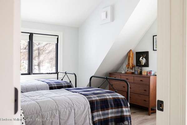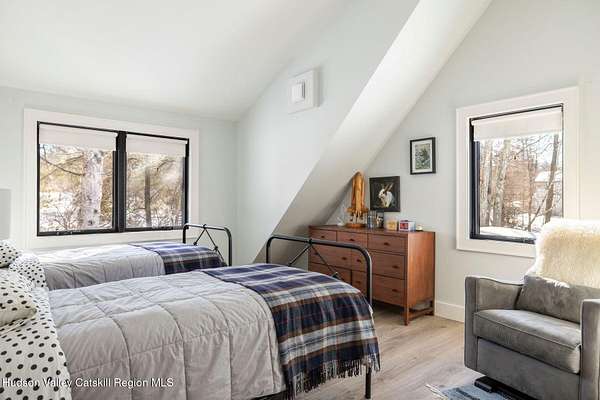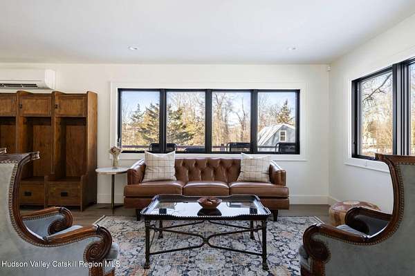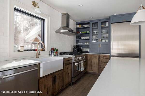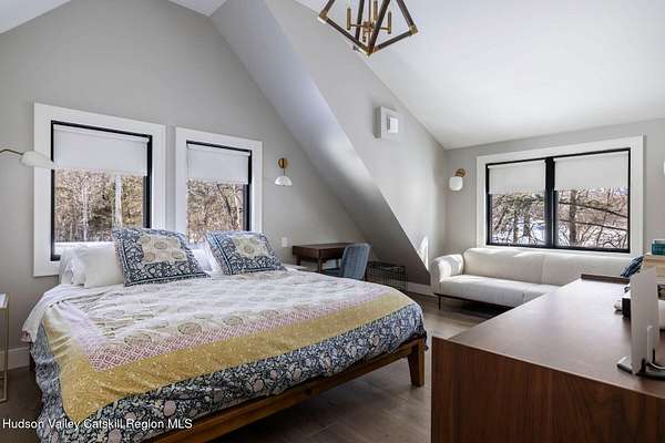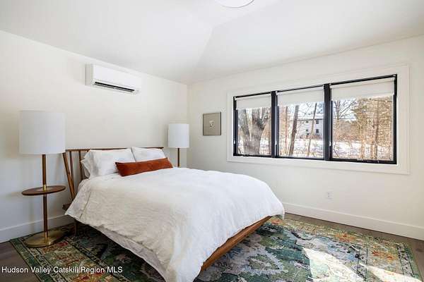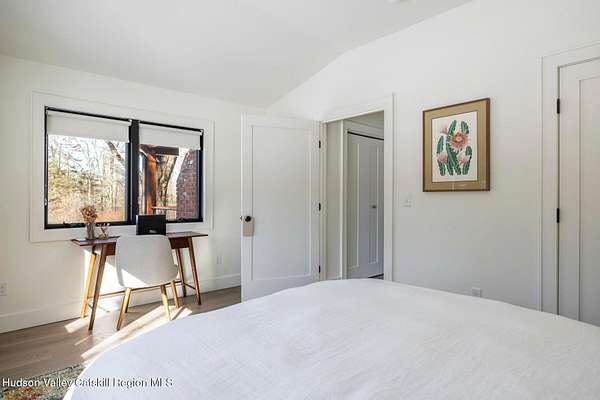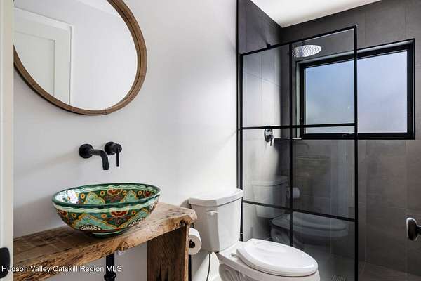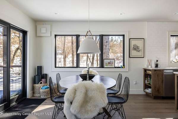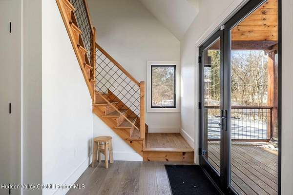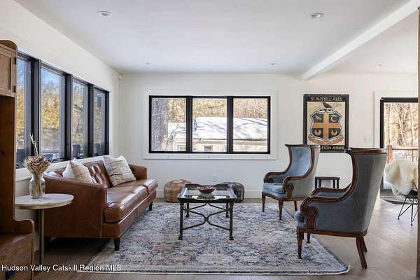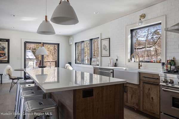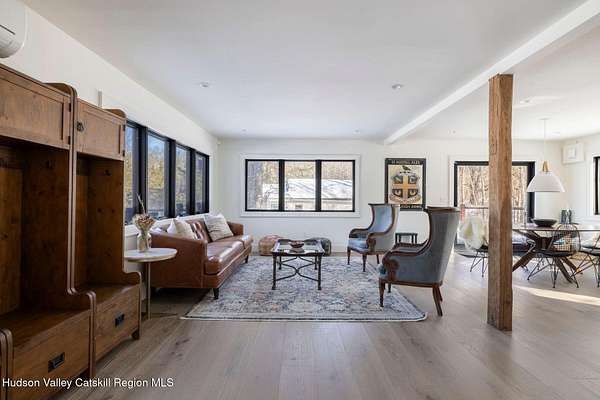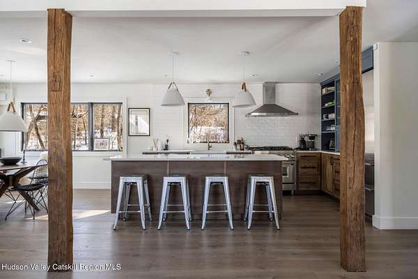 Shivertown Modern is a stunningly renovated home that blends modern comfort with Hudson Valley character and breathtaking scenery. Light wood floors flow throughout an open floor plan highlighted by exposed beams and a large center island that anchors the kitchen. Cooking is a pleasure with a ZLINE six-burner gas range, a massive Liebherr refrigerator, quartz countertops, and an under-mount sink, all perfectly suited for everyday living and entertaining. The main level offers the ease of a first-floor bedroom and full bath. Upstairs, the second floor features two spacious bedrooms and two full bathrooms, including a private en suite, creating a comfortable and well-designed retreat. The finished walkout lower level adds even more flexibility with striking terrazzo floors, a dedicated laundry room, and space ideal for guests, work, or recreation. Outside, enjoy quiet mornings on the front porch complete with lounge chairs, or take advantage of the oversized detached shed for storage and hobbies. A legal 500 square foot accessory dwelling, a 1940's cottage, adds exceptional value and versatility, offering its own deck, eat-in kitchen, living room, bedroom, and full bathroom, ideal for guests or rental income. The property is sited on 1.7 acres, perfectly positioned to capture seasonal views of the Shawangunk Mountains. Just a few minutes' drive brings you to the vibrant Village of New Paltz, with its unique shops, galleries, and coveted restaurants, as well as the SUNY New Paltz campus. Outdoor enthusiasts will enjoy easy access to the nearby Rail Trail. Shivertown Modern is Hudson Valley living at its finest. Schedule your private tour today. A 3D Walkthrough Tour is available in the digital Lookbook or by request.