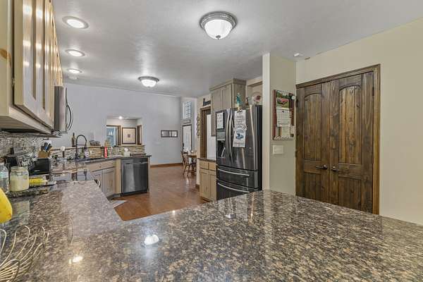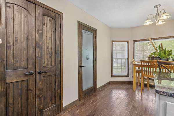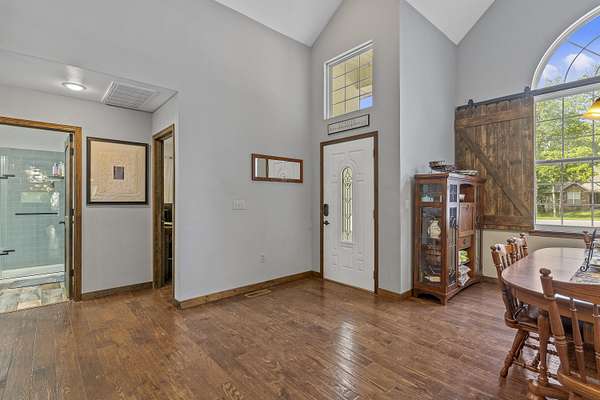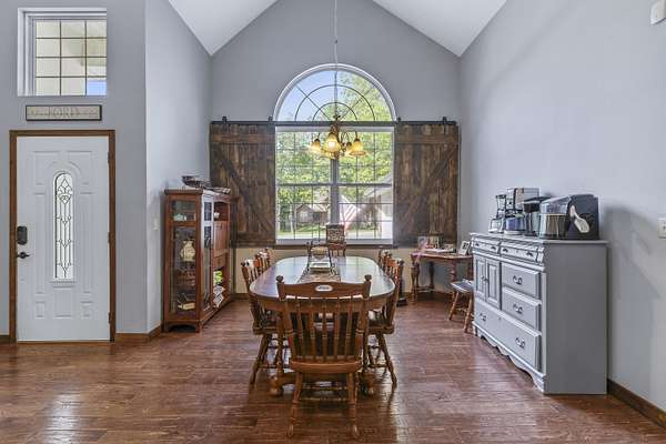 This is an amazing home in Strafford!! Home sits on over 3.5 acres with mature trees that makes for a fantasic private setting. You enter the home and are greeted by a fantastic open concept floor plan wth soaring cathedral ceilings! In this area you have a huge formal dining area, large living room with a gas log fireplace, hand scraped hardwood floors and an amazing completely remodeled kitchen with custom built cabinets double oven range, large walk in pantry, eat-at bar, breakfast area and beautiful granite counter tops. You will love the huge laundry room with built in coat and shoe storage, laundry sink with granite counters. Home has 5 bedrooms and 3 full bathrooms. Basement has a huge open area with huge family room area, wet bar with a granite counter, recreation area and plenty of room for your exercise equipment. Basement has a large bedroom and full bath. What a fantastic shop that measures 30 x 50 feet with 16 foot doors and the car lift is staying! Outside is a huge deck and a covered screened in patio are with a hot tub that is staying. One bedroom is non-conforming as it has no closet.