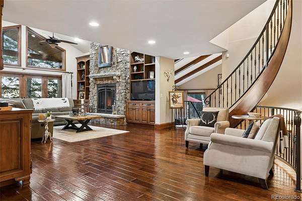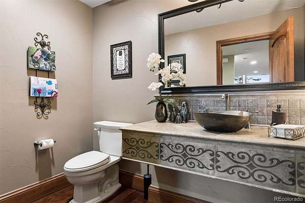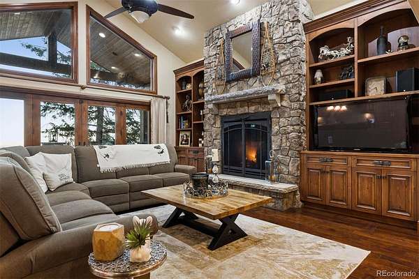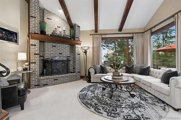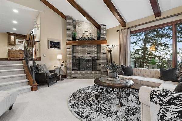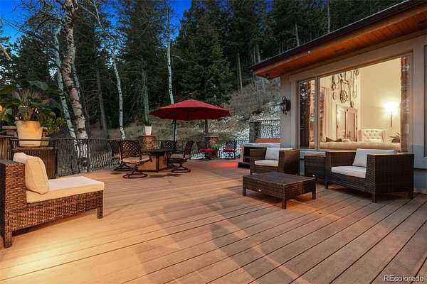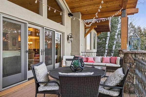 Welcome to a home that makes you cancel plans because honestly, why would you ever want to leave? Tucked among pine and aspen trees in West Ranch, this completely remodeled retreat offers a blend of privacy, views, and thoughtful design. Pass through the gate and the world quiets down. The kitchen is the kind that inspires long dinners, second bottles of wine, and friends lingering long after dessert. The kitchen flows effortlessly into the open family room where a striking stone fireplace with dramatic steel doors sets the tone for cozy winter evenings. Throw open the double doors and step onto the covered deck where city lights twinkle below and open space meadow views stretch out in front of you. Stairs lead down to an expansive entertaining deck ideal for summer dinners, barbecues, and outdoor gatherings. Just a few steps down from the main living area, a warm sitting room with wood-burning fireplace and large windows offers a quiet retreat surrounded by trees. A private main-level guest suite with deck access and full bath provides comfortable accommodations for visitors. The main floor also includes a powder bath, spacious laundry and mudroom, and access to the oversized four-car garage featuring built-in cabinetry, extensive storage, and granite work surfaces. Upstairs, the primary suite feels like a boutique retreat with a private balcony overlooking city lights, a spa-inspired bath, and a generous walk-in closet. 2 additional bedroom suites each offer private baths and walk-in closets. A large multipurpose room provides flexible space for a home gym, office, studio, or potential multigenerational living with garage access. The lower level “fun zone” includes a wet bar with beverage cooler, spacious rec room, and walkout patio perfect for game nights and gatherings. Outside, a private hiking trail just steps from the deck and easy access to Morrison, Denver, and the Front Range, this home offers the perfect balance of mountain serenity and city convenience.
