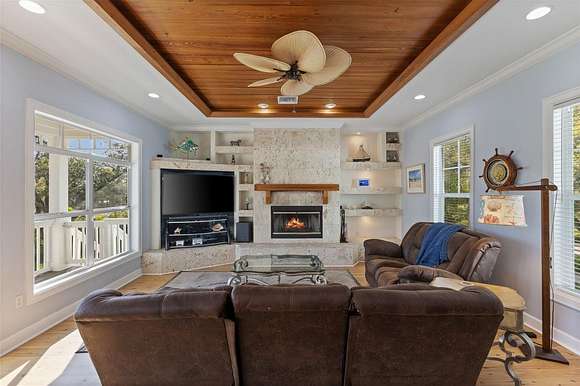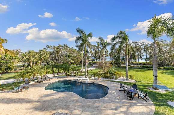 If you've been dreaming of a south facing bayfront home that embodies the laid-back luxury and tropical charm of a Tommy Bahama resort, your search ends here. Welcome to 450 Bayshore Drive, a breathtaking 3-acre bayfront estate nestled in the historic and coveted Terra Ceia Island. The expansive yard has room for tennis and pickleball courts or acreage for a barn and horses. This property offers unparalleled serenity, luxury, and direct access to the Gulf, creating a lifestyle of endless possibilities. This home, built like a fortress, is always prepared and equipped with a gas Generac standby generator. As you drive through the artisan-crafted entry and along the winding driveway through the electronic gate, you'll be greeted by gracefully swaying mature palms and the tranquil beauty of this private oasis. This estate is a boater's paradise, featuring a 600-foot dock on the bay with direct access to the Gulf, two new boat lifts (20,000-lb and 30,000-lb) with moorage for a sailboat or yacht, and a freshwater lake to the rear. Terra Ceia is an aquatic preserve, teeming with redfish, snook, and more, making it a fisherman's haven. The home itself is a work of art, designed to capture breathtaking sunrises and sunsets, sparkling water views, and tropical breezes from all three levels. Inside, you'll find wide-plank pine wood flooring, cypress inlaid ceilings and trays, crown molding, and custom cypress wine closets. Unique lighting crafted by a local artist adds a touch of artistry to every room, while a striking coral fireplace highlights the open living area, creating a warm and inviting ambiance. The chef's kitchen is a culinary dream, featuring European cabinetry, granite countertops, a center island, and top-of-the-line appliances. Large seperate windowed pantry and separate wine room enhances the opportunity for entertaining and the finer things in life. Retreat to the luxurious master suite, which includes a private sitting area with a two-sided coral fireplace, a spa-like master bath, and a large custom walk-in closet. The versatile first level offers endless possibilities, perfect for recreation, a media room, or even a potential in-law suite. Step outside to your own private tropical resort, where a stunning lagoon-style pool with a rock waterfall takes center stage. The poolside tiki bar, equipped with a TV, gas grill, and beer tap, is the ultimate spot for entertaining or relaxing. An outdoor kitchen off the main floor living area features a gas grill and beer tap, making alfresco dining effortless. Unwind in the hot tub while soaking in the panoramic waterviews, or stay active in your spacious private gym. For car enthusiasts, this property is a dream come true. The attached 4-car garage includes a separate golf cart garage bay, while the newly constructed additional detached garage provides a total of 9 garaged parking spots, a workshop area with a beer tap, and a double-height central bay for large vehicles. This space offers ample room for lifts, toys, and all your automotive passions. Located just minutes from I-75, St. Petersburg, Sarasota (SRQ), and Tampa (TPA), this home offers both privacy and convenience. Whether you're boating on the bay, hosting gatherings by the pool, under the cool shade of the majestic mature live oak, or simply enjoying the tranquility of your private estate, this home offers everything you've ever dreamed of and more. Don't miss this rare opportunity to own a piece of paradise in Terra Ceia.