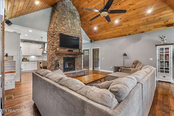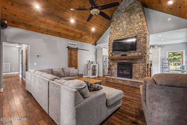 Charming Rural Farmhouse Retreat with Modern Comforts- 3BR/2BA with 2 fireplaces. Welcome to your dream farmhouse-a perfect blend of rustic charm and modern luxury. This stunning 3 -bedroom, 2 bath home offers an inviting open floor plan with thoughtful details and abundant natural light throughout. Step inside to find gorgeous stacked-stone fireplace with an enclosed wood heater in the great room that creates a warm cozy centerpiece for family gatherings. The spacious kitchen features quartz countertops, a large island with eat-in bar, barn doors, and a walk-in-pantry-perfect for the home chef. A formal dining room offers space for special occasions, while all bedrooms are conveniently located on one level for easy living. Bonus spaces abound-including a 1,400 sq ft ''man cave'' or recreation room complete with a wet bar, refrigerator, another fireplace and updated appliances. There's storage galore throughout the home, giving you room to spread out and stay organized. Enjoy your morning coffee on the covered front porch overlooking a beautifully manicured lawn, or unwind on the back deck surrounded by the peace and beauty of the countryside. This lovely rural setting offers space for gardening, outdoor entertaining, and wildlife watching, all while providing the comfort and convenience of a thoughtfully designed farmhouse. A must-see to truly appreciate, this property has it all-comfort, craftsmanship, and countryside charm. Schedule your private tour today and experience farmhouse living at its finest.